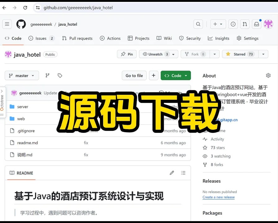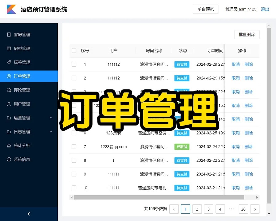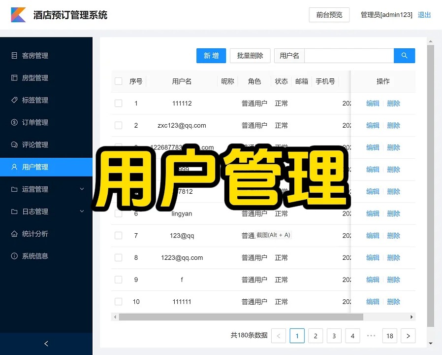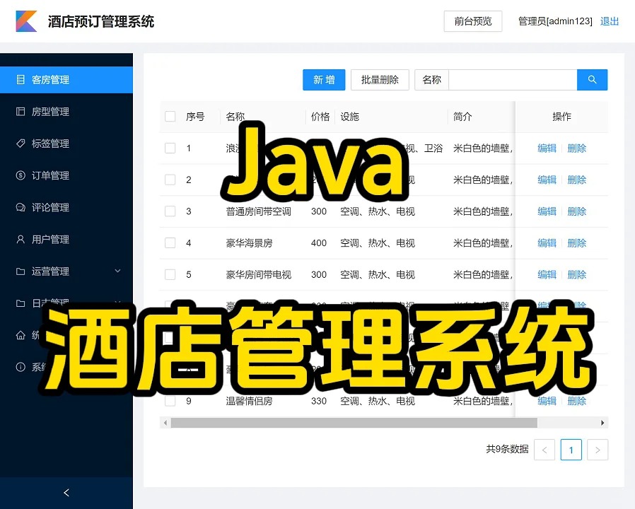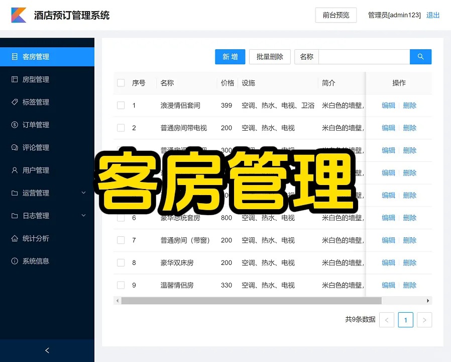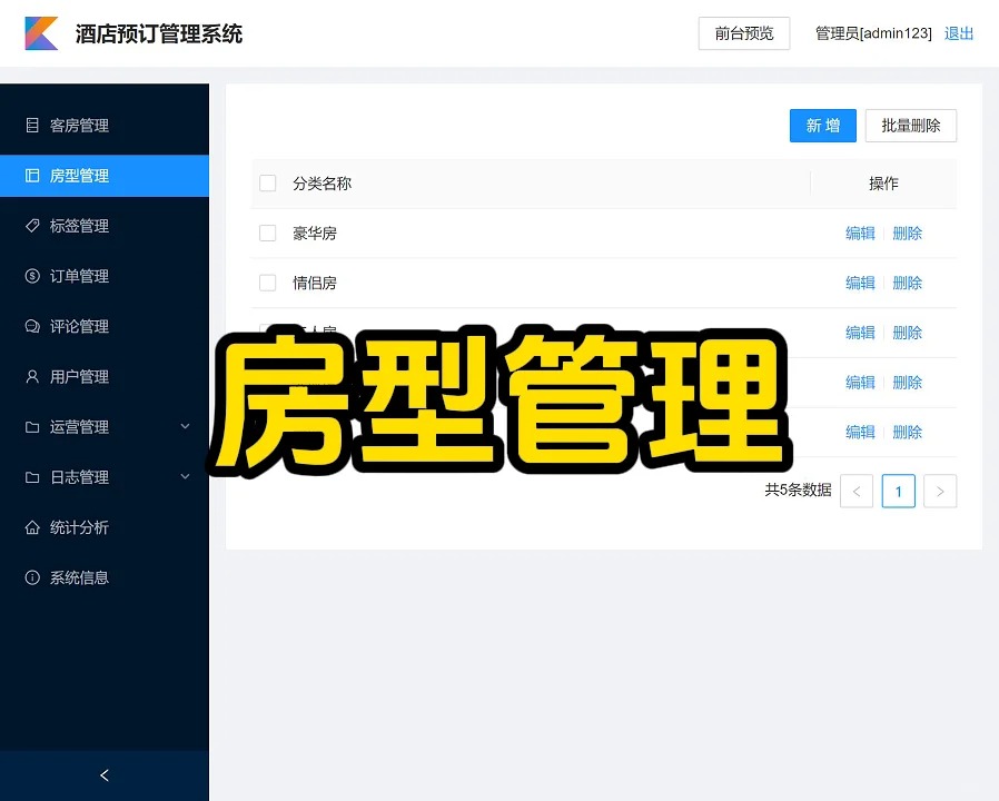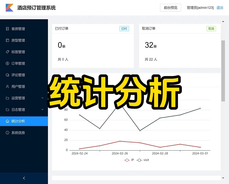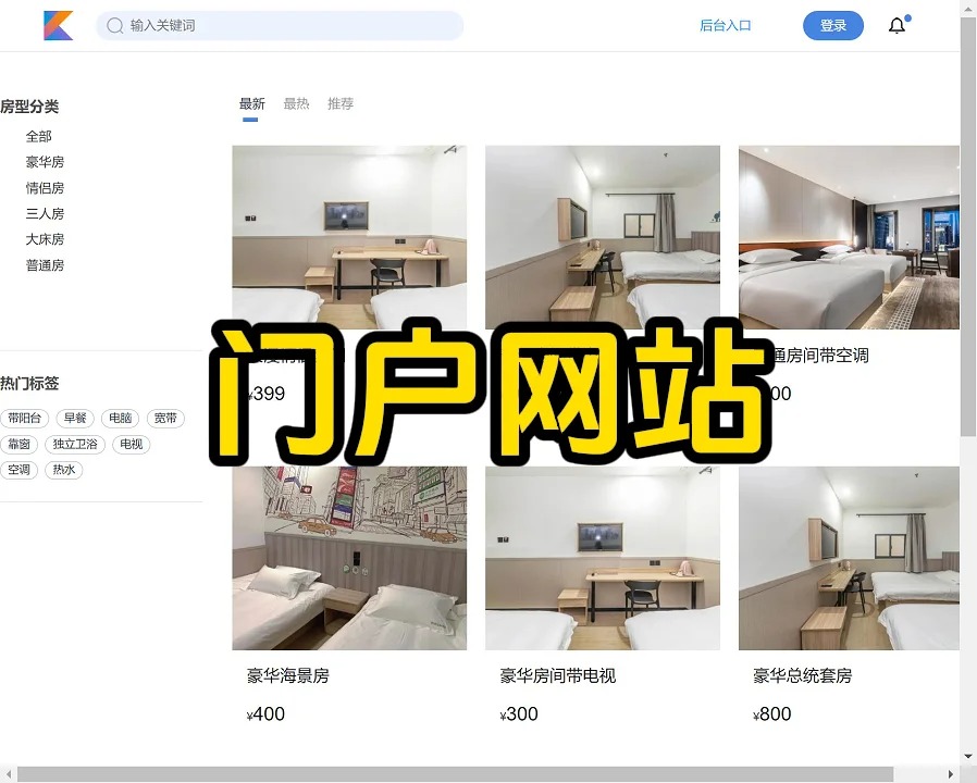 后臺的主要功能: - 房間管理:管理系統(tǒng)可以錄入、修改和查詢房間的基本信息,如房間名稱、配套、備注等。 - 類型管理:系統(tǒng)可以管理房間的類型信息,包括類型的名稱等。 - 標簽管理:管理標簽錄入、修改和查詢標簽的信息。 - 評論管理:管理和瀏覽整個網(wǎng)站的評論信息。 - 用戶管理:管理和瀏覽網(wǎng)站的用戶信息,可以新增、編輯和刪除用戶。 - 訂單管理:管理和瀏覽網(wǎng)站的訂單信息。 - 統(tǒng)計分析:系統(tǒng)可以根據(jù)房間的活動數(shù)據(jù)和會員參與度進行統(tǒng)計和分析,幫助管理員了解整個系統(tǒng)的狀況。 - 消息管理:房間管理員可以在系統(tǒng)上發(fā)布消息,整個網(wǎng)站的用戶都能收到。 - 系統(tǒng)信息:管理員可以查看系統(tǒng)的基本信息,包括系統(tǒng)名稱、服務(wù)器信息、內(nèi)存信息、cpu信息、軟件信息等。 前臺的主要功能: - 注冊登錄:用戶通過注冊和登錄后,才能使用網(wǎng)站。 - 門戶瀏覽:用戶進入首頁后,可以瀏覽房間列表信息,包括最新、最熱、推薦。 - 智能推薦:詳情頁右側(cè)的熱門推薦。 - 用戶中心:包括用戶基本資料修改、用戶郵箱推送、消息。 - 我的訂單:包括我預(yù)訂的房間的信息。 - 模糊搜索:頂部搜索功能,支持模糊搜索房間信息。 - 房間評論:詳情頁下側(cè)用戶可以評論房間。 ## 開發(fā)環(huán)境 - 后端: Java 1.8 + SpringBoot + MyBatis - 前端: Javascript + Vue - 數(shù)據(jù)庫:MySQL 5.7 - 開發(fā)平臺:Idea 2021 + vscode - 運行環(huán)境:Windows 10/11 ## 關(guān)鍵技術(shù) - 前端技術(shù)棧 ES6、vue、vuex、vue-router、vue-cli、axios、antd - 后端技術(shù)棧 SpringBoot、MyBatis、Maven