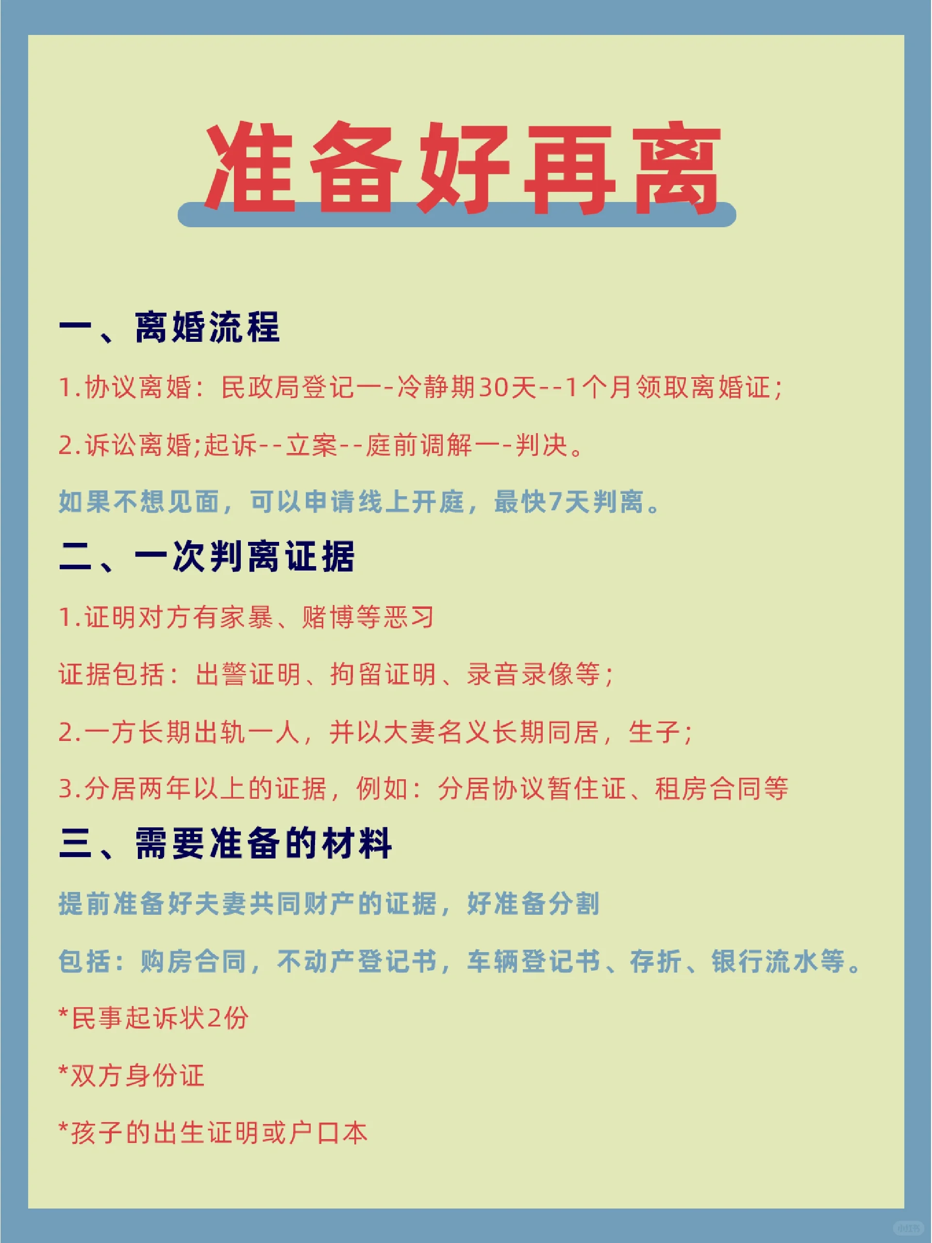 作為一名有著12年從業(yè)經驗的離婚律師,我見過太多的人,一記耳光就決定離婚,但由于準備不足,他們已經“離開”,不僅沒有做到,還給了對方傷害自己的機會。 今天,我從一個專業(yè)律師的角度,真誠地給大家提幾點建議。做好這四件事的準備,不僅可以更好的維權,還可以更快的離婚。 1、 離婚程序 1.約定離婚:民政局登記冷靜期為30天至1個月,領取離婚證; 2.訴訟離婚:訴訟一-立案-庭前調解-判決。 (如果你不想見面,你可以申請在線庭審,最長假期為7天。) 2、 對證據的一次性判斷 1、證明對方有家庭暴力、賭博等不良習慣,證據包括:報警單、拘留證明、錄音錄像等; 2、一方與一人長期不忠,并以長妻名義同居,生育子女; 3.分居兩年以上的證據,如臨時分居協議證明、租房合同等 3、 需要準備的材料 提前準備好夫妻共同財產的證據,為分割做準備,包括:購房合同、不動產登記、車輛登記、存折、銀行對賬單等。 1.兩起民事訴訟 2.雙方身份證 3.孩子的出生證明或戶口本 4、 爭取監(jiān)護權 1.證明自己對孩子的精力和享受充滿熱情的證據,如照片、視頻和其他與孩子有關的材料; (二)有能力撫養(yǎng)子女的證明,包括學費、興趣班、學習資料和其他費用的證明; 3.父母愿意代為照顧孩子的解釋。 要點: 第一次訴訟未判決或和解后,一般沒有新的情況或理由,原告在6個月內不能再次申請。