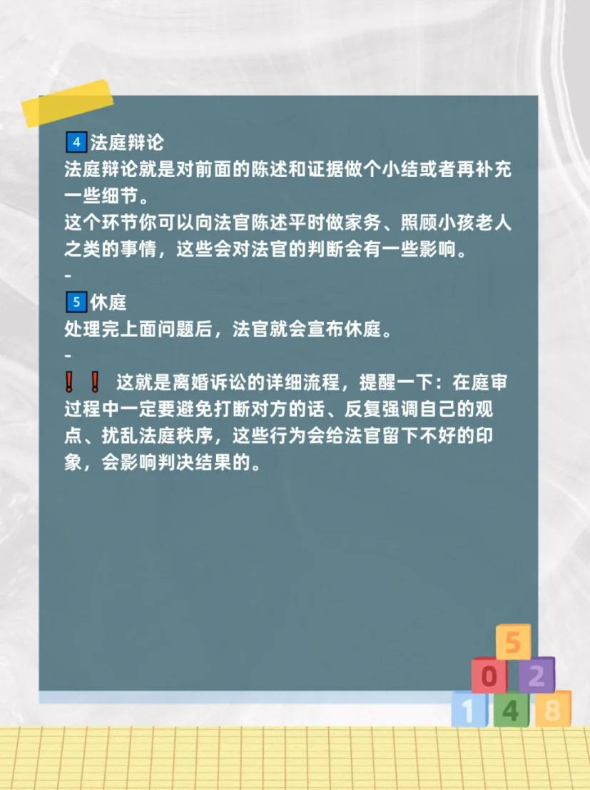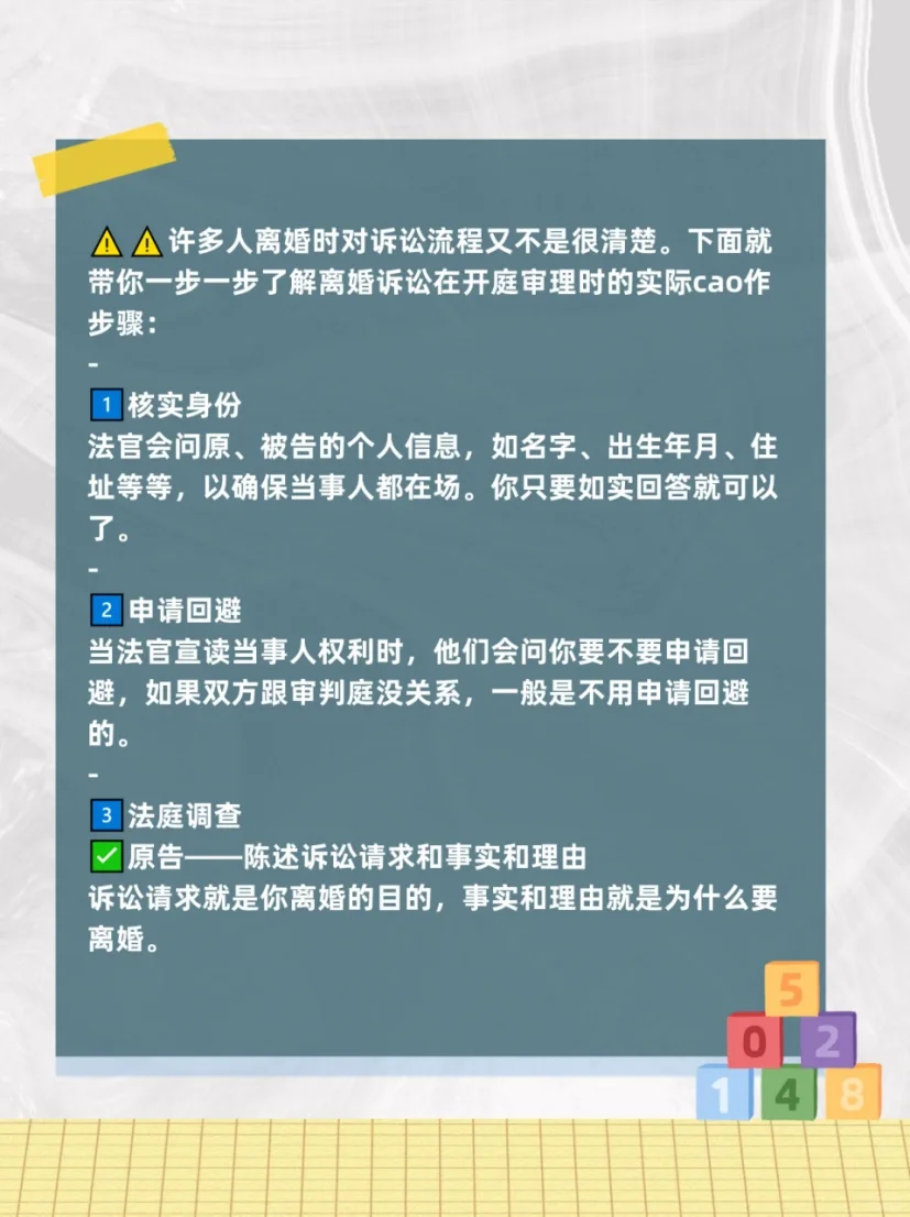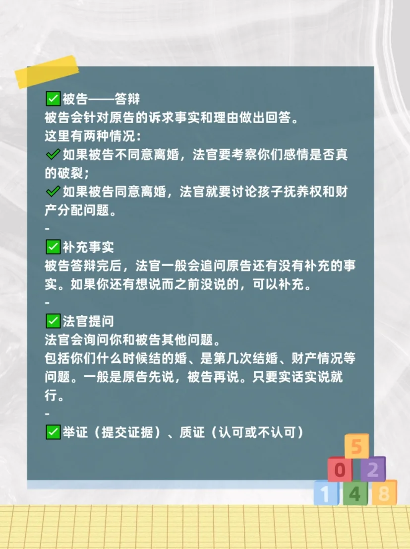 ? 許多人在離婚時對訴訟程序不是很清楚。下面,我們將帶您一步步了解離婚訴訟在審理過程中的實際步驟: - 一? 驗證身份 法官將詢問原告和被告的個人信息,如姓名、出生日期、地址等,以確保各方都在場。你只需要如實回答。 - 二? 申請回避 當(dāng)法官宣讀當(dāng)事人的權(quán)利時,他們會問你是否想申請回避。如果雙方都與審判法庭無關(guān),一般無需申請回避。 - 三? 法庭調(diào)查 ? 原告-陳述索賠、事實和訴訟理由 訴訟請求是你離婚的目的,事實和理由是你想要離婚的原因。 ?? 一般訴訟請求有三種: ? 雙方終止婚姻關(guān)系; ? 兒童監(jiān)護權(quán)的分配; ? 雙方財產(chǎn)分配。 - 根據(jù)法律規(guī)定,如果一方有重婚、與他人同居、家庭暴力、賭博、吸毒或分居兩年以上,則可以認定婚姻關(guān)系破裂。 ?? 原告在訴狀中表示,上述任何一種情況都有更高的離婚成功可能性。 - 此外,如果已經(jīng)提出離婚但不允許,并且雙方又分居一年,則應(yīng)通知法官注意這一點,這也是《民法典》規(guī)定的離婚理由。 - ? 被告-辯護 被告將回答原告索賠的事實和理由。 這里有兩種情況: ? 如果被告不同意離婚,法官將審查你們的關(guān)系是否真的破裂了; ? 如果被告同意離婚,法官將討論子女監(jiān)護權(quán)和財產(chǎn)分配問題。 - ? 補充事實 在被告辯護后,法官通常會詢問原告是否有其他事實。如果你還有什么想說的,你以前沒有提到過,你可以加上去。 - ? 法官提問 法官會問你和被告其他問題。 這包括你什么時候結(jié)婚、結(jié)婚多少次以及你的經(jīng)濟狀況等問題。一般來說,原告先發(fā)言,被告后發(fā)言。說實話。 - ? 證據(jù)出示(提交證據(jù))、質(zhì)證(批準(zhǔn)或不批準(zhǔn)) ? 原告應(yīng)當(dāng)出示證據(jù),被告應(yīng)當(dāng)對原告出示的證據(jù)逐一進行質(zhì)證。 ? 被告應(yīng)當(dāng)提供證據(jù),原告也應(yīng)當(dāng)依次對被告提供的證據(jù)進行質(zhì)證。 - 四? 法庭辯論 法庭辯論是對之前的陳述和證據(jù)進行總結(jié)或添加一些細節(jié)。 在本節(jié)中,你可以向法官陳述日常家務(wù)、照顧孩子和老人的情況,這些可能會對法官的判斷產(chǎn)生一些影響。 - 五? 裁決 在處理完上述問題后,法官將宣布休庭。 - ?? 這是離婚訴訟的詳細過程。提醒是避免打斷對方的話,避免重復(fù)強調(diào)自己的觀點,避免在審判過程中擾亂法庭秩序。這些行為會給法官留下不好的印象,影響判決結(jié)果。