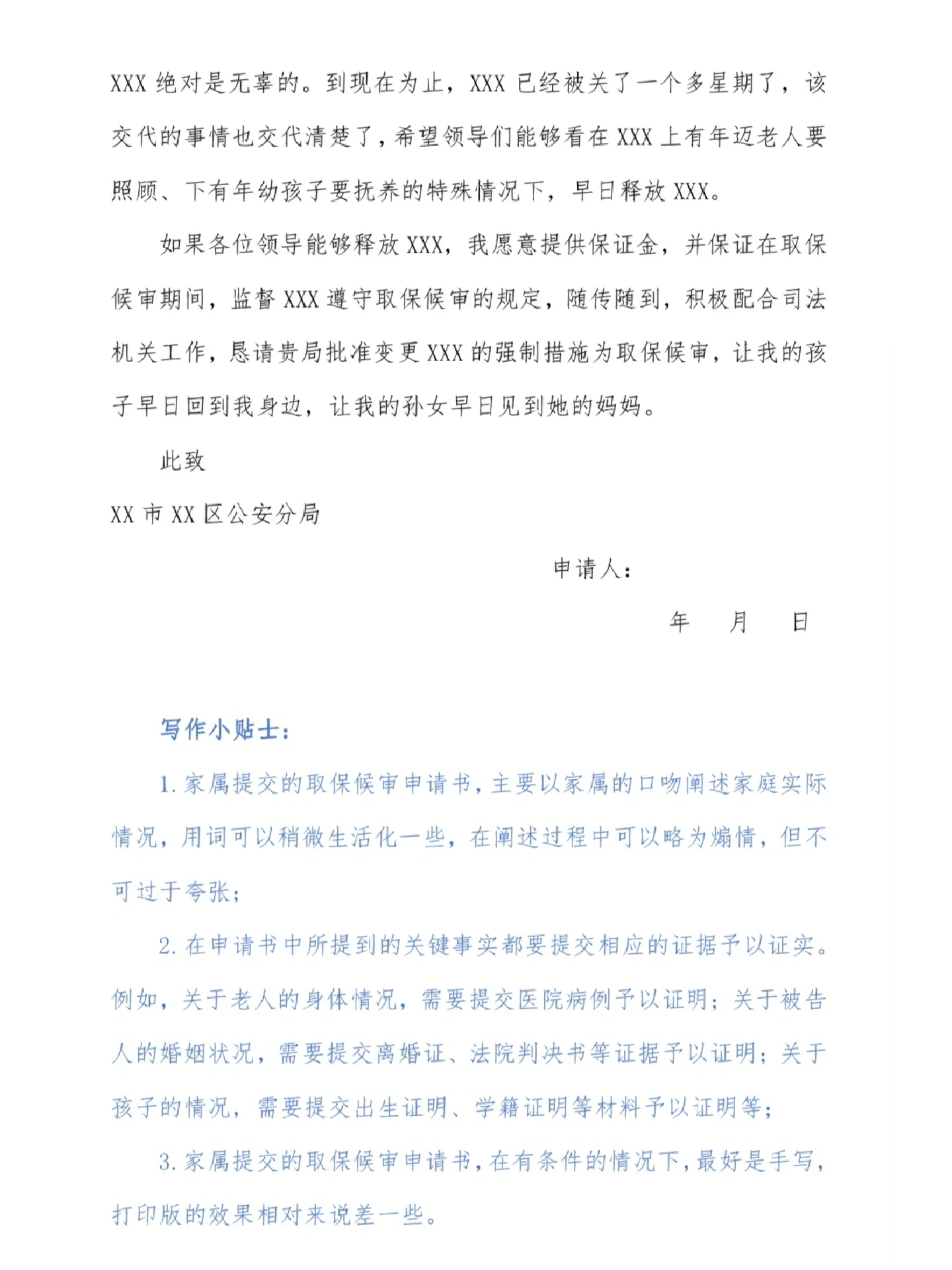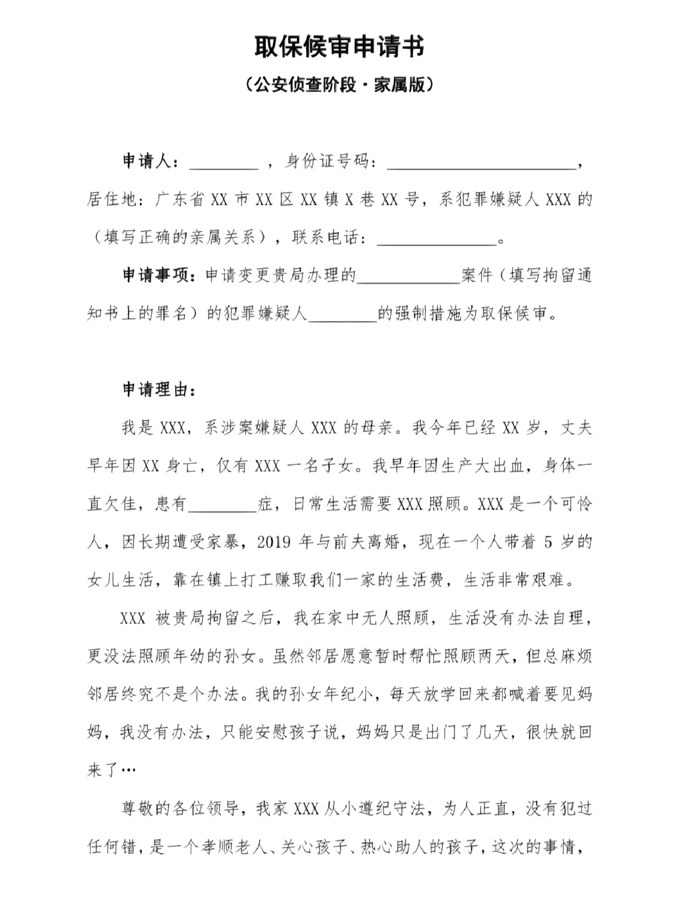 【清單R】許多輕微刑事案件的嫌疑人被逮捕后,他們的家人可能會收到調(diào)查機關(guān)的通知,說他們的家人應該寫一份保釋申請表,交給你辦理取保候?qū)?。[樹皮R] 這時,一位家庭成員問道:“取保候?qū)徤暾埵鞘裁??我應該怎么寫?”?[墻支撐R] [清單R]在本說明中,我們總結(jié)了家庭成員使用的取保候?qū)徤暾埍砟0?。如果你需要,請自己拿著[微笑R] [清單R]應注意的是,該模板僅適用于調(diào)查當局通知保釋處理的情況。如果案件難度較大,取保候?qū)彸晒β什桓?,就需要對具體案件提供具體的取保候?qū)彿梢庖?。[像R]