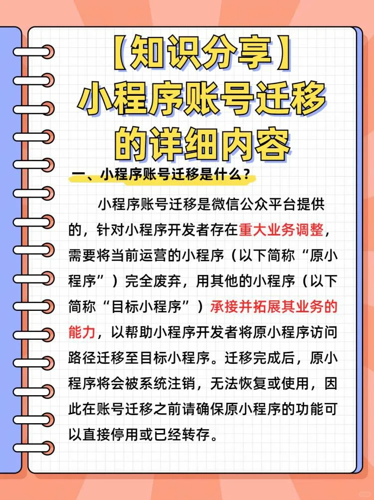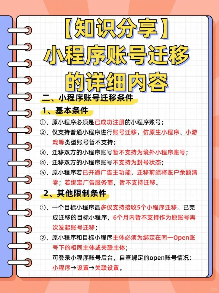 ? 1、 什么是迷你程序帳戶遷移?? 微程序賬號遷移由微信公眾平臺提供。為了應(yīng)對小程序開發(fā)者的重大業(yè)務(wù)調(diào)整,有必要完全放棄當前運行的小程序(以下簡稱“原小程序”),轉(zhuǎn)而使用其他小程序(以下稱“目標小程序””)來承擔和擴展其業(yè)務(wù)能力,以幫助小程序開發(fā)者將原小程序訪問路徑遷移到目標小程序。遷移完成后,原始小程序?qū)南到y(tǒng)中注銷,無法恢復(fù)或使用。因此,在帳戶遷移之前,請確保原始迷你程序的功能可以直接禁用或已轉(zhuǎn)移。 - ? 2、 迷你程序帳戶的遷移條件是什么? ? 1.基本條件? [1R]原始迷你程序必須是成功注冊的迷你程序帳戶; [2R]賬號遷移只支持常規(guī)小程序,目前不支持原生小程序、小游戲等賬號類型; 【三個Rs】。移民雙方的小程序賬戶目前不支持作為海外小程序賬戶; 【四個Rs】。遷移過程中雙方的小程序帳戶不支持處于掛起狀態(tài); [5R]如果原始迷你程序已啟用廣告客戶功能,則在遷移前必須將帳戶余額重置為零;如果綁定到廣告服務(wù)提供商,則當前不支持遷移。 - ? 2.其他限制? [一個R]。一個目標小程序最多只能接收5次小程序遷移。已完成遷移的目標小程序不支持在6個月內(nèi)作為原始帳戶再次發(fā)起帳戶遷移; [2R]原始和目標小程序?qū)嶓w必須是綁定到同一開放賬戶的相同或關(guān)聯(lián)實體; 您可以登錄到迷你程序帳戶的后端,檢查綁定的開放帳戶的狀態(tài):迷你程序→ 設(shè)置→ 相關(guān)設(shè)置。