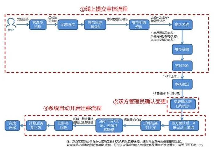 公眾號遷移最重要的兩點(diǎn)需要注意: 1.需要兩個公眾號才能完成遷移; 2.目標(biāo)賬戶必須是企業(yè)賬戶。 1、 什么條件下可以遷移公眾號?(p2) 無論原始帳戶是個人帳戶、企業(yè)帳戶還是被實(shí)體取消的企業(yè)帳戶,都可以遷移。但是,目標(biāo)賬戶只能是以個體工商戶、企業(yè)和其他組織為主體的賬戶,個人賬戶不能作為目標(biāo)賬戶。 2、 以下是公眾號遷移的詳細(xì)流程圖;(p3)