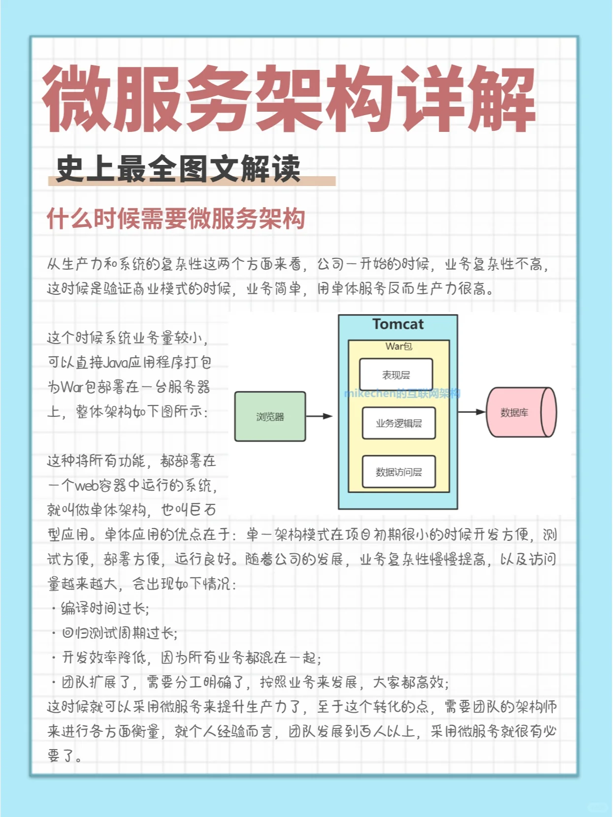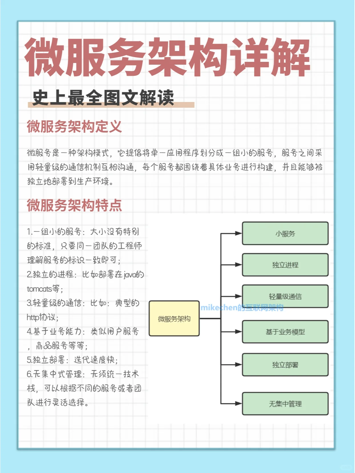 微服務是一種架構模式,主張將單個應用程序劃分為一組小型服務,使用輕量級通信機制相互通信。每個服務都是圍繞特定的業(yè)務構建的,并且可以獨立地部署到生產(chǎn)環(huán)境中。 基于微服務之父Martin Fowler的描述,我總結了以下6點: 1.一小套服務:沒有具體的規(guī)模標準,只要同一團隊的工程師明白服務標識是一致的; 2.獨立進程:如Java部署的Tomcat; 3.輕量級通信:例如,典型的HTTP協(xié)議; 4.基于業(yè)務能力:類似于用戶服務、產(chǎn)品服務等; 5、獨立部署:迭代速度快; 6.不需要集中管理:不需要統(tǒng)一的技術堆棧,可以根據(jù)不同的服務或團隊進行靈活的選擇。