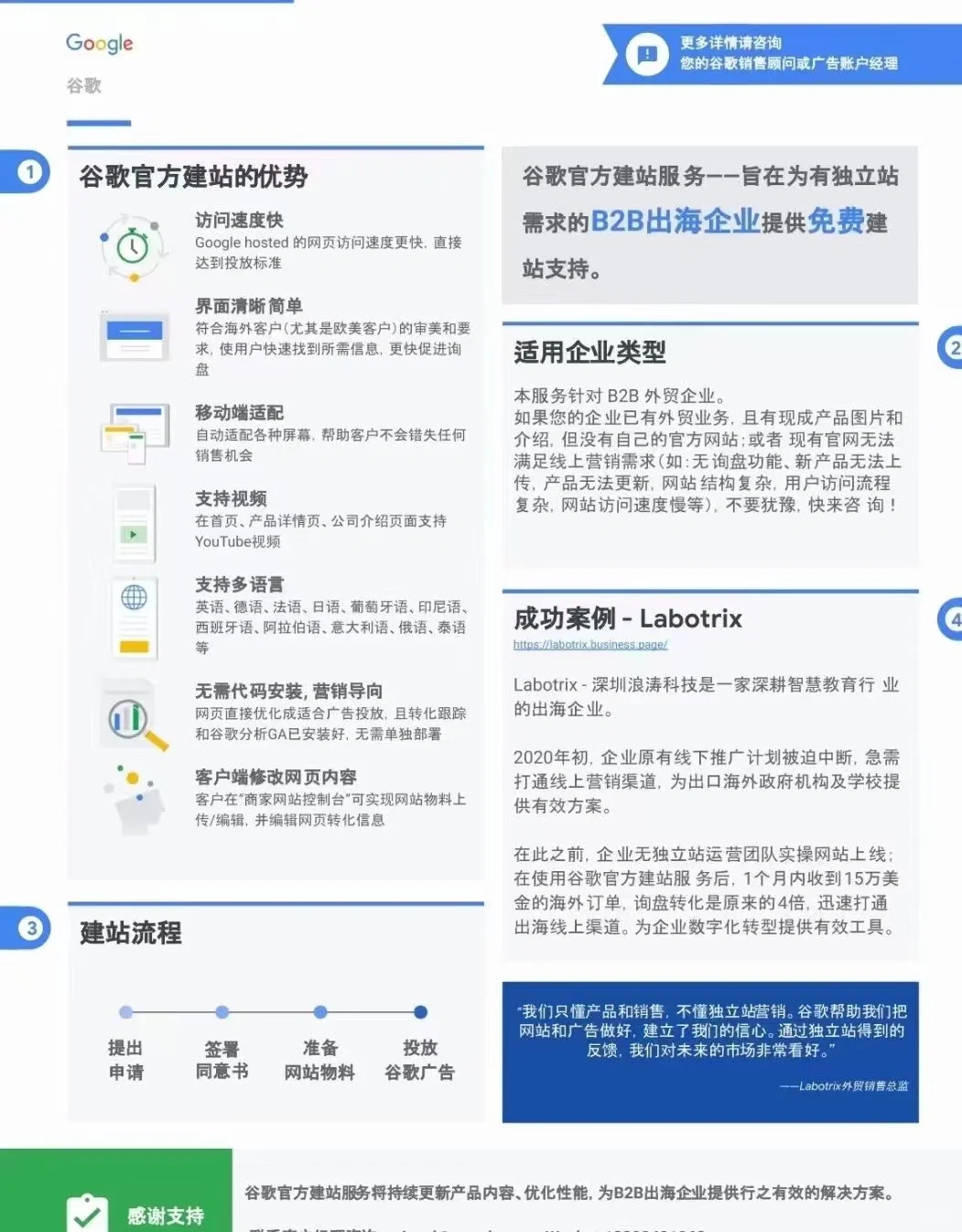 大家好! ? 谷歌推出了官方網(wǎng)站建設(shè)服務(wù),為有獨立網(wǎng)站(海外官方網(wǎng)站)和需求的B2B海外企業(yè)提供免費網(wǎng)站建設(shè)支持。 ? 適用于: ? B2B企業(yè) ? 沒有海外官方網(wǎng)站 ? 現(xiàn)有的官方網(wǎng)站不完整 ? 網(wǎng)站功能: ? To B(查詢功能,不支持網(wǎng)上購買) ? 清晰頁面:適合歐美客戶審美 ? 支持視頻:YouTube視頻 ? 支持多種語言:包括14種語言 有關(guān)詳細(xì)信息,請參閱圖片。如果您不熟悉詳細(xì)信息,請隨時查詢 ? 補充說明 由于它只是一個模板網(wǎng)站,不適合對網(wǎng)站要求很高的企業(yè)主。我們可以將自己的需求與上述功能相匹配,看看它們是否合適。 ? 需求匹配的過程是什么? 1.聯(lián)系谷歌廣告客戶經(jīng)理 2.提供產(chǎn)品圖片和信息(如果有原創(chuàng)網(wǎng)站,可以提供) 提供材料后,網(wǎng)站建設(shè)者將幫助您構(gòu)建