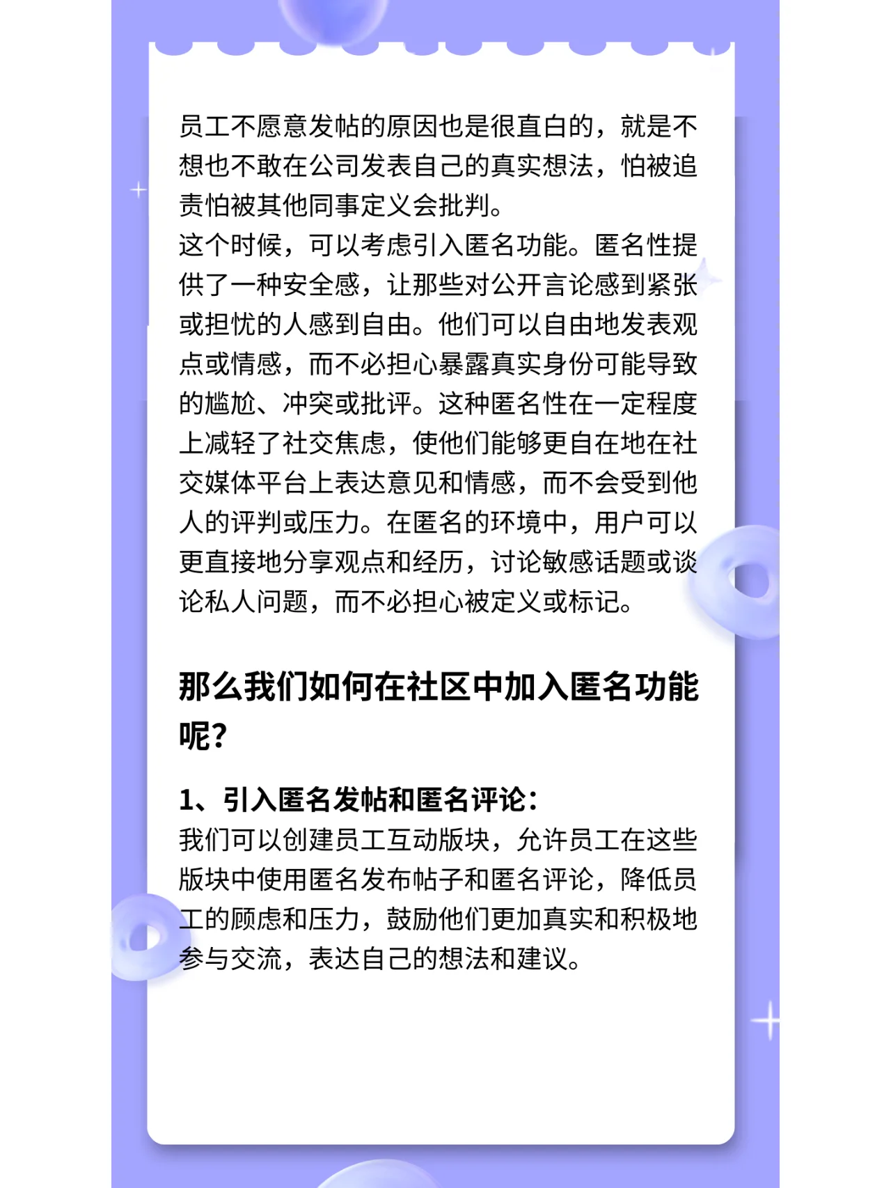 本文是關(guān)于如何運(yùn)營(yíng)公司內(nèi)部社區(qū)以及如何激發(fā)員工互動(dòng)的。 作為運(yùn)營(yíng)商,必須首先明確公司內(nèi)部員工培養(yǎng)的目的。通常是創(chuàng)建和推廣公司內(nèi)部文化,發(fā)布公司政策通知和行業(yè)趨勢(shì),組織公司關(guān)鍵活動(dòng),分享員工經(jīng)驗(yàn)和資源,與員工互動(dòng),提供員工建議的反饋等。 除了運(yùn)營(yíng)商需要發(fā)布的通知和政策外,運(yùn)營(yíng)商在建立企業(yè)社區(qū)后面臨的最大挑戰(zhàn)是如何消除員工的擔(dān)憂,鼓勵(lì)他們?cè)谏鐓^(qū)中發(fā)聲。由于各種因素,員工不愿意在公司內(nèi)部社區(qū)表達(dá)自己的意見(jiàn)或建議,也不愿意參加社區(qū)活動(dòng)。 如果網(wǎng)站運(yùn)營(yíng)商不采取相應(yīng)措施進(jìn)行調(diào)整,企業(yè)內(nèi)部員工群體就很難生存。 員工不愿意發(fā)帖的原因也很簡(jiǎn)單,那就是他們不想或不敢在公司表達(dá)自己的真實(shí)想法,害怕被追究責(zé)任或被其他同事定義和批評(píng)。 在這一點(diǎn)上,可以考慮引入匿名功能。匿名提供了一種安全感,讓那些對(duì)公共言論感到緊張或擔(dān)憂的人感到自由。他們可以自由表達(dá)自己的觀點(diǎn)或情緒,而不必?fù)?dān)心暴露自己的真實(shí)身份可能導(dǎo)致的尷尬、沖突或批評(píng)。這種匿名性在一定程度上緩解了社交焦慮,使他們能夠在社交媒體平臺(tái)上更自由地表達(dá)自己的觀點(diǎn)和情緒,而不會(huì)受到他人的評(píng)判或壓力。在匿名環(huán)境中,用戶可以更直接地分享觀點(diǎn)和體驗(yàn),討論敏感話題或個(gè)人問(wèn)題,而無(wú)需擔(dān)心被定義或標(biāo)記。