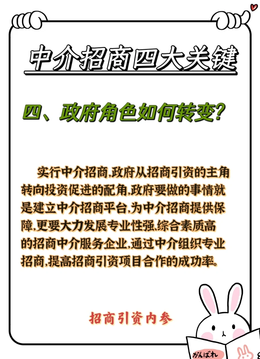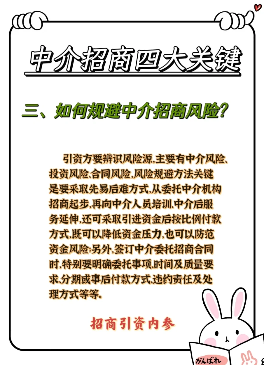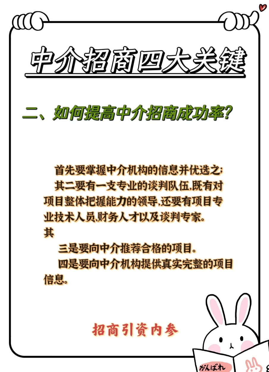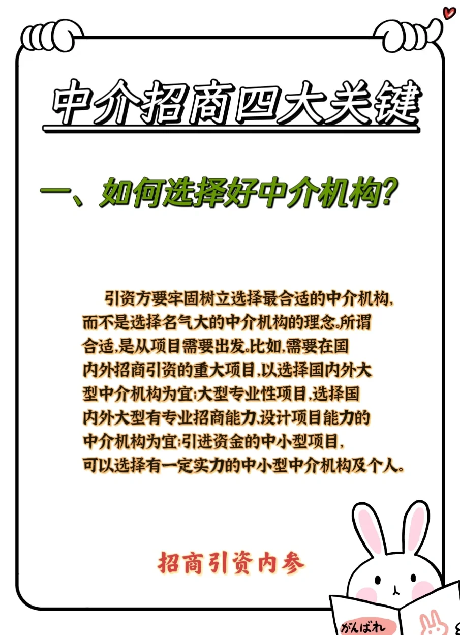 第9天打卡 關(guān)鍵詞:中介招商 【飛機(jī)R】【學(xué)生黨R】中介招商一般由Z F或某項(xiàng)目單位通過投資中介機(jī)構(gòu)或中介機(jī)構(gòu)進(jìn)行,將投資項(xiàng)目推向國(guó)內(nèi)外投資市場(chǎng)。受托方對(duì)項(xiàng)目進(jìn)行打包,開展招商活動(dòng),為委托方選擇理想的合作伙伴。 要確保中介招商成功,需要抓住四個(gè)關(guān)鍵點(diǎn): 如何選擇好的中介機(jī)構(gòu) 吸引方應(yīng)牢固樹立選擇最合適的中介機(jī)構(gòu)的觀念,而不是選擇知名的中介機(jī)構(gòu)。所謂適宜性,是從項(xiàng)目的需要出發(fā)的。例如,對(duì)于需要吸引國(guó)內(nèi)外投資的重大項(xiàng)目,宜選擇國(guó)內(nèi)外大型中介機(jī)構(gòu);對(duì)于大型專業(yè)項(xiàng)目,宜選擇具有專業(yè)投資和項(xiàng)目設(shè)計(jì)能力的國(guó)內(nèi)外大型中介機(jī)構(gòu);引入資金的中小項(xiàng)目可以選擇具有一定實(shí)力的中小中介機(jī)構(gòu)和個(gè)人。 如何提高中介招商的成功率 首先,要掌握中介機(jī)構(gòu)的信息,選擇中介機(jī)構(gòu)進(jìn)行最優(yōu)選擇;第二個(gè)要求是有一個(gè)專業(yè)的談判團(tuán)隊(duì),包括項(xiàng)目總體管理的領(lǐng)導(dǎo),以及專業(yè)的技術(shù)人員、財(cái)務(wù)人才和談判專家。三是向中介機(jī)構(gòu)推薦符合條件的項(xiàng)目,四是向中介提供真實(shí)、完整的項(xiàng)目信息。 如何規(guī)避中介投資風(fēng)險(xiǎn) 吸引方需要識(shí)別風(fēng)險(xiǎn)來源,主要包括中介風(fēng)險(xiǎn)、投資風(fēng)險(xiǎn)和合同風(fēng)險(xiǎn)。風(fēng)險(xiǎn)規(guī)避方法的關(guān)鍵是采取先易后難的方法,從委托中介機(jī)構(gòu)招商開始,然后延伸到中介人員培訓(xùn)和中介服務(wù),再到引入資金后采取按比例支付的方法,可以減輕財(cái)務(wù)壓力,防范財(cái)務(wù)風(fēng)險(xiǎn);此外,在簽訂中介傭金投資合同時(shí),明確委托事項(xiàng)、時(shí)間和質(zhì)量要求、分期付款或后付款方式、違約責(zé)任和處理方式等尤為重要。 【慶典R】【煙花R】4。Z F的字符是如何變化的 開展中介招商,zf應(yīng)從招商的主導(dǎo)作用轉(zhuǎn)向招商的支撐作用。zf要做的是建立中介投資平臺(tái),為中介招商提供保障,更重要的是大力發(fā)展專業(yè)性強(qiáng)、綜合素質(zhì)高的招商中介服務(wù)企業(yè),通過中介組織的專業(yè)招商,提高招商項(xiàng)目合作的成功率。