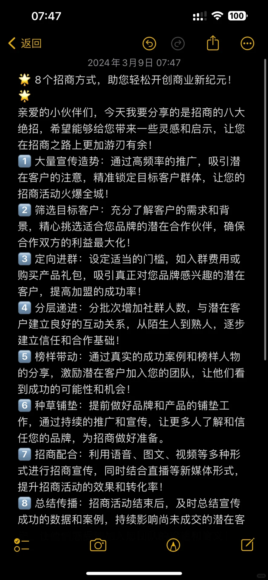 親愛的朋友們,今天我要給大家分享的是吸引投資的八個(gè)小技巧。我希望它能給你帶來一些靈感和啟發(fā),讓你更善于吸引投資! 一?? 海量推廣和炒作:通過高頻次的推廣,吸引潛在客戶的注意力,精準(zhǔn)定位目標(biāo)客戶群,讓你的招商活動(dòng)火爆全城! 二?? 篩選目標(biāo)客戶:充分了解客戶的需求和背景,精心選擇適合您品牌的潛在合作伙伴,確保雙方利益最大化! 三?? 定向加盟:設(shè)置適當(dāng)?shù)拈T檻,如加盟費(fèi)或購(gòu)買產(chǎn)品包,以吸引真正對(duì)您的品牌感興趣的潛在客戶,提高加盟成功率! 四?? 分級(jí)推進(jìn):批量增加社區(qū)成員數(shù)量,與潛在客戶建立良好的互動(dòng)關(guān)系,逐步建立從陌生人到熟人的信任與合作基礎(chǔ)! 五?? 榜樣驅(qū)動(dòng):通過分享真實(shí)的成功故事和榜樣,激勵(lì)潛在客戶加入您的團(tuán)隊(duì),并向他們展示成功的可能性和機(jī)會(huì)! 六?? 種草打基礎(chǔ):提前準(zhǔn)備好品牌和產(chǎn)品,通過不斷的推廣和宣傳,讓更多的人了解和信任你的品牌,為招商做準(zhǔn)備。 七?? 招商合作:利用語(yǔ)音、文字、視頻等多種形式進(jìn)行招商,結(jié)合直播等新媒體形式,提高招商活動(dòng)的有效性和轉(zhuǎn)化率! 八?? 總結(jié)與交流:招商活動(dòng)結(jié)束后,及時(shí)總結(jié)推廣成功的數(shù)據(jù)和案例,持續(xù)影響尚未完成交易的潛在客戶,讓他們感受到加入您團(tuán)隊(duì)的價(jià)值和意義!