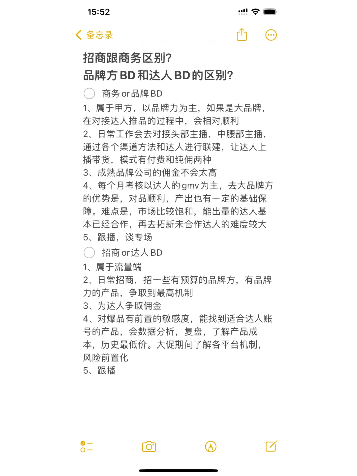 [Fireworks R]商業(yè)或品牌BD 1、屬于甲方,品牌力是主要關(guān)注點(diǎn)。如果是一個大品牌,與有影響力的人聯(lián)系推廣產(chǎn)品的過程會相對順利 2.在日常工作中,我會與頂級主播和中端主播對接,通過各種渠道和方法與有影響力的人合作,促進(jìn)銷售。有影響力的人有兩種模式:付費(fèi)和純傭金 3.成熟品牌公司的傭金不會太高 4.月度評估主要基于專家的GMV。去大品牌方的好處是產(chǎn)品質(zhì)量順暢,產(chǎn)量也有一定的基礎(chǔ)保障。困難在于,市場相對飽和,大多數(shù)能夠批量生產(chǎn)的影響者已經(jīng)合作。很難發(fā)掘出沒有合作過的新影響者 5.跟進(jìn),談?wù)撎貏e會議 [Balloon R]投資或影響者BD 1.屬于交通側(cè) 2.日常招商,招募有預(yù)算、有品牌力的品牌,爭取最高機(jī)制 3.為有影響力的人爭取傭金 4.之前對爆炸性產(chǎn)品有敏感度,能夠找到適合有影響力的客戶的產(chǎn)品,能夠分析和審查數(shù)據(jù),了解產(chǎn)品成本和歷史最低價格。了解各種平臺的機(jī)制,并在大促期間優(yōu)先考慮風(fēng)險 5.關(guān)注廣播