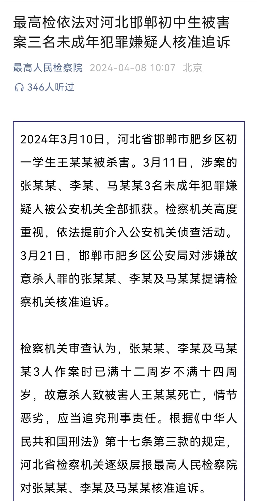 據(jù)河北省人民檢察院今天(4月8日)消息:河北邯鄲初中生被害案件三名未成年犯罪嫌疑人被核準(zhǔn)追訴。 低齡未成年人嚴(yán)重暴力犯罪可通過核準(zhǔn)追訴依法追究刑事責(zé)任 2021年3月1日起施行的《刑法修正案(十一)》在《刑法》第17條新增第3款規(guī)定:“已滿十二周歲不滿十四周歲的人,犯故意殺人、故意傷害罪,致人死亡或者以特別殘忍手段致人重傷造成嚴(yán)重殘疾,情節(jié)惡劣,經(jīng)最高人民檢察院核準(zhǔn)追訴的,應(yīng)當(dāng)負(fù)刑事責(zé)任。” 這一規(guī)定將我國的刑事責(zé)任年齡從之前的14周歲,個(gè)別性地、有條件地下調(diào)到12周歲,提供了在司法體系內(nèi)處理低齡未成年人嚴(yán)重暴力犯罪的一種路徑。