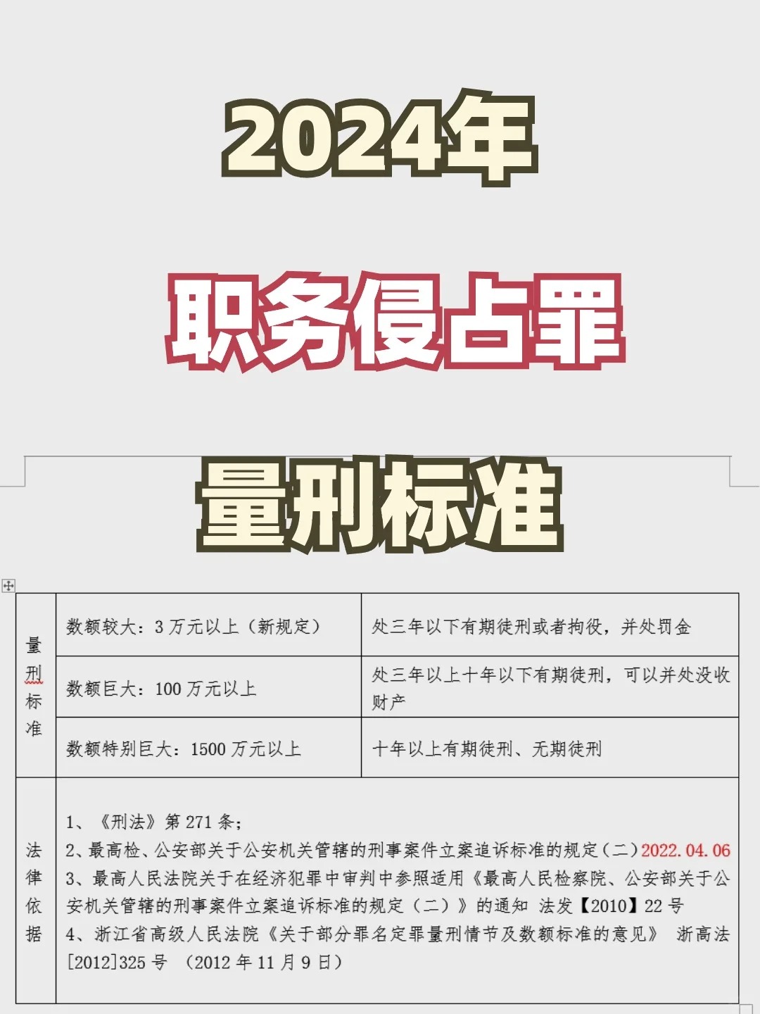 一、量刑幅度 1.數(shù)額較大:3萬(wàn)元以上(新規(guī)定)>>處三年以下有期徒刑或者拘役,并處罰金 2.數(shù)額巨大:100萬(wàn)元以上 >> 處三年以上十年以下有期徒刑,可以并處沒(méi)收財(cái)產(chǎn) 3.數(shù)額特別巨大:1500萬(wàn)元以上 >> 十年以上有期徒刑、無(wú)期徒刑 二、法律依據(jù) 1、《刑法》第271條; 2、最高檢、公安部關(guān)于公安機(jī)關(guān)管轄的刑事案件立案追訴標(biāo)準(zhǔn)的規(guī)定(二)2022.04.06 3、最高人民法院關(guān)于在經(jīng)濟(jì)犯罪中審判中參照適用《最高人民檢察院、公安部關(guān)于公安機(jī)關(guān)管轄的刑事案件立案追訴標(biāo)準(zhǔn)的規(guī)定(二)》的通知 法發(fā)【2010】22號(hào) 4、浙江省高級(jí)人民法院《關(guān)于部分罪名定罪量刑情節(jié)及數(shù)額標(biāo)準(zhǔn)的意見》 三、注意事項(xiàng) 職務(wù)侵占與盜竊罪的唯一區(qū)分是是否利用職務(wù)便利,在該情節(jié)模糊的情況下,切勿根據(jù)職務(wù)侵占罪量刑標(biāo)準(zhǔn),盲目樂(lè)觀,也要注意盜竊罪量刑標(biāo)準(zhǔn),如果被控盜竊罪,認(rèn)為自己僅涉嫌職務(wù)侵占的,一定要及時(shí)委托律師介入。