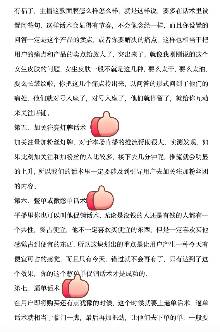 1.開場指導(dǎo): 開幕詞應(yīng)包括愉快的歡迎詞以及關(guān)于當(dāng)天直播活動和原因的信息,以確保保留觀眾的興趣。 2. 吸引人的站點: 在保留語中,明確告知用戶他們的停留時間,例如,三分鐘后會有好處,這樣用戶就可以理解只需要三分鐘就可以避免失去耐心。 3. 產(chǎn)品亮點: 在產(chǎn)品介紹中,重點展示產(chǎn)品價值,突出核心賣點,運(yùn)用排比、押韻等方法,使介紹更加生動有趣。 4. 巧妙的互動: 當(dāng)涉及到互動時,避免無聊的日常生活,并引導(dǎo)用戶以非強(qiáng)制性的方式遵循說明。分享一些巧妙的互動技巧,確保它們能引起用戶的興趣。 5. 引導(dǎo)注意事項: 在直播過程中引導(dǎo)用戶關(guān)注和加入粉絲群對流媒體非常有幫助。確保腳本中包含指導(dǎo)用戶執(zhí)行這些操作的內(nèi)容。 6. 推廣指導(dǎo): 在使用促銷語言時,讓用戶感覺到今天有獨(dú)家折扣,強(qiáng)調(diào)只有今天才有這個折扣,并為用戶創(chuàng)造心理優(yōu)勢。 7. 訂單強(qiáng)制技巧:當(dāng)用戶猶豫是否購買時,使用訂單強(qiáng)制語言強(qiáng)調(diào)產(chǎn)品質(zhì)量和售后服務(wù),解決用戶疑慮,讓用戶安心下單。 8. 過渡到最后: 當(dāng)我們接近尾聲時,巧妙地使用遷移語言提前做好準(zhǔn)備,使過渡自然,避免讓用戶感到突兀。這有助于減少在線用戶數(shù)量的波動。 無論是學(xué)習(xí)他人的語言還是創(chuàng)建自己的副本,它都可以用于驗證,以確保不會遺漏任何關(guān)鍵元素。最重要的是,優(yōu)秀的語言技能需要與主播的能力相輔相成。只有將兩者結(jié)合起來,才能充分利用語言技能。