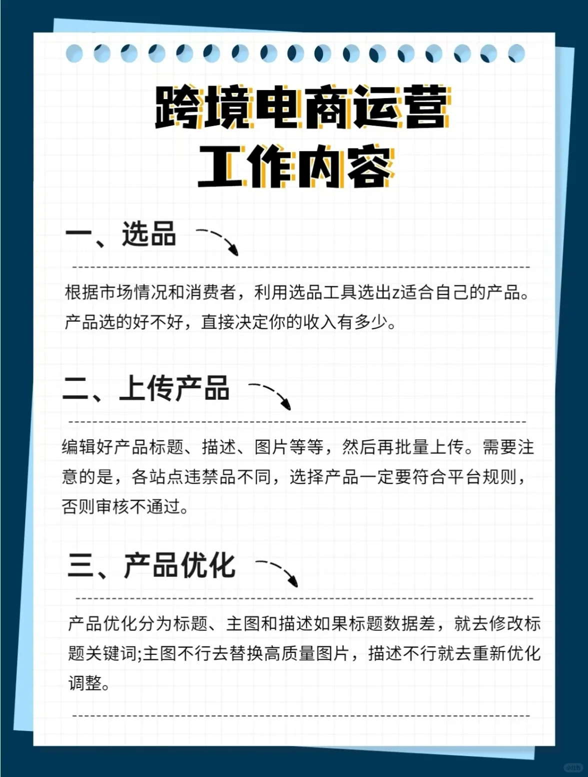 跨境電商運(yùn)營的工作內(nèi)容大致可以分為以下幾個(gè)部分: 1.市場(chǎng)調(diào)查和分析:深入了解目標(biāo)市場(chǎng),包括消費(fèi)者習(xí)慣、銷售節(jié)日、消費(fèi)者偏好和競(jìng)爭(zhēng)對(duì)手策略。 2.產(chǎn)品選擇和開發(fā):選擇具有市場(chǎng)潛力的產(chǎn)品,并確保其符合目標(biāo)市場(chǎng)的監(jiān)管要求。我們需要與供應(yīng)商、設(shè)計(jì)師和工廠深入合作。 3.銷售平臺(tái)管理:在電子商務(wù)平臺(tái)上建立和管理店鋪,包括產(chǎn)品上傳、信息更新、頁面設(shè)計(jì)優(yōu)化、評(píng)論和評(píng)級(jí)管理等。營銷和推廣:制定和實(shí)施有效的營銷策略,以提高品牌知名度和產(chǎn)品銷售。包括SEO優(yōu)化、付費(fèi)廣告、電子郵件營銷、社交媒體推廣等。 5.物流管理:確保產(chǎn)品及時(shí)、安全地交付給消費(fèi)者。我們需要與物流公司合作,管理庫存,避免短缺或積壓。 6.客服:處理訂單問題,解答產(chǎn)品咨詢,解決退換貨問題,提供優(yōu)質(zhì)客服。 7.風(fēng)險(xiǎn)管理:遵守各項(xiàng)規(guī)定,應(yīng)對(duì)貨幣匯率波動(dòng)、支付風(fēng)險(xiǎn)、物流問題等。需要建立有效的風(fēng)險(xiǎn)管理機(jī)制。 在具體實(shí)施層面,跨境電商運(yùn)營需要做的工作包括: 1.選擇要上市的產(chǎn)品,與平面設(shè)計(jì)師合作完成上市產(chǎn)品的照片拍攝和美化。 2.完成產(chǎn)品文案的編輯和布局,及時(shí)維護(hù)產(chǎn)品的上架和下架。 3.編寫門店?duì)I銷計(jì)劃和日?;顒?dòng)計(jì)劃,與各崗位同事協(xié)調(diào),明確活動(dòng)和分工。 4.完成門店?duì)I銷計(jì)劃的數(shù)據(jù)統(tǒng)計(jì),并根據(jù)門店歷史數(shù)據(jù),根據(jù)市場(chǎng)需求對(duì)產(chǎn)品進(jìn)行定價(jià)。 5.確定店鋪裝修風(fēng)格,配合平面設(shè)計(jì)師完成店鋪裝修及重新設(shè)計(jì)。 6.負(fù)責(zé)推廣產(chǎn)品,增加其曝光率和排名,吸引更多流量到商店,創(chuàng)造受歡迎的產(chǎn)品,并推動(dòng)產(chǎn)品銷售。 7.協(xié)助庫存的物流和倉庫管理,并根據(jù)門店的實(shí)際情況,避免缺貨或囤積,做好訂單統(tǒng)計(jì)。 8、監(jiān)督門店評(píng)價(jià)問題,協(xié)助客服解決差評(píng)、投訴等問題。 總體而言,跨境電子商務(wù)的運(yùn)營非常繁瑣和重要,要求運(yùn)營商對(duì)電子商務(wù)行業(yè)的各個(gè)方面都有深入的了解和精通。