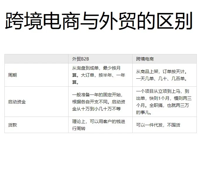 簡(jiǎn)單來(lái)說(shuō),有四個(gè)區(qū)別:不同的數(shù)量、不同的訂單來(lái)源、不同的核心位置、不同的創(chuàng)業(yè)難度。 差異1:數(shù)量不同 跨境電商可以理解為在海外淘寶網(wǎng)上開(kāi)店,通過(guò)零售的方式銷(xiāo)售給消費(fèi)者。 訂單數(shù)量總是像“1+1+…”當(dāng)然,總金額可以大也可以小。 外貿(mào)B2B是指通過(guò)各種渠道向外國(guó)批發(fā)商、分銷(xiāo)商和品牌所有者批量銷(xiāo)售商品,重點(diǎn)是批量生產(chǎn)。 在B2B外貿(mào)中,購(gòu)買(mǎi)一個(gè)樣品不算作訂單,它被稱(chēng)為“發(fā)送樣品”,意思是向客戶(hù)發(fā)送樣品。只有滿(mǎn)足批量生產(chǎn)要求的MOQ才會(huì)被稱(chēng)為“訂單”。 差異2:訂單來(lái)源不同 所有跨境電商訂單均來(lái)自亞馬遜、eBay、Lazada、Shopee等國(guó)外平臺(tái),或B2C自建網(wǎng)站(也稱(chēng)“獨(dú)立網(wǎng)站”)。 區(qū)別3:不同的核心位置 在跨境電商中,與客戶(hù)打交道被稱(chēng)為“客服”,核心地位是運(yùn)營(yíng)。 外貿(mào)B2B恰恰相反,與客戶(hù)打交道的人被稱(chēng)為“外貿(mào)銷(xiāo)售人員”,這是公司的核心職位。平臺(tái)操作是次要的位置。 區(qū)別4:跨境電子商務(wù)更容易創(chuàng)業(yè) 與外貿(mào)B2B相比,跨境電子商務(wù)更容易創(chuàng)業(yè)。 首先,創(chuàng)業(yè)是一件非常不確定的事情。 當(dāng)我們面臨高度不確定的情況時(shí),該怎么辦 當(dāng)然,這是用最少的錢(qián)和最短的時(shí)間來(lái)嘗試。如果你盈利了,繼續(xù)關(guān)注并增加投資。如果我們輸了,我們可以接受,因?yàn)槲覀兺度肓烁俚慕疱X(qián)和時(shí)間,以免失去信心。 通過(guò)從時(shí)間和金錢(qián)的角度比較外貿(mào)B2B和跨境電子商務(wù),我們將知道如何選擇。 外貿(mào)B2B周期至少每月計(jì)算一次,從查詢(xún)到完成。大額訂單按半年或一年計(jì)算。跨境電子商務(wù)訂單每天都會(huì)列出。一天有多少訂單,幾十個(gè),或者幾百個(gè)。 B2B外貿(mào)的啟動(dòng)資金通常根據(jù)發(fā)生的不同費(fèi)用,準(zhǔn)備一年的固定期限。啟動(dòng)資金從10萬(wàn)到幾十萬(wàn)不等。一個(gè)跨境電子商務(wù)項(xiàng)目從立項(xiàng)到啟動(dòng)可能需要長(zhǎng)達(dá)一個(gè)月的時(shí)間,而完成則需要兩到三個(gè)月的緩慢時(shí)間。全職工作只需要2萬(wàn)到3萬(wàn)元左右。 理論上,外貿(mào)B2B可以用客戶(hù)的錢(qián)進(jìn)行周轉(zhuǎn),跨境電商可以代為發(fā)貨而不囤積。 考慮到個(gè)人和城市的消費(fèi)水平,如果我要在外貿(mào)領(lǐng)域開(kāi)展B2B業(yè)務(wù),我每年的固定費(fèi)用為每月15000元×12月=18萬(wàn)元。收起來(lái),20萬(wàn)元。