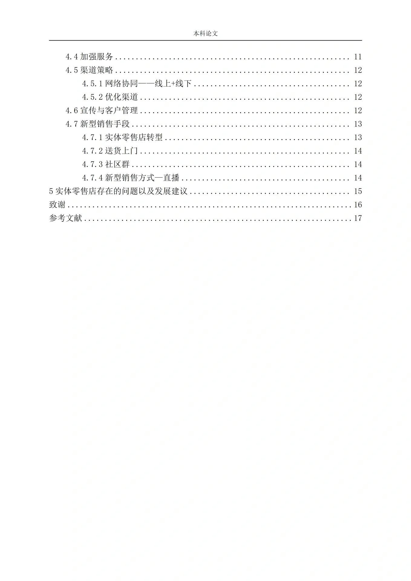 目錄 1簡介1 1.1主題背景1 1.2零售相關概念1 1.2.1零售業(yè)、零售業(yè)和零售企業(yè)1 1.2.2實體零售店的類型2 1.3研究目的和意義2 2.實體零售店營銷環(huán)境分析3 2.1 PEST分析3 2.1.1政治環(huán)境3 2.1.2經(jīng)濟環(huán)境3 2.1.3社會環(huán)境3 2.1.4技術環(huán)境4 2.2實體零售店微觀環(huán)境分析4 2.2.1實體零售店現(xiàn)狀4 2.2.2消費者分析5 2.2.3競爭分析5 2.3電子商務發(fā)展對實體零售店的影響5 2.3.1電子商務現(xiàn)狀5 2.3.2電子商務對實體店和零售店的影響5 2.4實體零售店SWOT分析6 2.4.1實體零售店優(yōu)勢分析6 2.4.2實體零售店的劣勢分析7 2.4.3實體零售店機會分析8 2.4.4實體零售店的威脅分析8 3實體零售店的營銷策略9 3.1業(yè)務規(guī)模和定位9 3.2商業(yè)項目9 3.3競爭戰(zhàn)略9 4互聯(lián)網(wǎng)背景下實體店的營銷策略10 4.1店鋪地址的選擇10 4.2業(yè)務項目調整10 4.3價格策略11 4.4加強服務11 4.5渠道策略12 4.5.1網(wǎng)絡協(xié)作-線上+線下12 4.5.2優(yōu)化渠道12 4.6促銷和客戶管理12 4.7新的銷售方法13 4.7.1實體零售店改造13 4.7.2送貨上門14 4.7.3社區(qū)團體14 4.7.4新的銷售方式-直播14 5實體零售店存在的問題及發(fā)展建議15 謝謝16 參考文獻17