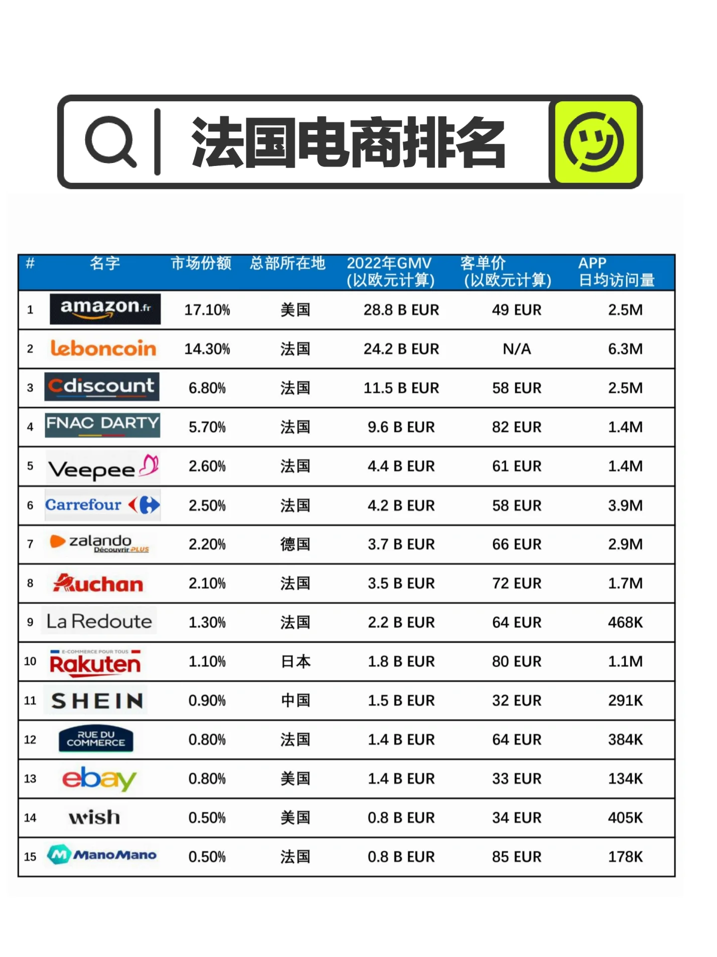 ? 亞馬遜(市場份額17.1%)是法國電子商務(wù)市場的領(lǐng)導(dǎo)者,提供廣泛的產(chǎn)品和快速服務(wù)。 ? Leboncoin(市場份額14.3%)是法國的一個二手交易平臺,用戶可以在這里低價出售閑置物品,購買二手商品,并恢復(fù)閑置物品。 ? Cdiscount(市場份額為6.8%)是法國當?shù)氐囊粋€電子商務(wù)平臺,提供各種產(chǎn)品優(yōu)惠券,允許消費者以更優(yōu)惠的價格購買商品。 ? Fnac Darty(市場份額5.7%)是一家全球知名的科技和家電專業(yè)零售商,提供最新的科技產(chǎn)品和家電。 ? Veepee(市場份額2.6%)是法國的在線折扣促銷平臺之一,提供品牌產(chǎn)品和特別活動,鼓勵消費者購物。 ? 家樂福(市場份額為2.5%)是一家成立于法國的超市電子商務(wù)公司,采購食品、飲料和各種日常用品,以節(jié)省消費者的時間。 ? Zalando(市場份額為2.2%)是一個時尚電子商務(wù)平臺,提供包括服裝、鞋子和珠寶在內(nèi)的時尚產(chǎn)品。 ? 歐尚(市場份額2.1%)是一個法國連鎖超市品牌,提供各種產(chǎn)品,如食品、飲料和日用品。 ? La Redoute(市場份額為1.3%)是法國的一家在線時尚零售商,提供各種精心設(shè)計的服裝和家居用品。 ? SHEIN(市場份額0.9%)是一個電子商務(wù)平臺,提供各種時尚、優(yōu)質(zhì)、實惠的產(chǎn)品。 ? Rue du Commerce(市場份額0.8%)是法國的一家在線零售商集團,提供從電子產(chǎn)品到家居裝飾的各種產(chǎn)品。 ? 易趣法國(市場份額為0.8%)是世界上最大的綜合電子商務(wù)公司之一,提供無數(shù)的產(chǎn)品來滿足各種客戶需求。 ? 樂天法國(市場份額0.8%)是一家來自日本的在線購物網(wǎng)站,提供來自世界各地的數(shù)千種頂級電子產(chǎn)品、家具、配件和其他產(chǎn)品。 ? Wish(市場份額為0.5%)是一家美國在線購物中心平臺,提供各種各樣的產(chǎn)品。 ? ManoMano(市場份額為0.5%)是法國的一家在線家裝和建材平臺,提供多種家裝產(chǎn)品。