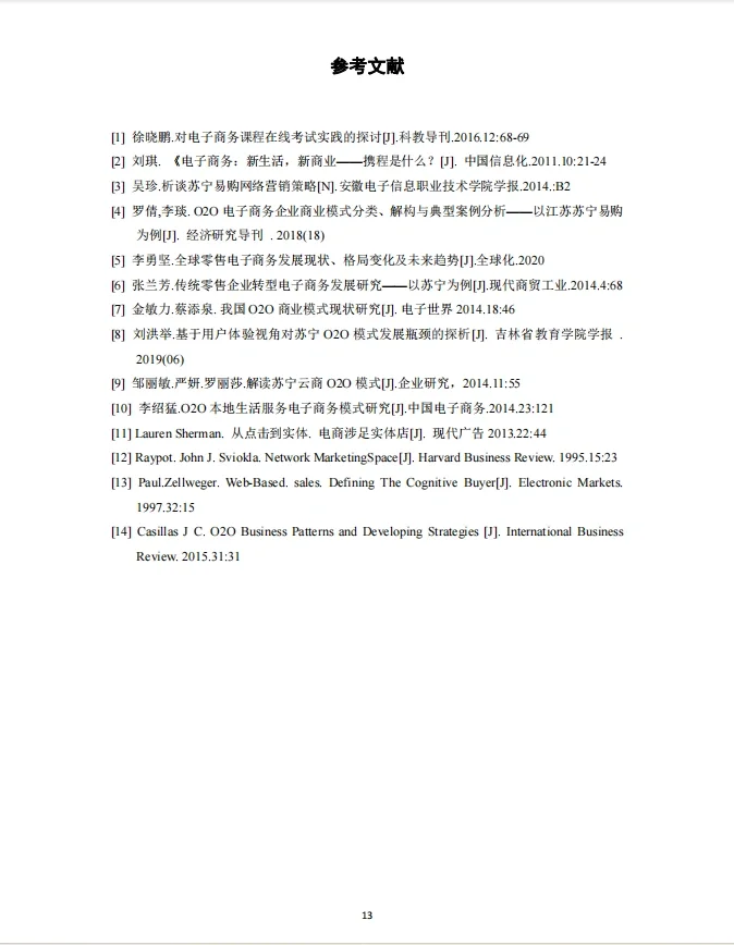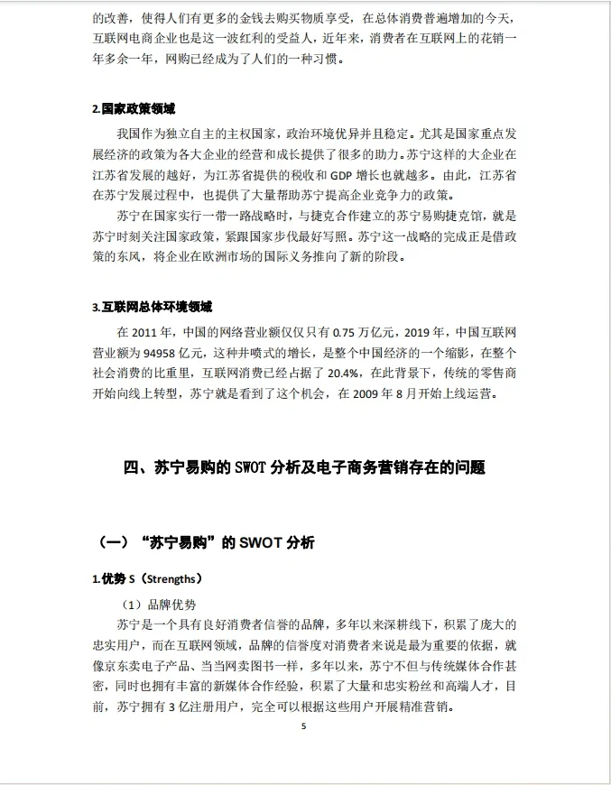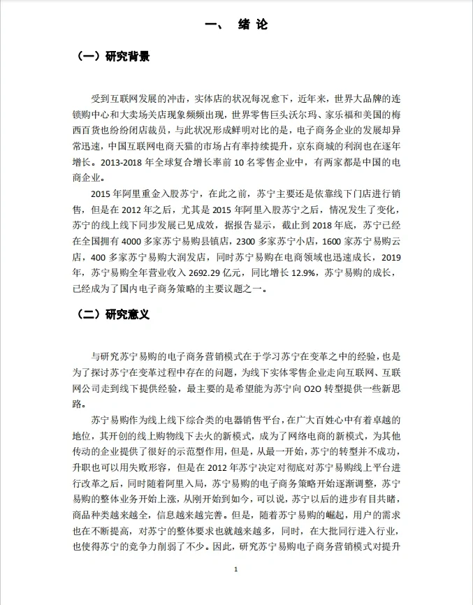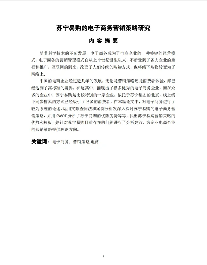 題目:蘇寧電子商務(wù)營銷策略研究 目錄 內(nèi)容摘要一 摘要二 1、 引言1 (1) 研究背景1 (2) 研究意義1 (3) 研究內(nèi)容與方法2 1.研究內(nèi)容2 2.研究方法2 2、 電子商務(wù)營銷基礎(chǔ)理論與文獻(xiàn)綜述2 (1) 電子商務(wù)營銷基礎(chǔ)理論2 (2) 國內(nèi)外研究現(xiàn)狀文獻(xiàn)綜述3 3、 蘇寧電子商務(wù)營銷策略分析4 (1) 蘇寧易購公司簡介4 (2) 蘇寧易購4公司發(fā)展現(xiàn)狀 (3) 蘇寧易購?fù)獠凯h(huán)境分析4 1.消費(fèi)者領(lǐng)域4 2.國家政策領(lǐng)域5 3.互聯(lián)網(wǎng)的整體環(huán)境5 4、 蘇寧易購SWOT分析及電子商務(wù)營銷中存在的問題5 (1) 蘇寧易購SWOT分析5 1.優(yōu)勢5 2.弱點(diǎn)6 3.機(jī)會O(機(jī)會)7 4.威脅7 (2) “蘇寧網(wǎng)”電商營銷存在的問題8 1.線上線下定位不清8 2.經(jīng)驗薄弱,信用體系不完善8 3.與消費(fèi)者互動不暢8 4.價格定位不明確9 5、 蘇寧電商營銷建議9 (1) 在線和離線營銷協(xié)作9 (2) 改善信用體系10 (3) 加強(qiáng)與消費(fèi)者的溝通11