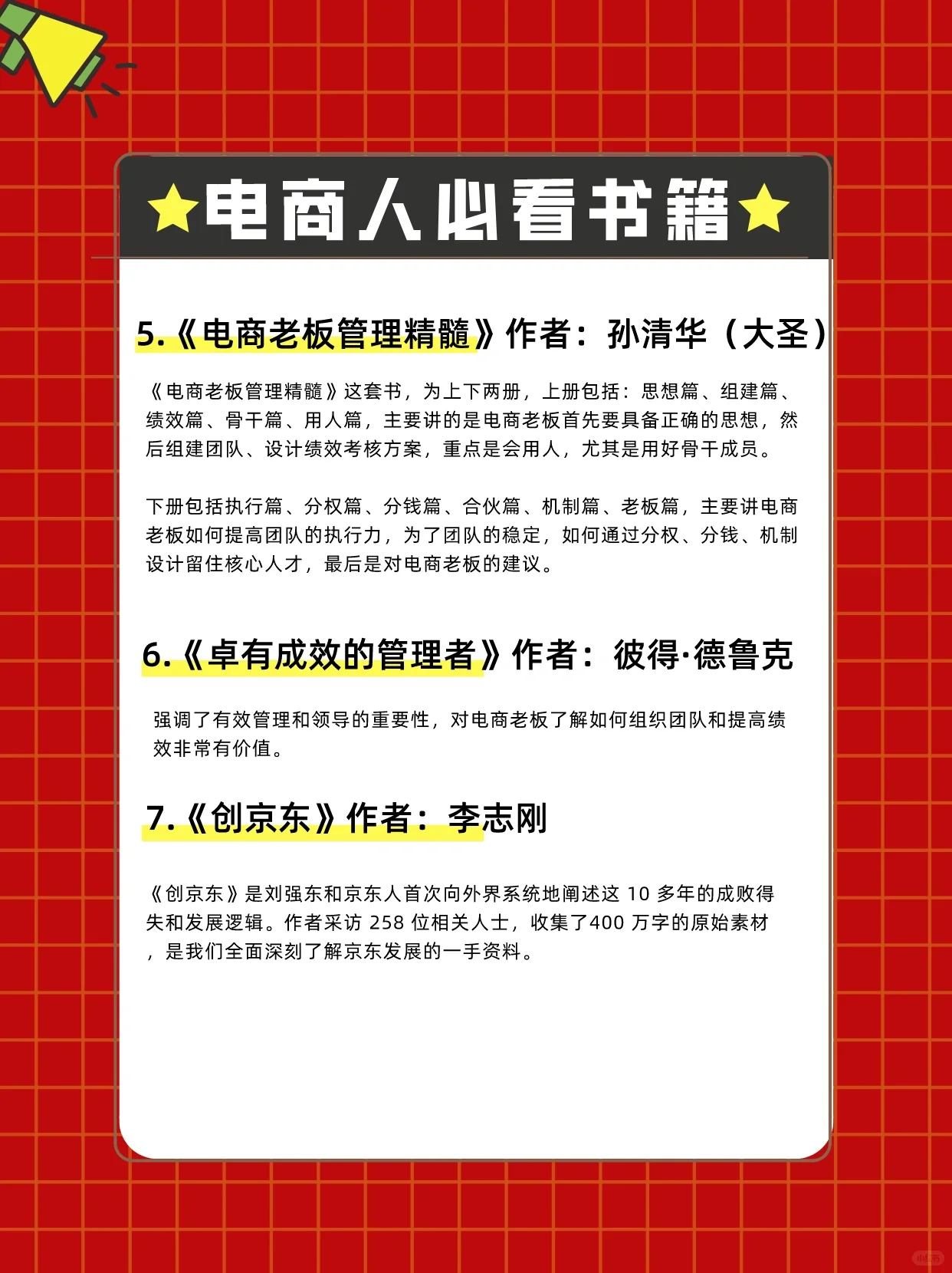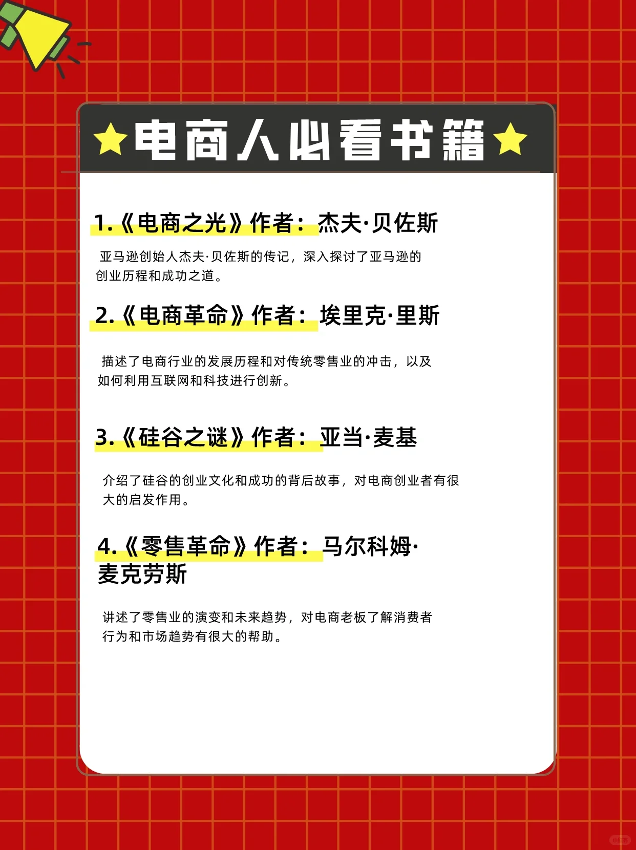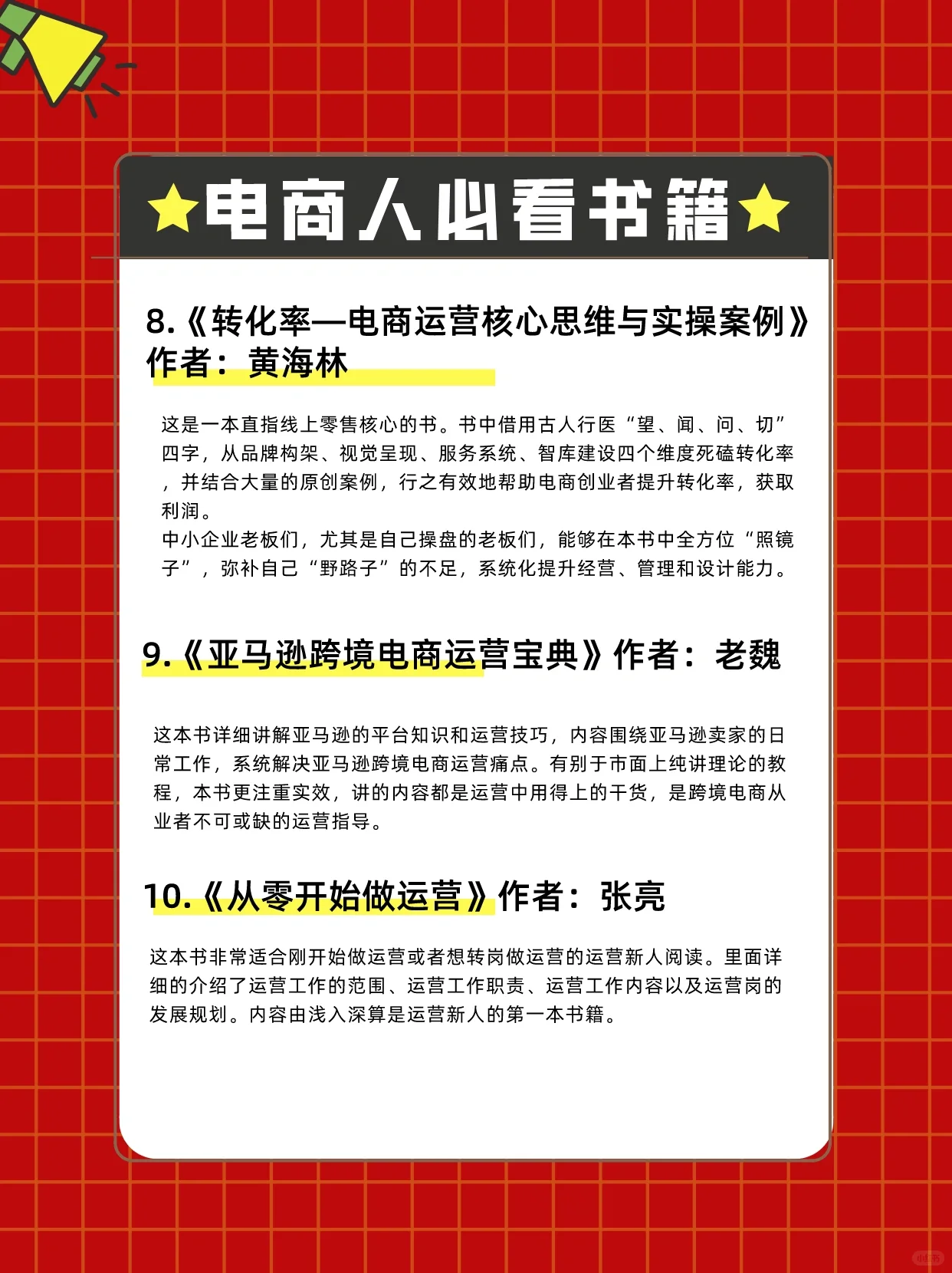 電子商務(wù)人士都在看 Jeff Bezos的“電子商務(wù)之光” 亞馬遜創(chuàng)始人杰夫·貝佐斯的傳記深入探討了亞馬遜的創(chuàng)業(yè)歷程和成功之路。 《電子商務(wù)革命》作者:Eric Reese 它描述了電子商務(wù)行業(yè)的發(fā)展過程及其對傳統(tǒng)零售業(yè)的影響,以及如何利用互聯(lián)網(wǎng)和技術(shù)進行創(chuàng)新。 亞當·麥基的《硅谷之謎》 介紹了硅谷背后的創(chuàng)業(yè)文化和成功故事,對電子商務(wù)企業(yè)家有很大的啟發(fā)作用。 《零售革命》作者:馬爾科姆·麥克拉斯 它告訴了零售業(yè)的演變和未來趨勢,這對電子商務(wù)所有者了解消費者行為和市場趨勢非常有幫助。 《電子商務(wù)老板管理的本質(zhì)》孫清華(大圣) 《電子商務(wù)老板管理的本質(zhì)》叢書共兩卷。第一卷包括思想部分、組織部分、業(yè)績部分、骨干部分和就業(yè)部分。主要思想是,電子商務(wù)老板必須首先有正確的心態(tài),然后組建團隊,設(shè)計績效評估計劃,并重點使用人員,尤其是骨干成員。 第二卷包括執(zhí)行、去中心化、資金共享、伙伴關(guān)系、機制和老板部分,主要討論電子商務(wù)老板如何提高團隊的執(zhí)行能力,如何通過去中心化,資金共享和團隊穩(wěn)定的機制設(shè)計來留住核心人才,最后是對電子商務(wù)老板的建議。 彼得·德魯克,《有效的管理者》一書的作者 強調(diào)有效管理和領(lǐng)導的重要性對于電子商務(wù)老板了解如何組織團隊和提高績效非常有價值。 《創(chuàng)造京東》作者:李志剛 “創(chuàng)建京東”是劉強東和京東人第一次向外界系統(tǒng)地解釋過去10年的得失和發(fā)展邏輯。作者采訪了258位相關(guān)人士,收集了400萬字的原創(chuàng)材料,這些都是我們?nèi)媪私饩〇|發(fā)展的第一手資料。 轉(zhuǎn)化率——黃海林電子商務(wù)運營的核心思想與實踐案例 這是一本直接指向在線零售核心的書。該書從品牌架構(gòu)、視覺呈現(xiàn)、服務(wù)體系、智庫建設(shè)四個維度深挖轉(zhuǎn)化率,結(jié)合大量原創(chuàng)案例,有效幫助電商創(chuàng)業(yè)者提高轉(zhuǎn)化率,獲取利潤。 亞馬遜跨境電商運營手冊作者:老魏 本書詳細闡述了亞馬遜的平臺知識和運營技能,重點介紹了亞馬遜賣家的日常工作,并系統(tǒng)地解決了亞馬遜跨境電商運營中的痛點。這本書更多地關(guān)注實際結(jié)果,內(nèi)容都是關(guān)于操作中有用的工具。 ? 張亮《從零開始運營》 本書對運營工作的范圍、職責、內(nèi)容和發(fā)展計劃進行了詳細的介紹,內(nèi)容從簡單到深刻,堪稱運營新手的第一本書。