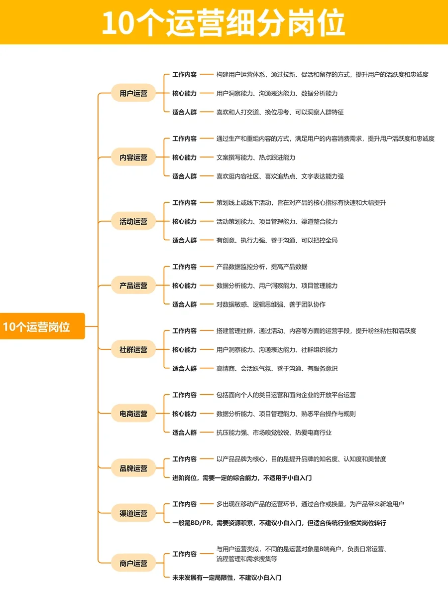 ? 下面,我將為您提供每個職位的工作職責(zé)、核心能力和合適受眾的詳細描述 什么 用戶操作 工作職責(zé):通過招聘、晉升和保留方法提高用戶參與度和忠誠度 核心能力:用戶洞察力、溝通和表達能力、數(shù)據(jù)分析能力 適合的受眾:喜歡與人互動,與他人感同身受,能夠洞察群體的特點 介紹難度: 內(nèi)容操作 工作職責(zé):通過制作和重組內(nèi)容,滿足用戶的內(nèi)容消費需求,提高用戶活躍度和忠誠度 核心能力:文案能力、熱點跟進能力 適合的受眾:喜歡瀏覽內(nèi)容社區(qū),喜歡關(guān)注熱點話題,文字表達能力強 介紹難度: 事件操作 工作職責(zé):規(guī)劃旨在快速顯著提高產(chǎn)品核心指標(biāo)的活動 核心競爭力:活動策劃能力、項目管理能力、渠道整合能力 適合的受眾:有創(chuàng)造力、執(zhí)行力強、善于溝通、能掌控全局 介紹難度: 產(chǎn)品運營 工作職責(zé):產(chǎn)品數(shù)據(jù)監(jiān)測和分析,改進產(chǎn)品數(shù)據(jù) 核心能力:數(shù)據(jù)分析能力、用戶洞察能力、項目管理能力 適合的受眾:對數(shù)據(jù)敏感,邏輯思維強,善于團隊合作 介紹難度: 新媒體運營 工作職責(zé):以運營小紅書等新媒體平臺為主體,以品牌推廣或吸引新客戶為目標(biāo) 核心能力:熱點跟進能力、渠道整合能力、文本表達能力 適合的受眾:精通互聯(lián)網(wǎng),樂于接受新事物 介紹難度: 社區(qū)運營 工作職責(zé):建立管理社區(qū),使用運營方法提高粉絲粘性和活躍度 核心能力:用戶洞察力、溝通和表達能力以及社區(qū)組織能力 適合:高情商、活躍的氛圍、良好的溝通能力和服務(wù)意識 介紹難度: 電子商務(wù)運營 崗位職責(zé):包括個人分類運營、企業(yè)開放平臺運營 適合人群:抗壓能力強,市場意識強,熱愛電子商務(wù)行業(yè) 介紹難度: 品牌運營 工作職責(zé):專注于產(chǎn)品品牌,旨在提高品牌知名度、知名度和聲譽 渠道運營 工作職責(zé):經(jīng)常出現(xiàn)在移動產(chǎn)品的運營中,通過合作或批量交換為產(chǎn)品帶來新用戶 商戶運營 崗位職責(zé):與用戶運營類似,只是目標(biāo)受眾是B端商家,負責(zé)日常運營、流程管理、需求收集