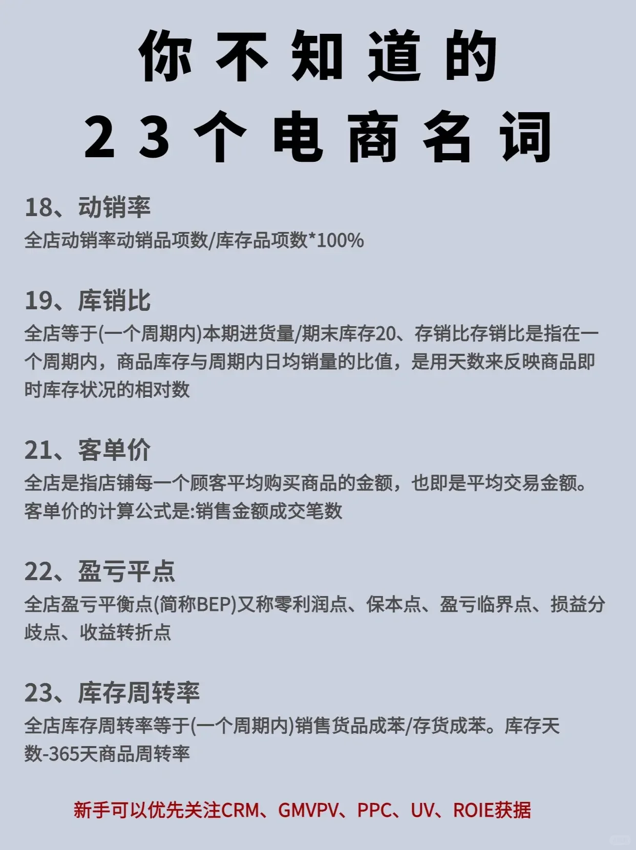 秒懂23個(gè)電子商務(wù)運(yùn)營(yíng)專(zhuān)有術(shù)語(yǔ)! 很多朋友已經(jīng)開(kāi)了一段時(shí)間的店了我仍然不知道電子商務(wù)的專(zhuān)業(yè)術(shù)語(yǔ),在與一些專(zhuān)業(yè)人士交流時(shí),我仍然跟不上節(jié)奏, 所以今天,作為一個(gè)好人,我將為大家整理一些常用的專(zhuān)業(yè)術(shù)語(yǔ),希望對(duì)你的電子商務(wù)有所幫助幫助 1.ERP:供應(yīng)鏈管理,企業(yè)資源規(guī)劃系統(tǒng),是指基于信息技術(shù)的系統(tǒng)化方法管理理念為企業(yè)決策層和員工提供決策和運(yùn)營(yíng)手段的管理平臺(tái)。 2.CRM:客戶(hù)關(guān)系管理 3.投資回報(bào)率:投入產(chǎn)出比=產(chǎn)出/投入 4.SKU:是產(chǎn)品下的一個(gè)分類(lèi)屬性(產(chǎn)品的下一個(gè)顏色或尺寸) 5.DSR:賣(mài)方服務(wù)評(píng)級(jí)系統(tǒng),由三個(gè)指標(biāo)組成:產(chǎn)品描述、服務(wù)和交付速度 6.PPC:平均點(diǎn)擊價(jià)格 7.UV:整個(gè)店鋪每頁(yè)的訪客數(shù)量 8.CPC:一種具有點(diǎn)擊成本的廣告付費(fèi)模式 9.PV:頁(yè)面瀏覽量或點(diǎn)擊量,每次用戶(hù)刷新計(jì)算一次。 10.GMV:GMV是一個(gè)流程,只要你下了訂單并生成了訂單號(hào),它就被認(rèn)為是GMV。 11.SEO:搜索引擎優(yōu)化 12.CTR:廣告點(diǎn)擊率 13.CRM:客戶(hù)管理系統(tǒng) 14.CPM:每千次曝光的成本 15.EDM:電子郵件營(yíng)銷(xiāo) 16.KPI:關(guān)鍵績(jī)效指標(biāo)法 17、毛利率:銷(xiāo)售毛利率=已實(shí)現(xiàn)毛利率金額/已實(shí)現(xiàn)銷(xiāo)售收入*100%。 18:銷(xiāo)售率:公式為:銷(xiāo)售項(xiàng)目數(shù)/庫(kù)存項(xiàng)目數(shù)*100%。 19.庫(kù)存與銷(xiāo)售比率:等于(一個(gè)周期內(nèi))本期采購(gòu)數(shù)量/期末存貨 20、銷(xiāo)存率:銷(xiāo)存率是指一個(gè)周期內(nèi)產(chǎn)品庫(kù)存與日均銷(xiāo)售額的比值。它是一個(gè)相對(duì)數(shù)字,以天為單位反映產(chǎn)品的實(shí)時(shí)庫(kù)存狀態(tài) 21.客單價(jià):指每位顧客在店內(nèi)購(gòu)買(mǎi)商品的平均金額,也是平均交易金額。單價(jià)的計(jì)算公式為:銷(xiāo)售額÷交易筆數(shù) 22.盈虧平衡點(diǎn):盈虧平衡點(diǎn)(BEP),也稱(chēng)為零利潤(rùn)點(diǎn)、盈虧平衡點(diǎn)、盈虧均衡點(diǎn)、盈虧分歧點(diǎn)、利潤(rùn)轉(zhuǎn)折點(diǎn) 23.存貨周轉(zhuǎn)率:等于一個(gè)周期內(nèi)售出的貨物成本/存貨成本。庫(kù)存天數(shù)=365天÷產(chǎn)品周轉(zhuǎn)率
