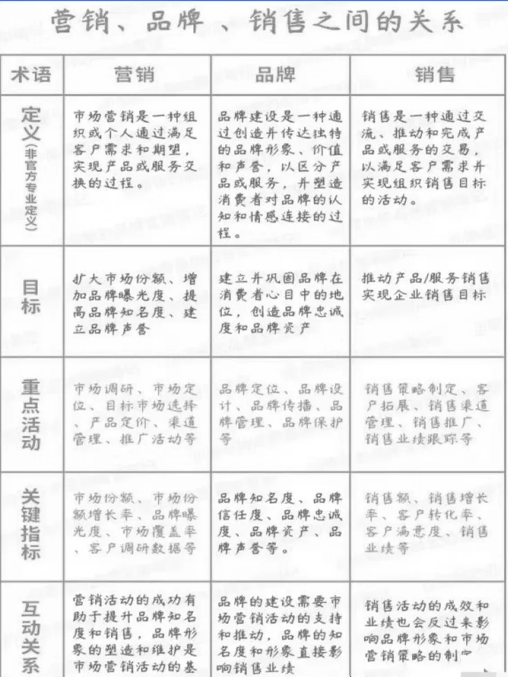 公司內(nèi)部可能有市場部、品牌部和銷售部,所有這些部門都經(jīng)常發(fā)生戰(zhàn)斗。那么,我們?nèi)绾螌崿F(xiàn)質(zhì)量與效率的融合,并將其與銷售業(yè)績緊密結(jié)合呢 首先,明確三者的關(guān)系和作用: 營銷是滿足用戶期望,實施銷售策略或活動支持,吸引客戶,提高銷售目標,搶占市場份額; 品牌是管理品牌資產(chǎn),傳播公司產(chǎn)品和形象,塑造用戶心智,提高品牌溢價,協(xié)助銷售打動客戶;銷售是利用品牌和產(chǎn)品優(yōu)勢解決用戶問題,推動產(chǎn)品或服務(wù)的收入表現(xiàn),實現(xiàn)公司目標。最終,公司需要看到銷售業(yè)績。 建議將這三種方法結(jié)合起來: 1.常用,吸引客戶并將其交付給銷售部門 2.制定營銷和銷售策略(如新定價、渠道流量、渠道管理等),并統(tǒng)一投放市場 3.市場營銷活動,以銷售額發(fā)起市場銷售活動,設(shè)定目標,簽署任務(wù)書,高激勵。。。營造儀式感,線上線下同步 4.品牌和產(chǎn)品的營銷活動(如產(chǎn)品發(fā)布會、投資博覽會、展覽等) 5、針對營銷模式下的自媒體矩陣的構(gòu)建,突出其重要性?,F(xiàn)在抖音等短視頻的流行讓目標用戶更容易觸達,這也是大多數(shù)公司必須要做、也想做好的項目。
