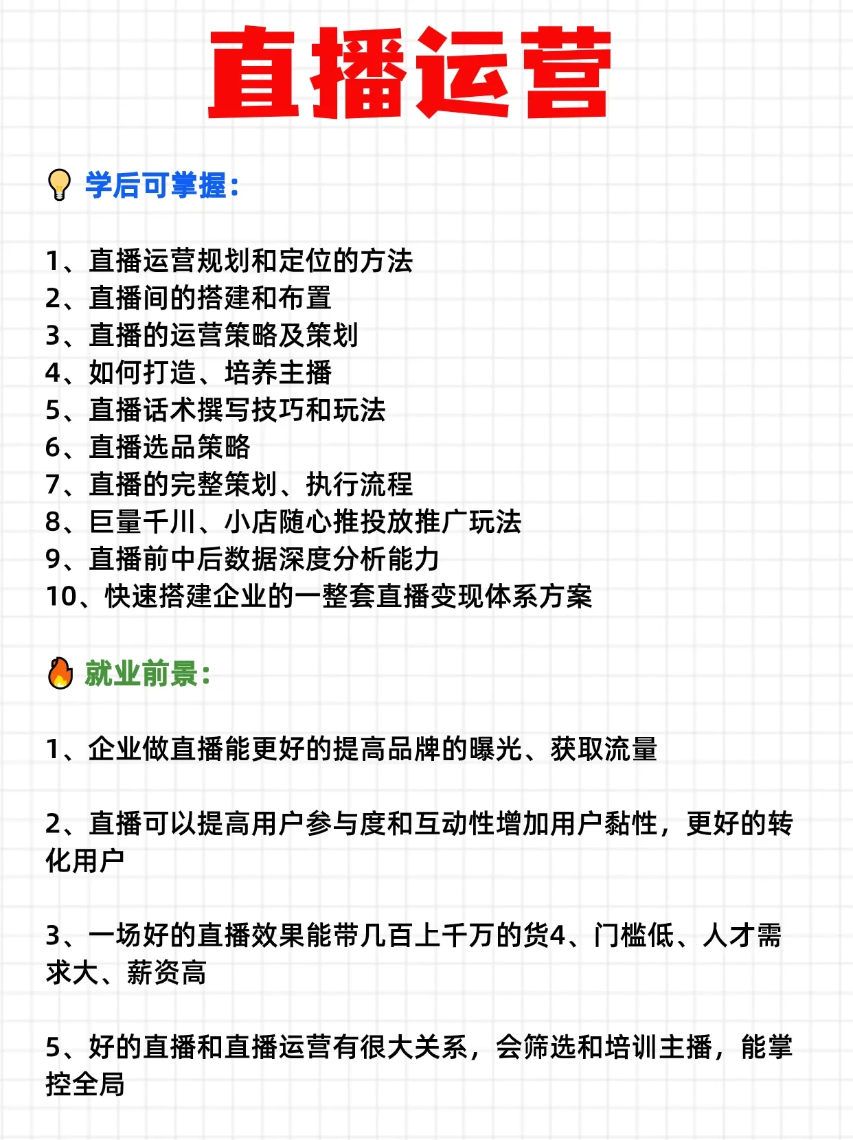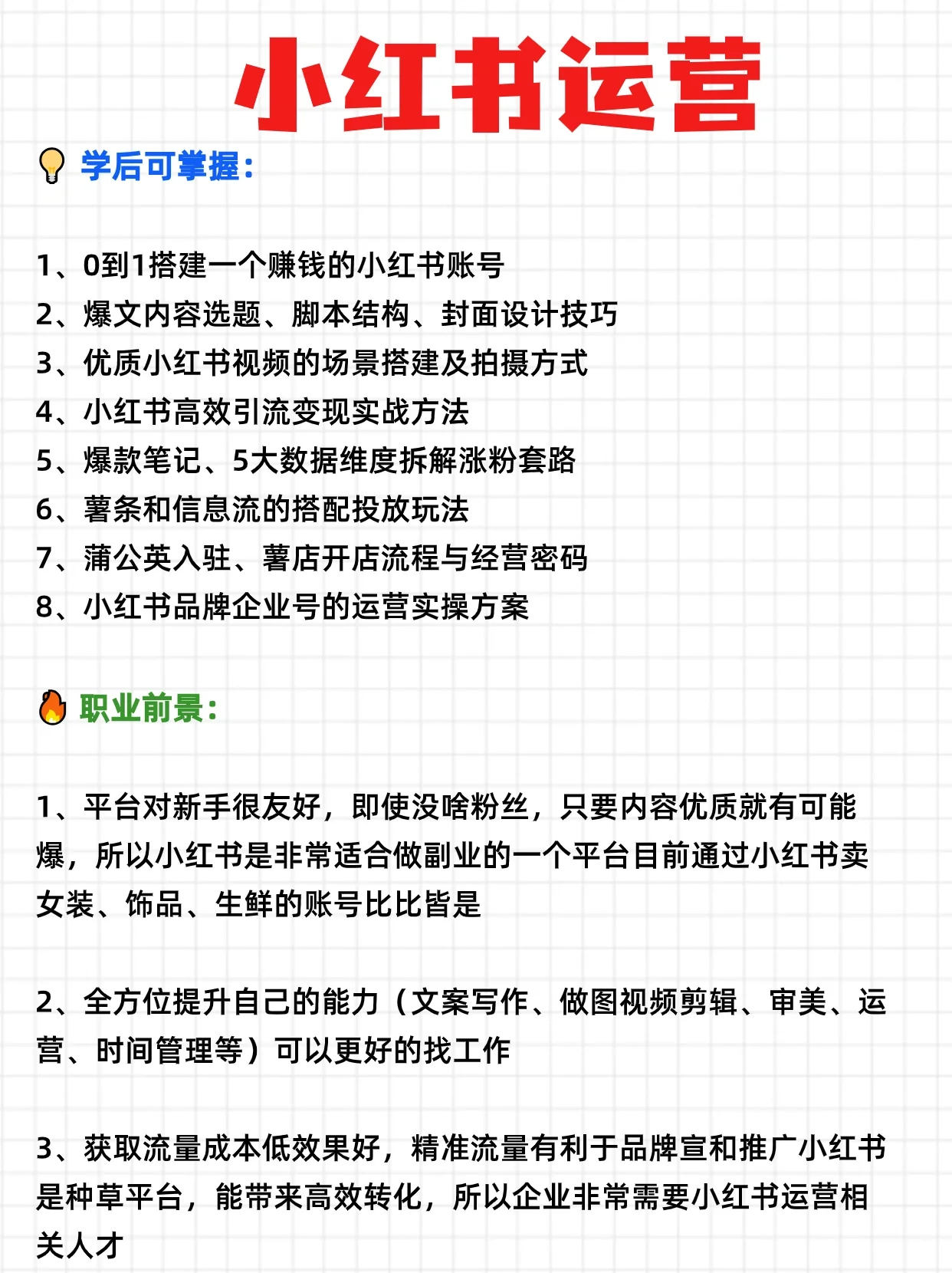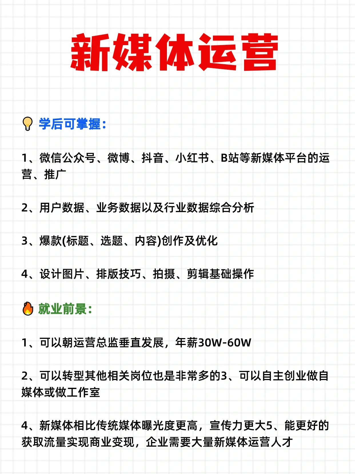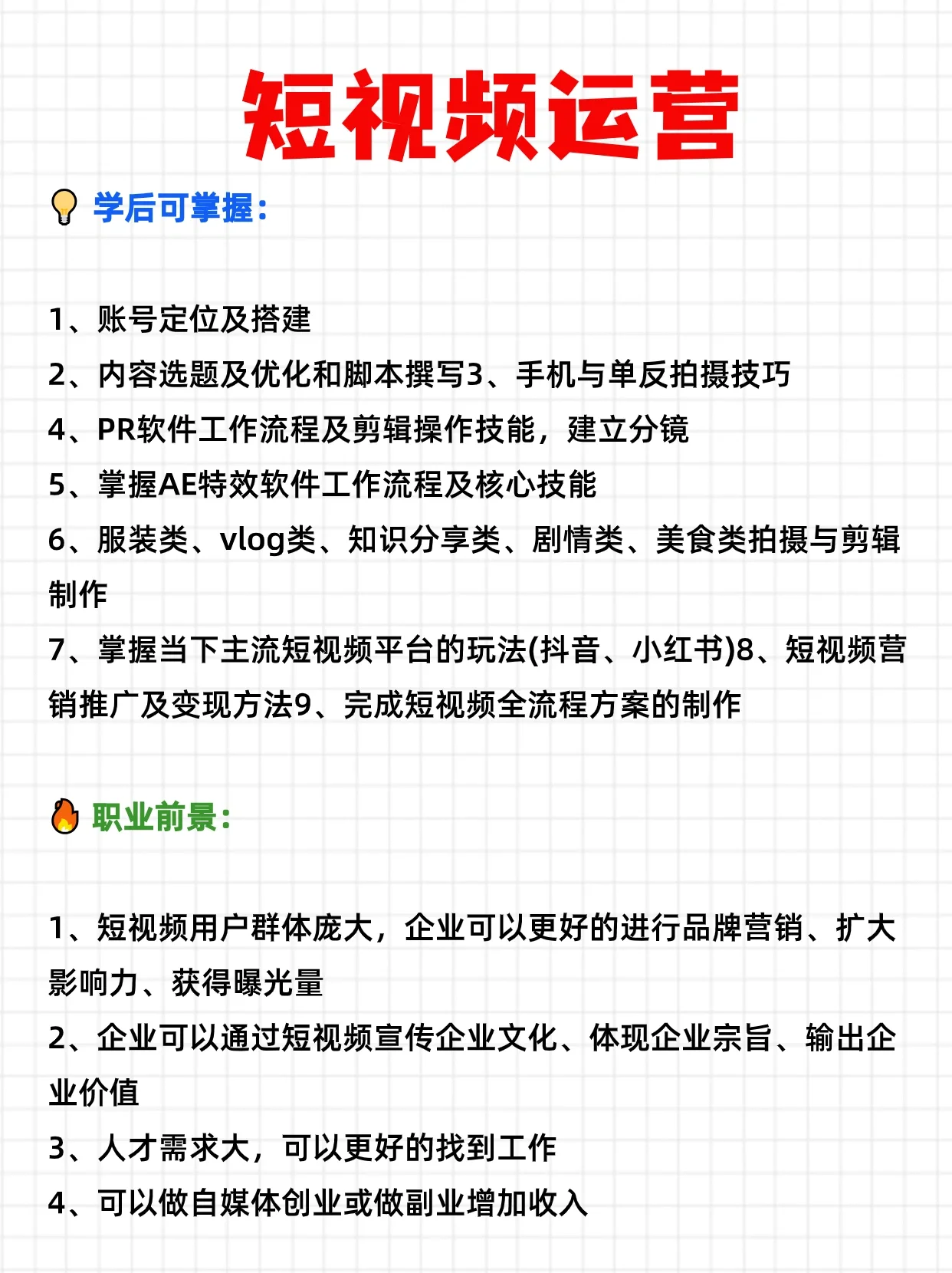 總結(jié)新媒體運營的本質(zhì) 大師級平臺運營:微信公眾號、微博、抖音、小紅書、B站等 數(shù)據(jù)分析:用戶、業(yè)務(wù)和行業(yè)數(shù)據(jù)的綜合分析? 熱門創(chuàng)作:標題、選題和內(nèi)容優(yōu)化 設(shè)計技巧:圖像布局、拍攝和編輯的基本操作 就業(yè)前景 年薪30W-60W的運營總監(jiān) 是否過渡到相關(guān)職位 創(chuàng)業(yè):自媒體還是工作室 新媒體>傳統(tǒng)媒體曝光 商業(yè)貨幣化,企業(yè)需求 短視頻運營介紹 學(xué)習(xí)成果 帳戶定位和設(shè)置: 選題和寫劇本 拍攝技巧:手機和單反 公關(guān)軟件編輯技巧 AE特效軟件核心技能 多種類型的拍攝和制作:服裝、視頻博客、知識分享、情節(jié)、食物 如何在短視頻平臺上玩:抖音、小紅書 營銷推廣和貨幣化 全流程計劃生產(chǎn) 職業(yè)前景 品牌營銷和擴大影響力 傳達企業(yè)文化和價值觀 人才需求大 自我媒體創(chuàng)業(yè)還是副業(yè)機會 小紅書的運營重點是什么 掌握技能: 帳戶設(shè)置: 爆炸性文章的選題和腳本結(jié)構(gòu) 視頻場景拍攝 如何將引流貨幣化 數(shù)據(jù)分析和獲得追隨者的技術(shù) 廣告投放策略 如何開設(shè)和經(jīng)營店鋪 品牌企業(yè)賬戶運營 就業(yè)機會 新手友好,爆炸幾率高 全面的技能提升: 低成本高效率的流量獲取 直播運營核心 技能掌握 運營規(guī)劃和定位 直播間布局 運營戰(zhàn)略和規(guī)劃 建造和培養(yǎng)錨 腳本編寫和游戲: 產(chǎn)品選擇策略: 完成計劃和執(zhí)行 廣告投放策略 數(shù)據(jù)分析 企業(yè)直播貨幣化系統(tǒng) 職業(yè)前景 品牌曝光和流量獲取 用戶參與度和轉(zhuǎn)化率 高效低門檻的直播 高需求高薪水 重要性:篩選培訓(xùn)主播