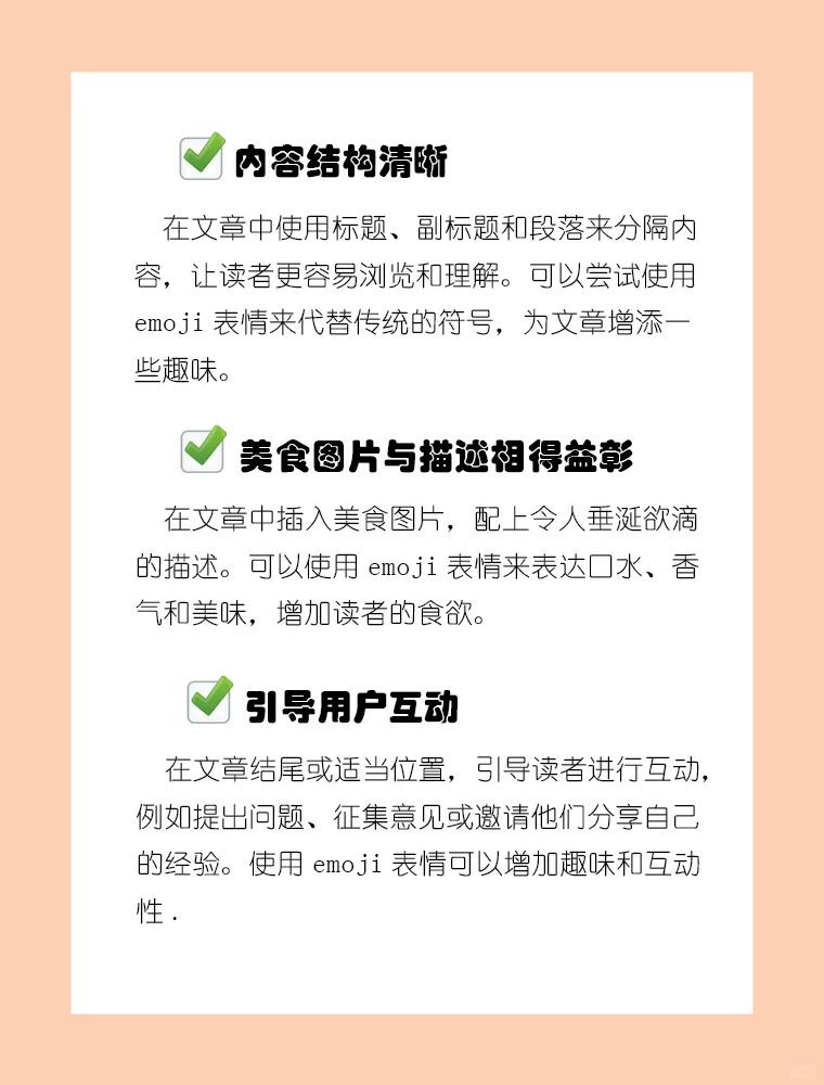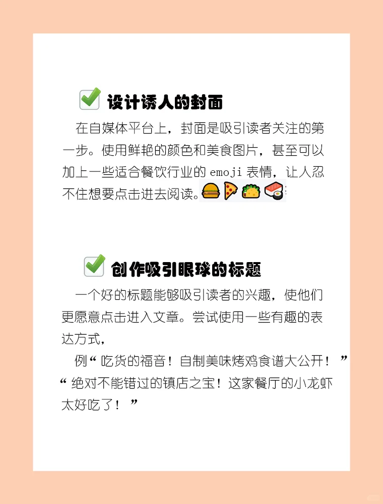 每天跟隨我學(xué)習(xí)新媒體運(yùn)營技巧 隨著新媒體的普及,餐飲業(yè)越來越多的促銷方式在網(wǎng)上推廣。那么,餐飲業(yè)應(yīng)該如何通過自媒體吸引流量呢看完這篇文章,你就會(huì)知道~ 設(shè)計(jì)一個(gè)誘人的封面 創(chuàng)建引人注目的標(biāo)題 清晰的內(nèi)容結(jié)構(gòu) 食物圖片與描述相得益彰 引導(dǎo)用戶交互