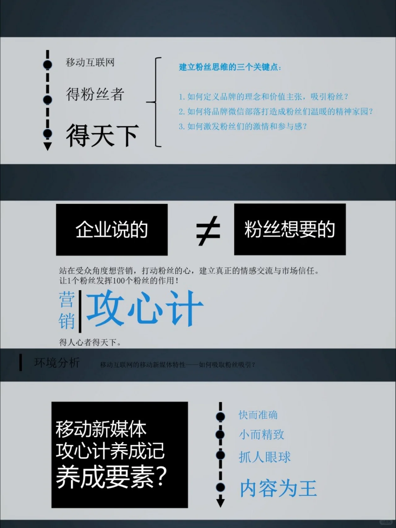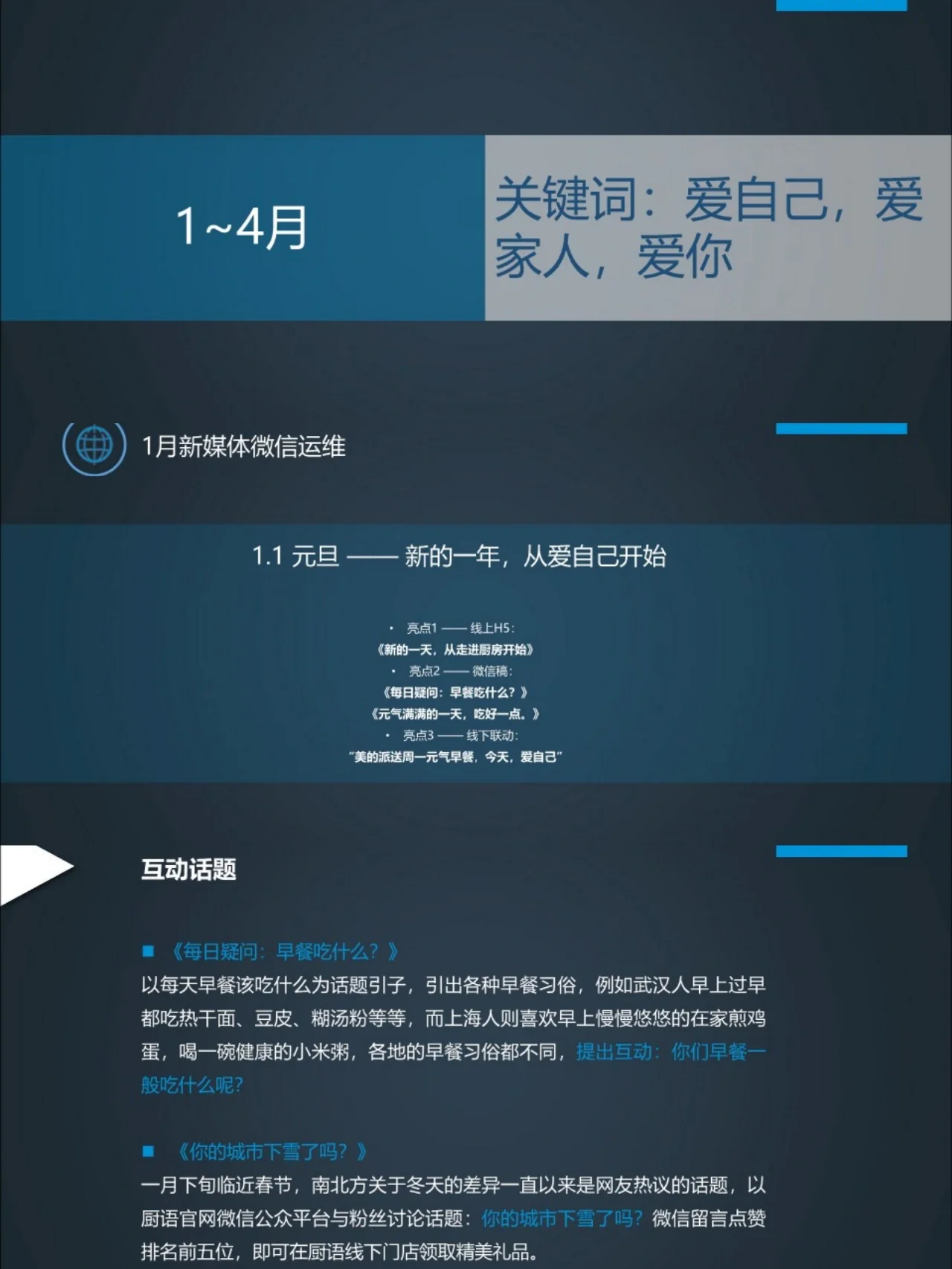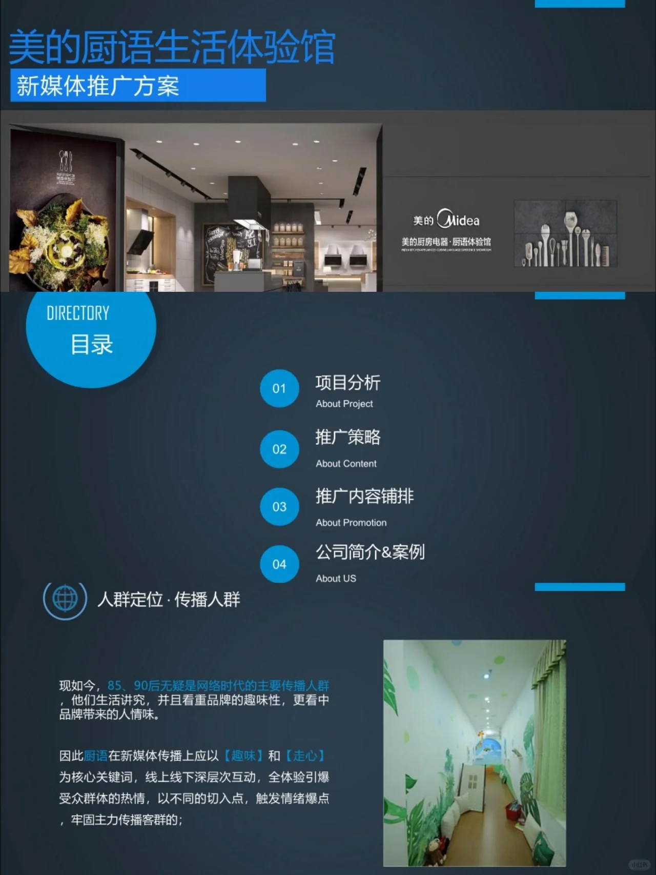 ? 今天我們來分析一下美的廚語生活體驗(yàn)館的新媒體推廣計(jì)劃 ?? 項(xiàng)目分析 ·項(xiàng)目定位 ·人口分析:傳播者與消費(fèi)者 ·競爭分析 ?? 推廣策略 ·創(chuàng)建平臺角色 ·建立粉絲心態(tài) ·移動新媒體內(nèi)容為王 ?? 推廣內(nèi)容布局 ·思路建設(shè) ·營銷布局 ·分階段關(guān)注運(yùn)營和互動 空間有限,內(nèi)容呈現(xiàn)不完整