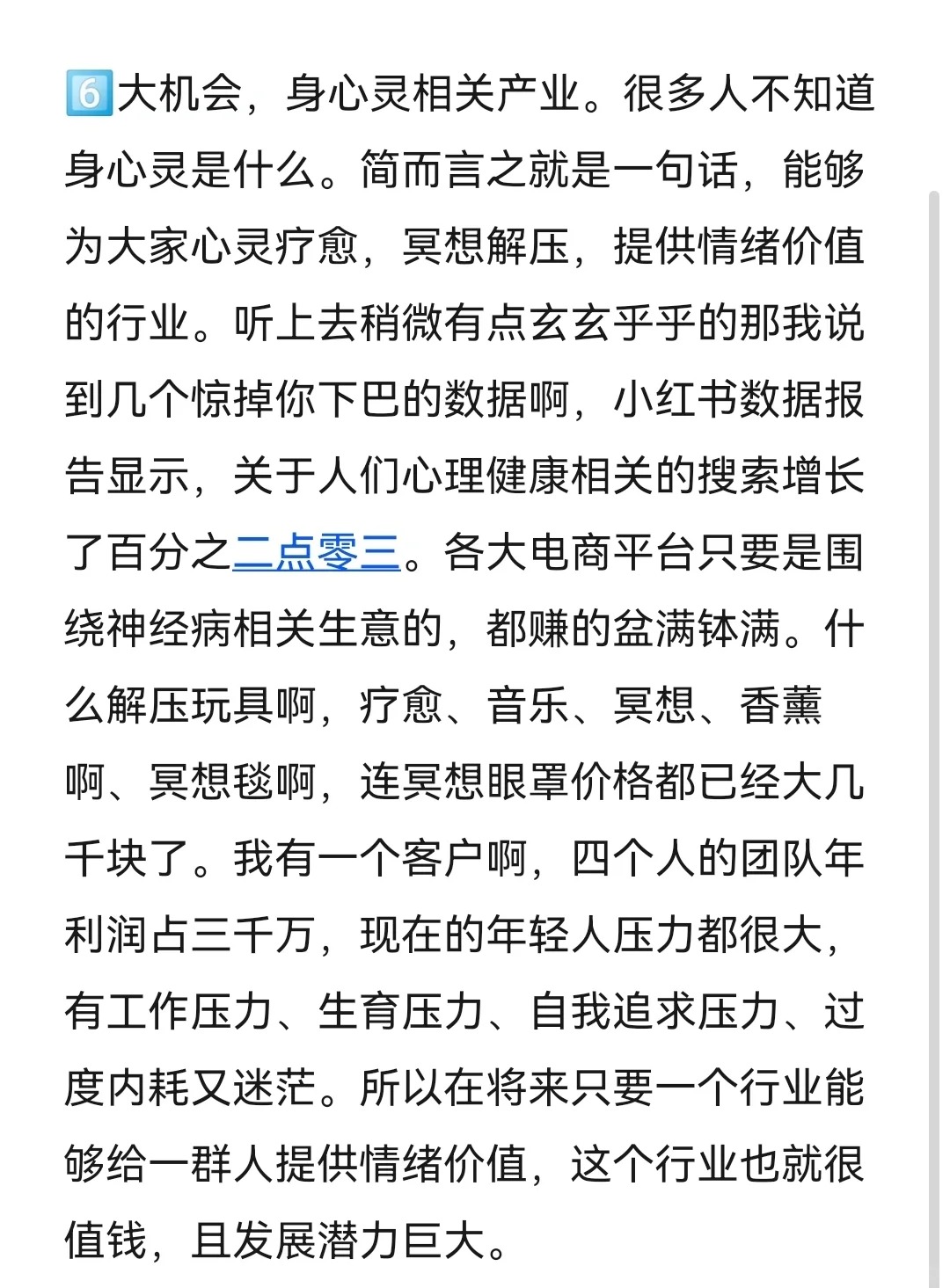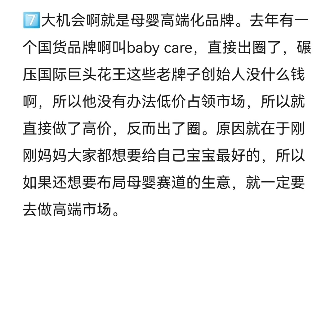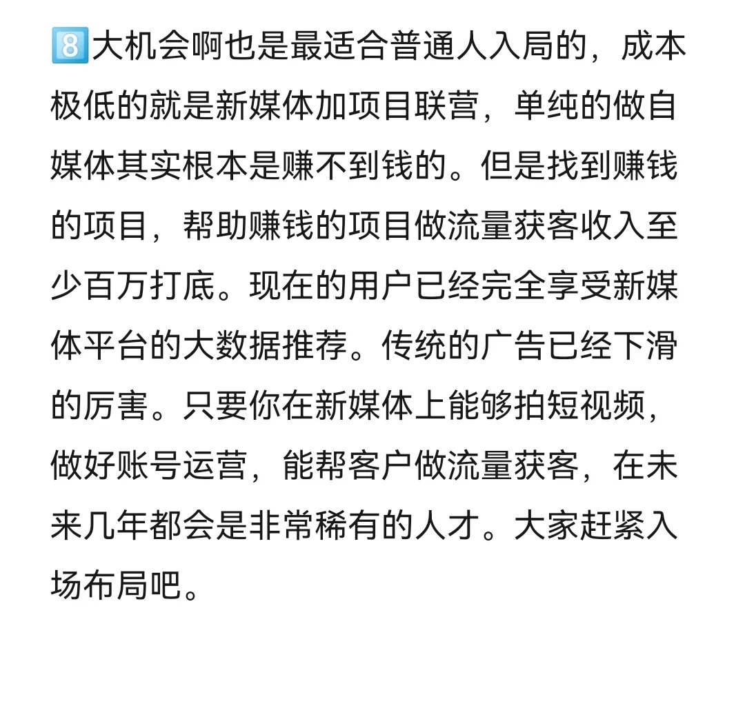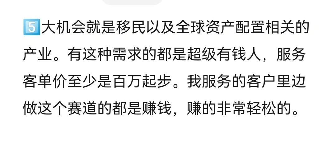 所有實現(xiàn)財務(wù)自由的人,都是在風(fēng)口行業(yè)猛干幾年賺到錢出來,躺平等下一個風(fēng)口。2023年,我們會迎來一次各行各業(yè)的大洗盤。這條筆記我會一次性講清楚,搞錢的機會究竟在哪里。數(shù)據(jù)呢都是來自于我身邊貨真價實的案例。 個風(fēng)口行業(yè)就是殯葬行業(yè),很多人都會覺得產(chǎn)業(yè)門檻太高了,但實際并不是因為你要走到最后一步,它才是高門檻的。當(dāng)然你做一個周邊的需求也非常賺錢。比如我的客戶家屬在思域也是賣骨灰盒的,單價在幾百塊到幾十萬不等,而且他只做了這一個品類。最離譜的是骨灰盒,還有愛馬仕限量款l v新款。反正就是只要你有錢啊,啥都能給你做出來。當(dāng)時呢我還問他,你們做電商平臺了嗎?他們說當(dāng)然做了,而且這個生意是完全沒有差評的,就是殯葬行業(yè)啊,真的是不缺客戶。大家覺得這個生意不吉利,但是它未必不是一個好生意。 個超級大的機會啊,旅游行業(yè)會大規(guī)模的爆發(fā)。大家應(yīng)該關(guān)注一下露營經(jīng)濟這種近郊旅游,大家對于戶外野營啊已經(jīng)培養(yǎng)了很多的興趣。什么沖鋒衣啊、大黃靴啊、漁夫帽啊、爐爐煮茶這些銷量啊都是直線增長的。所以,為近郊旅游提供相關(guān)服務(wù)的產(chǎn)業(yè),大家可以長期去做。 個大的風(fēng)口,小餐飲創(chuàng)業(yè)項目,2022年最火的是什么?預(yù)制菜標(biāo)準(zhǔn)化連鎖餐飲。但是千篇一律的標(biāo)準(zhǔn)化啊,也喪失了很多的煙火氣息,大家更想吃到的是本土特色,地方風(fēng)味。那有需求就有市場,有不少人就萌生了這種創(chuàng)業(yè)的想法,這種投資小,成本低,一百個攤兒收現(xiàn)金流的生意。反而在這個時代大家都特別看好我的社群學(xué)院里面就有做非常小的餐飲擺攤項目培訓(xùn)的自己。一個人做到了年入百萬。 大機會啊就是銀發(fā)經(jīng)濟很多人的視野,它只局限于怎么賺年輕人的錢。但這一屆年輕人不婚不育,又開始克制消費,反而老年市場有巨大的機會。現(xiàn)在很多老年人的一頂假發(fā),價格都是萬元起步,什么上門養(yǎng)老呀、老人陪護呀,提升健康,老年相親,全部都是商機,而且這個生意啊值得大家深耕很多年。因為現(xiàn)在老齡化越來越嚴(yán)重,所以布局養(yǎng)老行業(yè)做一米寬一百米深的事兒,反而是最正確的。