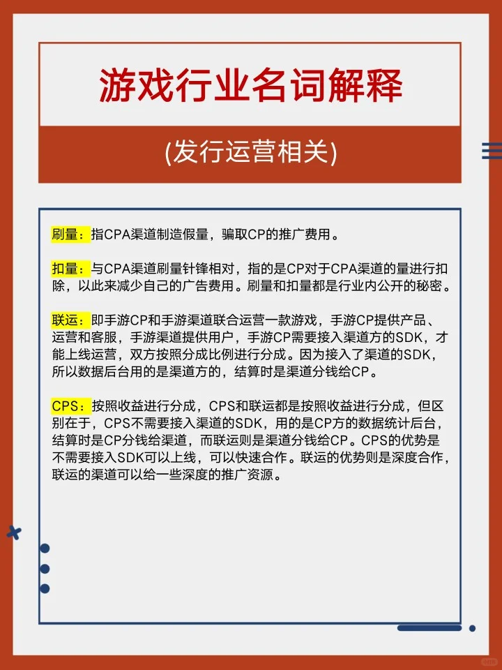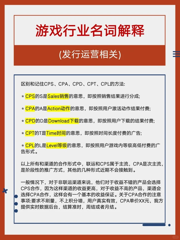記得在面試前看一下行業(yè)術語解釋,當你在面試中聽到它們時不要感到困惑![笑和哭R] 區(qū)分和記憶CPS、CPA、CPD、CPT和CPL的方法: CPS的s代表銷售額,這意味著根據銷售結果劃分銷售額; 注冊會計師的A表示動作,即根據用戶激活的動作結果進行支付; CPD的D表示下載,即根據用戶的下載結果付費; CPT中的T表示時間,即根據時間長度付費的廣告; CPL的L表示級別,這是一種基于用戶游戲內級別的付費廣告格式。