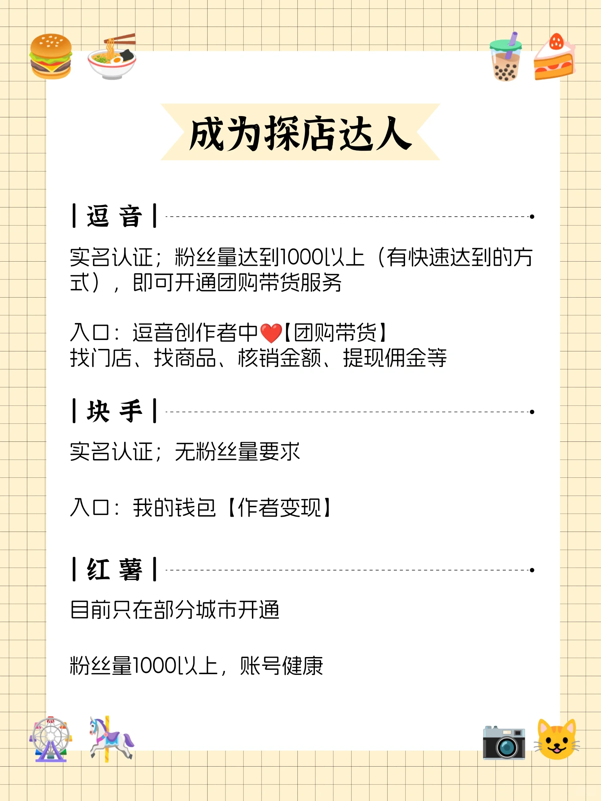 說到餐廳探險(xiǎn)專家,很多人會想到那些到處吃吃喝喝的美食專家 —— 事實(shí)上,除了食品(餐廳),所有有實(shí)體店的線下商家都可以“探索” —— ? 探索商店類別(圖2) 一?? 餐飲 二?? 葡萄酒旅行 三?? 休閑娛樂 四?? 生活服務(wù) ? 統(tǒng)稱為當(dāng)?shù)厣罘?wù) ? 你可以選擇單一的賽道,如專門從事餐飲(美食專家)、白酒和旅游(旅游專家);你也可以選擇一條全面的賽道,做任何事情 —— ? 什么是探索商店 在實(shí)體店體驗(yàn)產(chǎn)品或服務(wù)并分享經(jīng)驗(yàn) 沒有商業(yè)模式的探店:互聯(lián)網(wǎng)平臺種草或拔草,純內(nèi)容共享 以商業(yè)模式探店:互聯(lián)網(wǎng)平臺種草引流門店,實(shí)現(xiàn)內(nèi)容變現(xiàn) —— ? 探索門店商業(yè)模式 一?? 商家或代理運(yùn)營商可以在平臺上發(fā)起團(tuán)購,并設(shè)置CPS傭金 二?? 在專家現(xiàn)場參觀商店后,平臺發(fā)布帶有POI(商店位置)的內(nèi)容(視頻或文本) 三?? 用戶可以查看影響者的內(nèi)容,點(diǎn)擊提供的POI,跳轉(zhuǎn)到團(tuán)購頁面下單,驗(yàn)證他們在商店的消費(fèi),并從影響者那里獲得CPS傭金收入 四?? 商家或代理運(yùn)營商投資銷售業(yè)績好的有影響力的人的視頻 —— ? 探店收入構(gòu)成 一?? 車馬費(fèi) 根據(jù)影響者級別、粉絲群等,有50到1000個(gè)選項(xiàng)+ 二?? CPS傭金收入 有很多實(shí)體餐飲店,銷售額高,傭金低 休閑娛樂,生活服務(wù)高傭金 三?? 商業(yè)訂單 四?? 探索商店直播 五?? 收頭(割韭菜) —— ? 訂單渠道 一?? 平臺商人廣場 二?? 專家組 三?? 本地生活MCN 四?? 第三方代理運(yùn)營商 ? 訂單流程:注冊->商家反向選擇->參觀拍攝->剪輯成電影->商家審核成電影->審批上映->運(yùn)輸運(yùn)輸費(fèi)用結(jié)算 —— ? 探索存儲方法 一?? 合作探店:免費(fèi)吃喝玩樂,體驗(yàn)(交流),收取商家運(yùn)輸費(fèi),發(fā)布需要商家審批的視頻。如果它不好,就不能說它不好 二?? 自費(fèi)逛店:自己花錢錢坦典,優(yōu)點(diǎn)是發(fā)送視頻不需要商家審核,可以真實(shí) 三?? 云探索店:商家或第三方運(yùn)營商拍好素材照片,云編輯,無需在店內(nèi)實(shí)體探索,簡單但低成本 —— ? 如何成為店鋪探索專家(圖3) 主流平臺:豆聲音,塊手,紅的馬鈴薯 —— ? 優(yōu)點(diǎn)和缺點(diǎn) 一?? 優(yōu)點(diǎn):門檻低,還可以圖文帶貨,任何人都可以做,可以做副業(yè);自由體驗(yàn)(白色浮子[doge]);它與粉絲數(shù)量無關(guān),因此很容易下單 二?? 缺點(diǎn):參與人數(shù)過多,頭部相對固定,競爭激烈;但仍有機(jī)會認(rèn)真對待? 機(jī)會,加入當(dāng)?shù)氐纳罘绞組CN會更好 —— ? 其他相關(guān)職位 一?? 業(yè)務(wù)拓展(BD):與商家洽談合作,在平臺上發(fā)起團(tuán)購 二?? 專家操作:線上線下團(tuán)購,招募探店專家?guī)ьI(lǐng)銷售等 ——