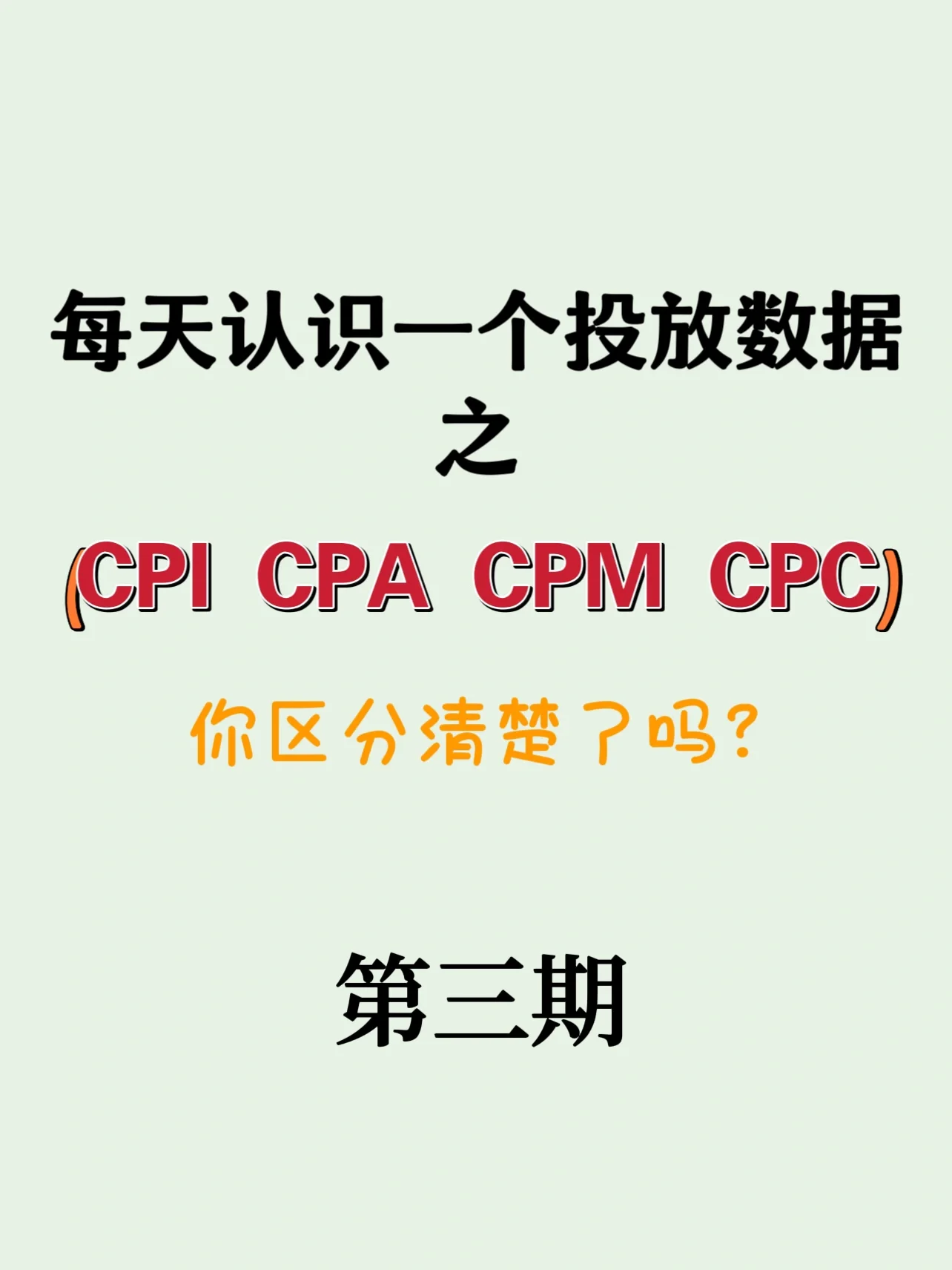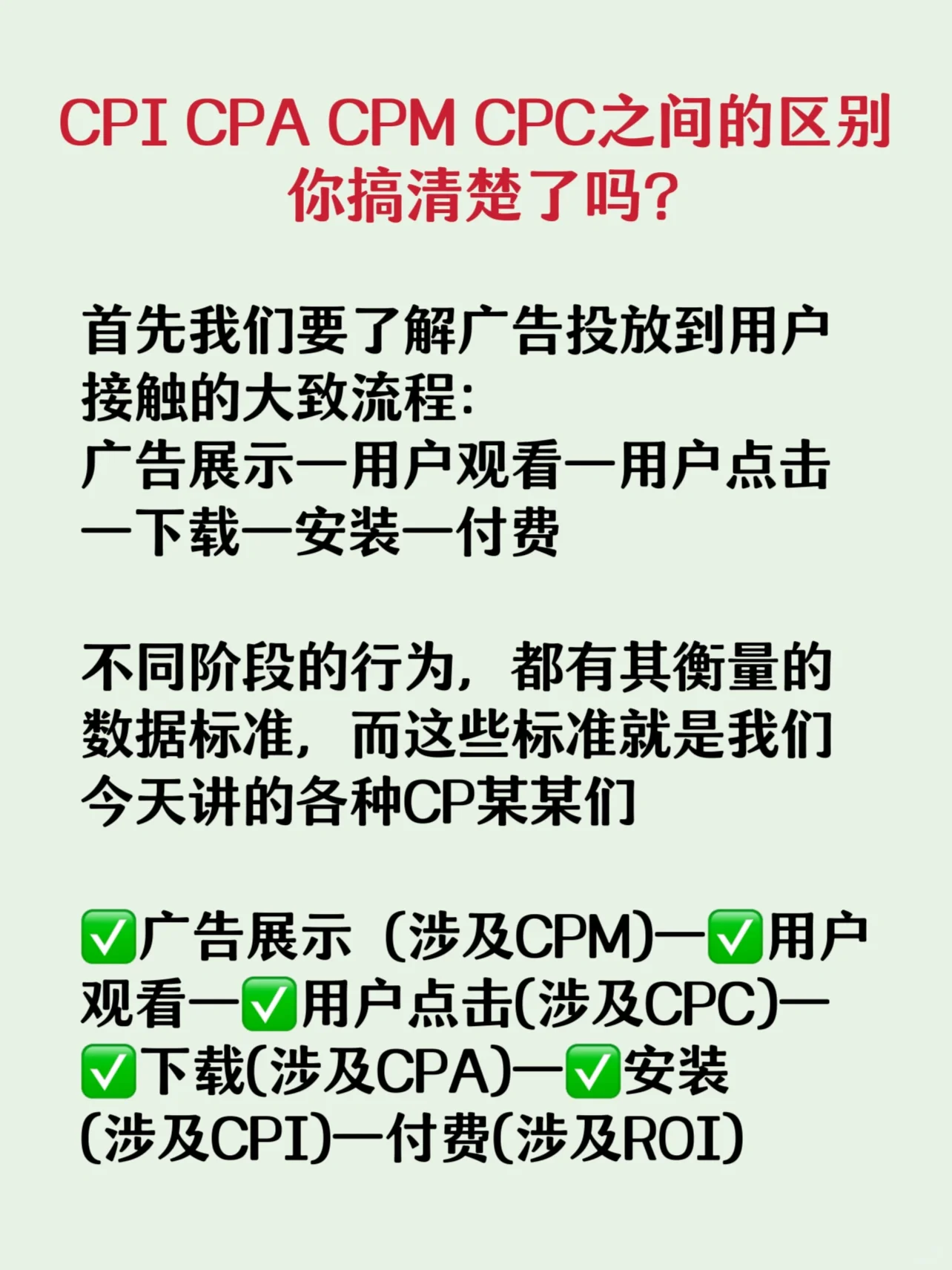 許多新生兒問我如何區(qū)分CPI和CPA 首先,我們需要了解從廣告投放到用戶聯(lián)系的大致過程: 廣告展示-用戶觀看-用戶點擊-下載-安裝-支付 行為的不同階段都有自己的數(shù)據(jù)測量標準,這些標準就是我們今天討論的各種CP 廣告展示(涉及CPM)-用戶觀看-用戶點擊(涉及CPC)-下載(涉及CPA)-安裝(涉及CPI)-支付(涉及ROI) CPM 每英里成本的縮寫,每千次印象的成本/費用 (有些新寶寶可能會想:為什么不是一筆展示費呢可以理解為,由于廣告的展示量一般都比較大,所以用千次印象來計算更方便。) CPC 每次點擊成本的縮寫 注冊會計師 “每次操作成本”的縮寫,即單個交互的成本/支出 這種互動可以包括注冊、重定向到某個頁面、安裝等,具體取決于您在創(chuàng)建廣告時選擇的出價方法 居民消費價格指數(shù) 單次安裝成本的縮寫 除了CPL(每個潛在客戶的成本單個潛在客戶成本;每個銷售的CPS成本單個銷售成本)之外,這四種方法也很常用 記住這些數(shù)據(jù)的關(guān)鍵實際上是記住英文全名的最后一個單詞! 你今天學(xué)習(xí)完這組數(shù)據(jù)了嗎