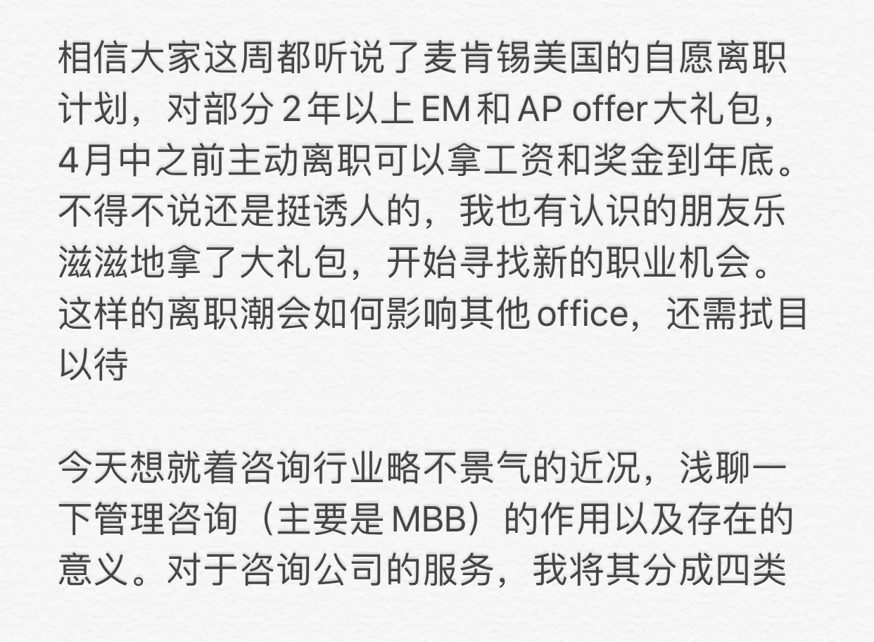 相信大家都聽說(shuō)過(guò)麥肯錫本周在美國(guó)提出的自愿辭職計(jì)劃。對(duì)于一些EM和AP提供的兩年以上的套餐,如果你在4月中旬之前自愿辭職,你可以獲得工資和獎(jiǎng)金,直到年底。不得不說(shuō),這很誘人,我也有一些朋友很樂意接受大禮包,開始尋找新的職業(yè)機(jī)會(huì)。這一波辭職潮將如何影響其他辦公室還有待觀察 今天,我想簡(jiǎn)單談?wù)劰芾碜稍儯ㄖ饕荕BB)在當(dāng)前略顯低迷的咨詢行業(yè)中的作用和意義。對(duì)于咨詢公司的服務(wù),我將其分為四類(詳見圖片): 槍手和說(shuō)客:無(wú)需多說(shuō) [2R]基本員工:企業(yè)通常需要對(duì)問題做出快速?zèng)Q策,咨詢公司提供全面、及時(shí)的信息并提供解決方案 【三R】高端員工:當(dāng)企業(yè)面臨重大影響時(shí),咨詢公司通過(guò)創(chuàng)新的方法指導(dǎo)企業(yè)度過(guò)轉(zhuǎn)型的痛苦 【四個(gè)R】精神導(dǎo)師:對(duì)于許多高管來(lái)說(shuō),咨詢公司的高級(jí)合伙人可能是他們的精神導(dǎo)師 我認(rèn)為目前咨詢業(yè)的低迷可能是由于: 1.隨著主要企業(yè)預(yù)算的減少,對(duì)必需品的需求也在減少 對(duì)2的更多需求正在轉(zhuǎn)向內(nèi)部或更便宜的咨詢公司 大約有三個(gè)家庭還沒有生產(chǎn)出他們的下一個(gè)大武器 4可以遇到但不尋求,或者更多可以轉(zhuǎn)向個(gè)人咨詢 對(duì)于MBB來(lái)說(shuō),突破可能在于比替代解決方案更好地滿足第二類需求,同時(shí)實(shí)現(xiàn)第三類服務(wù)的突破