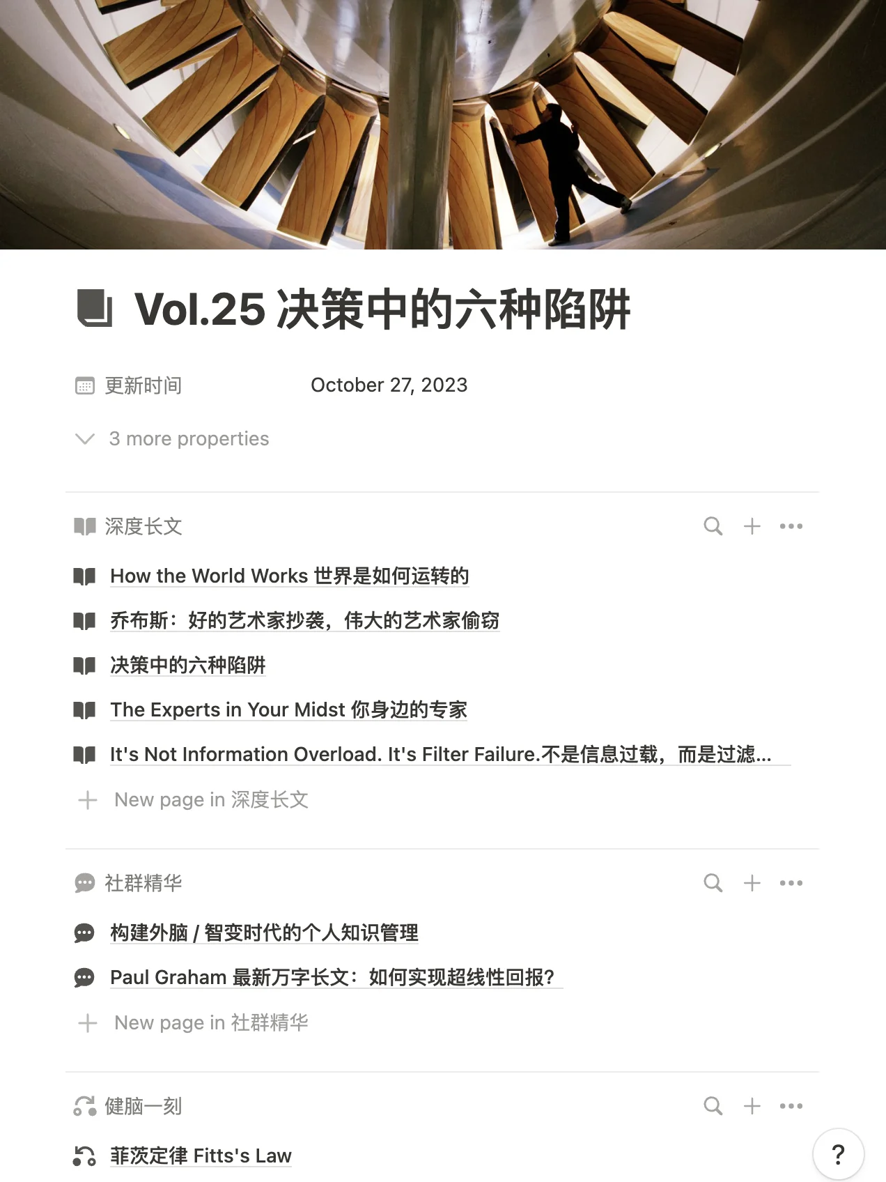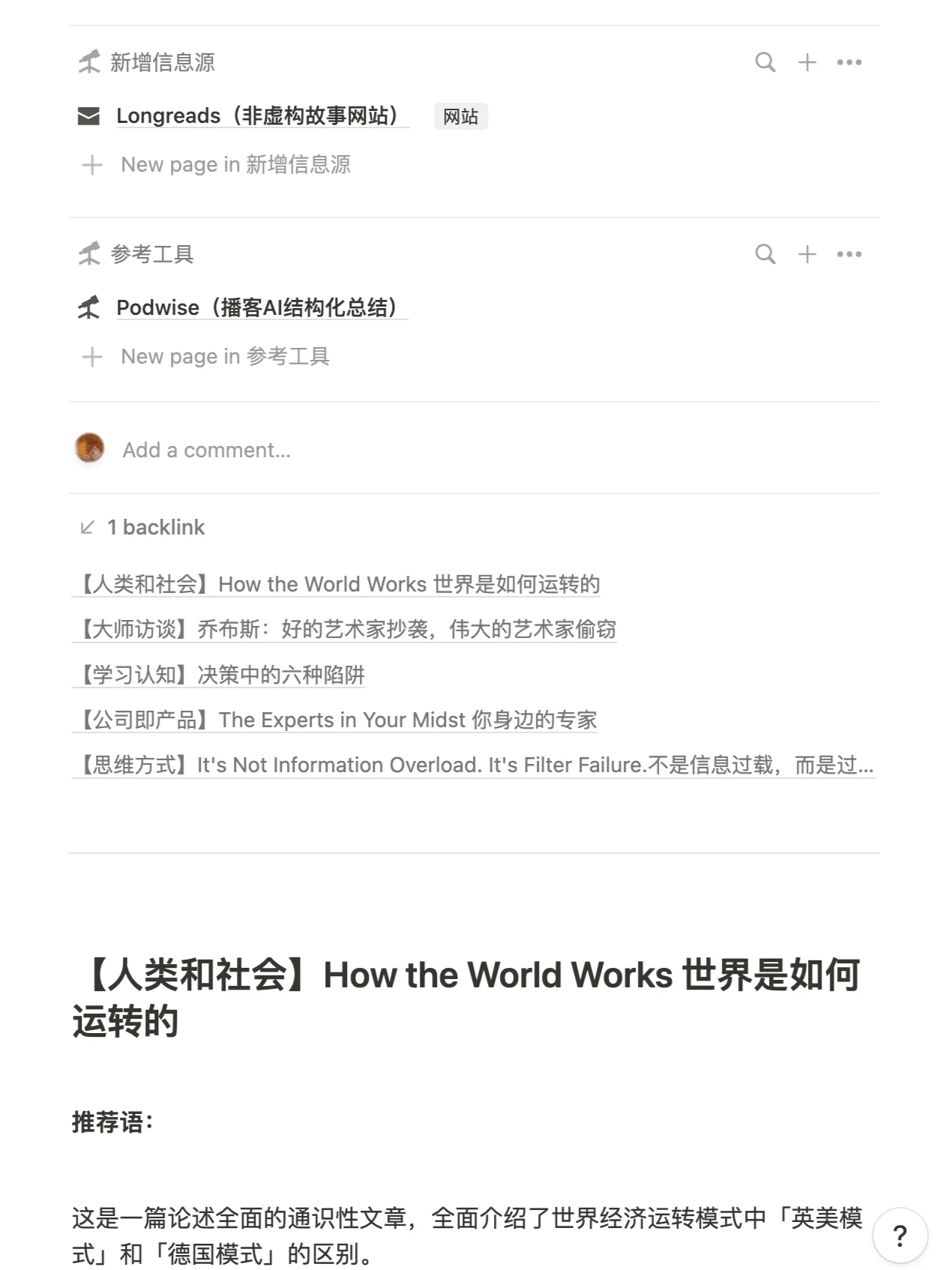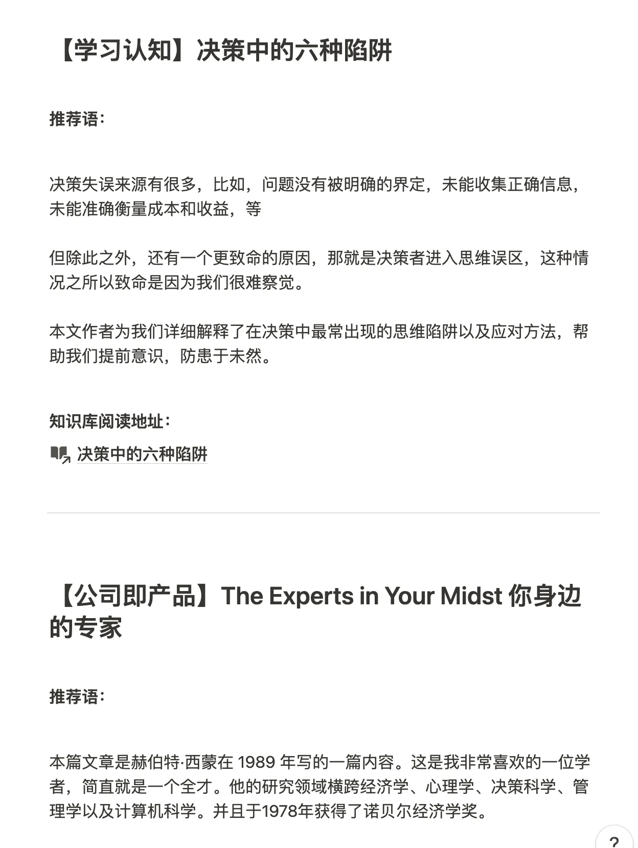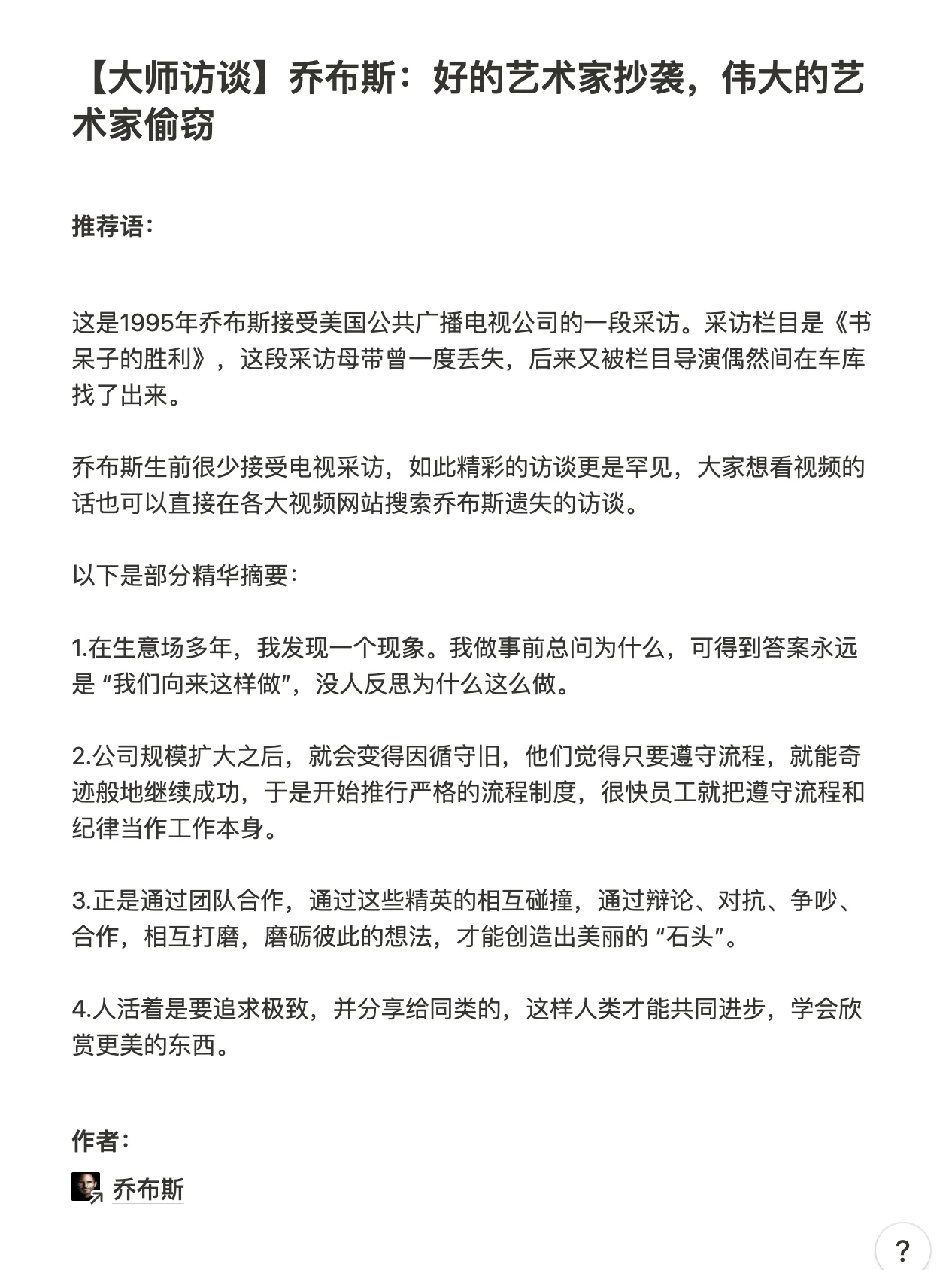 本文來自“參考策展服務” · 本次策展包括編輯精選的5篇深度文章(附于EPUB/PDF電子周刊)、小組成員分享的2篇高質量內容、1篇健腦思維練習、1個新信息源和一個參考工具。 · 涉及思維、產(chǎn)品、認知和社會等領域。 · 1、 精選長文 世界是如何運作的 【大師訪談】史蒂夫·喬布斯:好藝術家剽竊,偉大藝術家剽竊 決策的六大陷阱:學習認知 你中間的專家 這不是信息過載,而是過濾器故障。這不是信息過載,而是過濾器故障 · 2、 社區(qū)本質 構建外部大腦/智能轉型時代的個人知識管理 Paul Graham的最新萬字文章:如何實現(xiàn)超線性收益 · 附件:腦力鍛煉-Fitts定律 新信息來源-Longreads(非虛構故事網(wǎng)站) 參考工具-播客(播客AI結構化摘要)