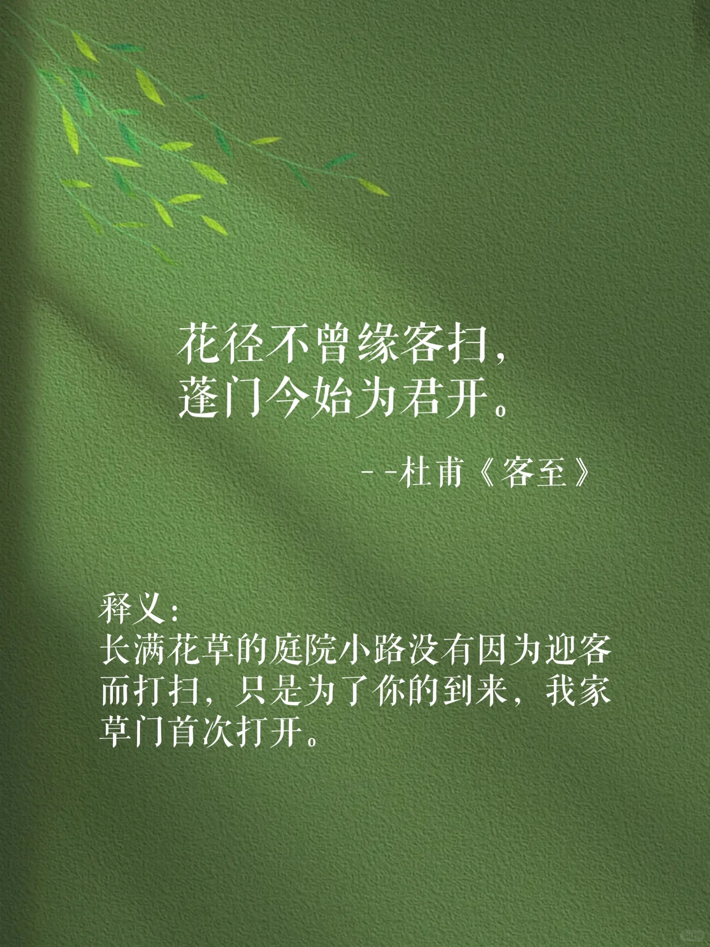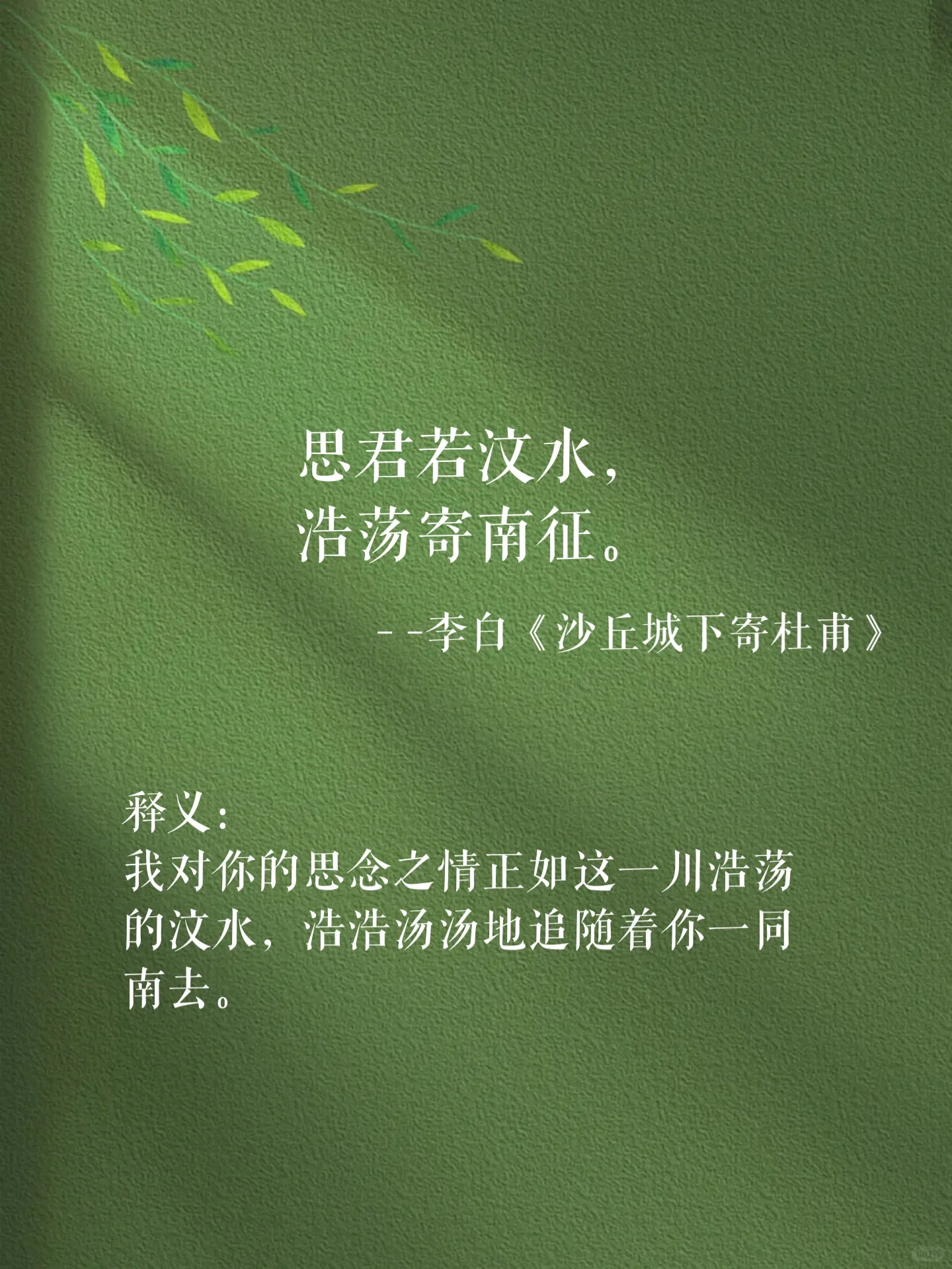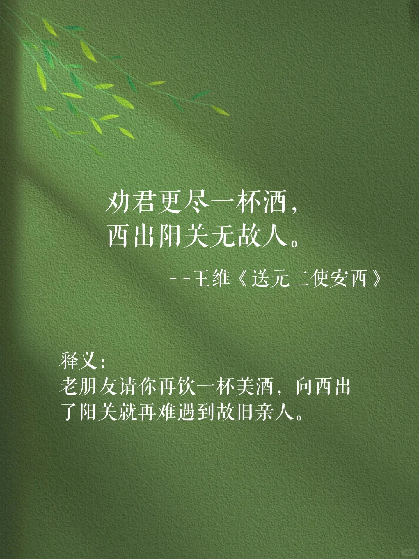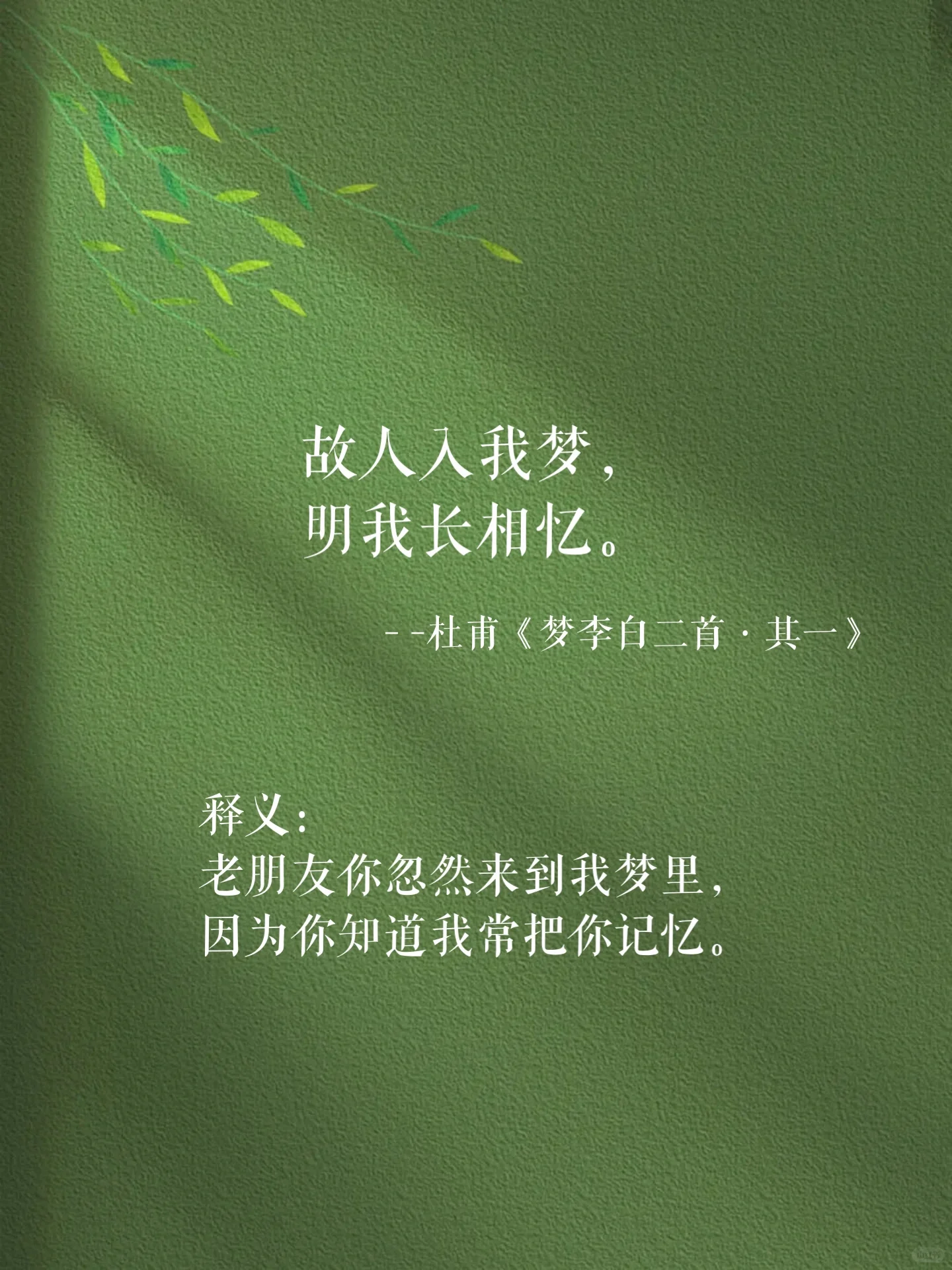 朋友是自己選擇的家人,我希望所有的朋友都能經(jīng)常見(jiàn)面。 ? 故人入夢(mèng),憶其貌——杜甫《李白夢(mèng)上二首》 定義:老朋友,你突然來(lái)到我的夢(mèng)里,因?yàn)槟阒牢医?jīng)常想起你。 ? 見(jiàn)君來(lái),忽覺(jué)府中溪山美——辛棄疾《沁園泉:似吳微子》 定義:當(dāng)我看到朋友的到來(lái)時(shí),我立刻感覺(jué)到我住的房子和山、河、溪都很美麗,容光煥發(fā)。 ? 我和丈夫在一起已久,世上沒(méi)有這回事——姜逵《樂(lè)之永恒邂逅——辛可卿先生二律》 定義:我和丈夫的關(guān)系已經(jīng)很長(zhǎng)時(shí)間了,世界上沒(méi)有像我們這樣深厚的友誼。 ? 根據(jù)這條信息,我敦促你添加更多的食物。我許季還桂花——納蘭性德《余仲豪:別了梁汾南和有題小影》 定義:我想告訴你多吃米飯。在桂花盛開的季節(jié),我們?cè)诒本﹫F(tuán)聚,分享我們的心。 ? 江南無(wú)物,聊贈(zèng)春枝——魯《贈(zèng)范爺詩(shī)》 定義:江南沒(méi)有什么好東西可以表達(dá)我的情感。讓我送給你一朵春天的梅花來(lái)表達(dá)我的祝福。 ? 思君如溫水,浩浩蕩蕩南下——李白《沙丘城下送杜甫》 釋義:我對(duì)你的思念就像浩瀚的汶水,帶著浩如煙海的湯汁跟隨你南下。 ? 白云千里,明月前后溪——?jiǎng)㈤L(zhǎng)清《流仙悲歌:青川初落》 釋義:愿白云把思念帶給千里之外的朋友,愿明月把我的憂傷帶到他們身邊。 ? 花道不曾客掃,如今蓮花門為你打開——杜甫《客到》 定義:滿是花草的庭院小路沒(méi)有為迎客而打掃,只是為了你的到來(lái),我的茅草門才第一次打開。 ? 桃李春風(fēng)一杯酒,河湖十年夜雨——黃庭堅(jiān)《寄黃季夫》 釋義:春風(fēng)中,看著桃李同飲美酒,心情落魄。我們分手已經(jīng)十年了,我常常在獨(dú)自聽著秋雨的時(shí)候想起你。 ? 你把泥骨埋在泉下,我派人去問(wèn),雪蓋了我的頭——自稱易的《微志夢(mèng)》 釋義:我在黃泉下想念你,那里的土壤侵蝕著你的骨肉,最終變成了一杯黃土。雖然我還在這個(gè)世界上,但我的鬢角仍然是灰色的。 ? 琴詩(shī)酒伴都棄我而去,雪月花中我最懷念你——白居易《送股律》 定義:一起彈琴、寫詩(shī)、喝酒的朋友都拋棄了我,這風(fēng)花雪月的時(shí)光,是我最想你的時(shí)候。 ? 沒(méi)有紅顏知己不愁前程,天下無(wú)人識(shí)你——高適《別董大二》 定義:沒(méi)有紅顏知己,不必?fù)?dān)心前途廣闊。世界上誰(shuí)不認(rèn)識(shí)你 ? 奉勸你多喝一杯酒,陽(yáng)關(guān)西去無(wú)故人——王維《別袁爾士安溪》 定義:老朋友,請(qǐng)?jiān)賮?lái)一杯美酒。一旦你離開陽(yáng)關(guān)往西走,就很難見(jiàn)到老親戚了。