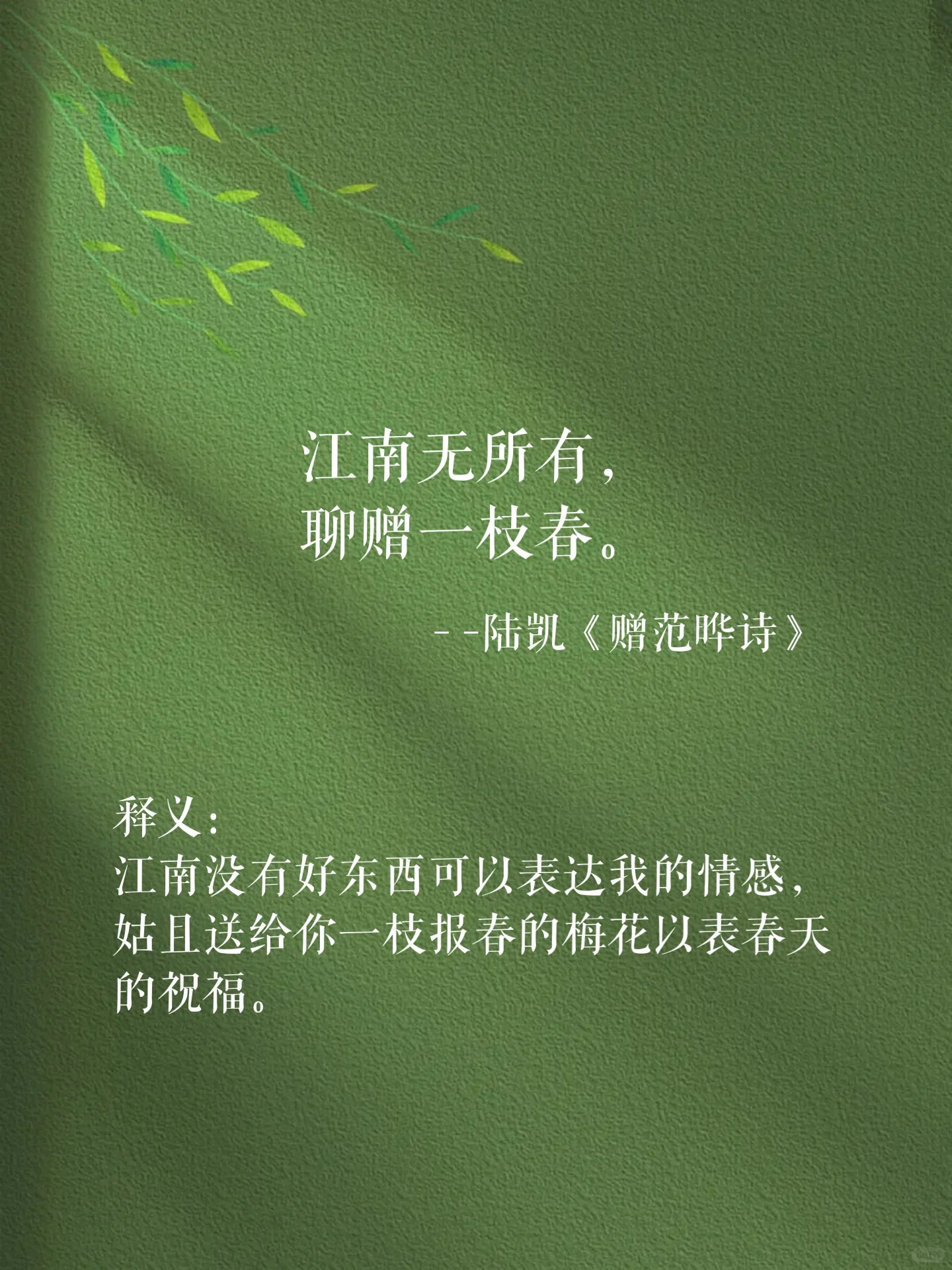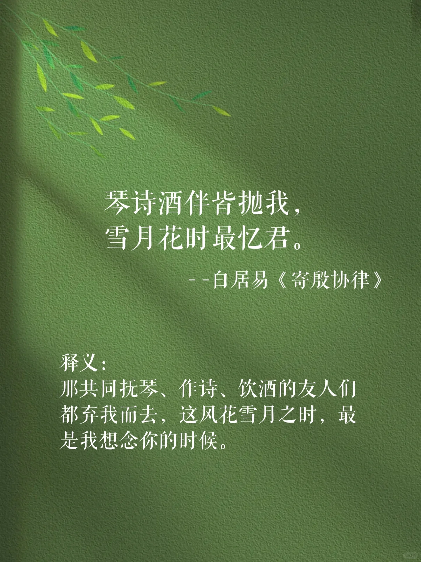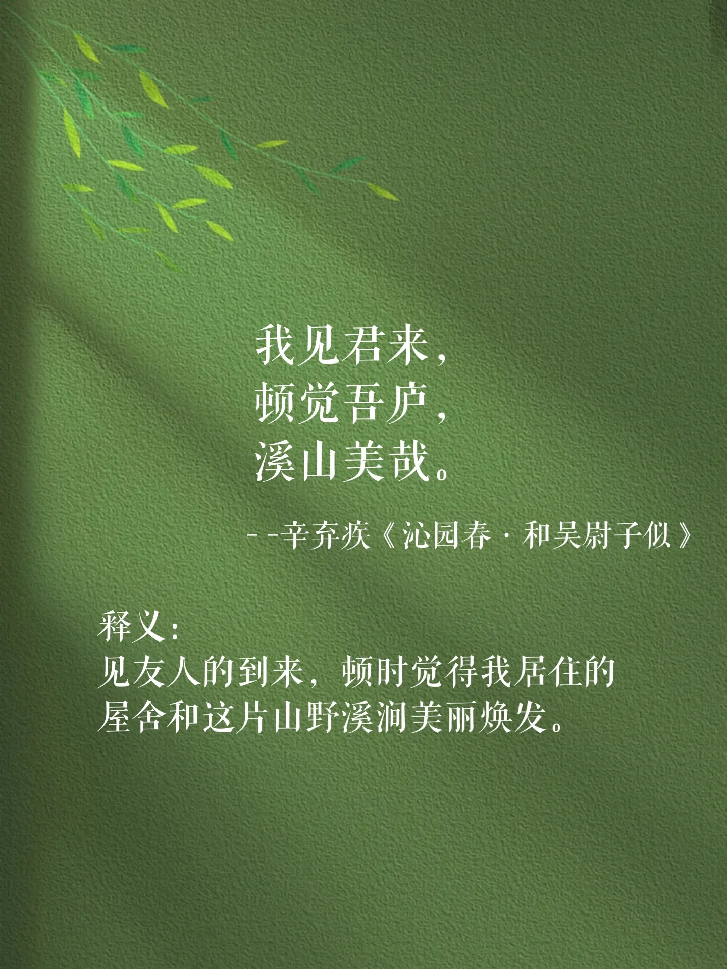 朋友是自己選擇的家人,我希望所有的朋友都能經(jīng)常見(jiàn)面。 ? 故人入夢(mèng),憶其貌——杜甫《李白夢(mèng)上二首》 定義:老朋友,你突然來(lái)到我的夢(mèng)里,因?yàn)槟阒牢医?jīng)常想起你。 ? 見(jiàn)君來(lái),忽覺(jué)府中溪山美——辛棄疾《沁園泉:似吳微子》 定義:當(dāng)我看到朋友的到來(lái)時(shí),我立刻感覺(jué)到我住的房子和山、河、溪都很美麗,容光煥發(fā)。 ? 我和丈夫在一起已久,世上沒(méi)有這回事——姜逵《樂(lè)之永恒邂逅——辛可卿先生二律》 定義:我和丈夫的關(guān)系已經(jīng)很長(zhǎng)時(shí)間了,世界上沒(méi)有像我們這樣深厚的友誼。 ? 根據(jù)這條信息,我敦促你添加更多的食物。我許季還桂花——納蘭性德《余仲豪:別了梁汾南和有題小影》 定義:我想告訴你多吃米飯。在桂花盛開的季節(jié),我們?cè)诒本﹫F(tuán)聚,分享我們的心。 ? 江南無(wú)物,聊贈(zèng)春枝——魯《贈(zèng)范爺詩(shī)》 定義:江南沒(méi)有什么好東西可以表達(dá)我的情感。讓我送給你一朵春天的梅花來(lái)表達(dá)我的祝福。 ? 思君如溫水,浩浩蕩蕩南下——李白《沙丘城下送杜甫》 釋義:我對(duì)你的思念就像浩瀚的汶水,帶著浩如煙海的湯汁跟隨你南下。 ? 白云千里,明月前后溪——?jiǎng)㈤L(zhǎng)清《流仙悲歌:青川初落》 釋義:愿白云把思念帶給千里之外的朋友,愿明月把我的憂傷帶到他們身邊。 ? 花道不曾客掃,如今蓮花門為你打開——杜甫《客到》 定義:滿是花草的庭院小路沒(méi)有為迎客而打掃,只是為了你的到來(lái),我的茅草門才第一次打開。 ? 桃李春風(fēng)一杯酒,河湖十年夜雨——黃庭堅(jiān)《寄黃季夫》 釋義:春風(fēng)中,看著桃李同飲美酒,心情落魄。我們分手已經(jīng)十年了,我常常在獨(dú)自聽著秋雨的時(shí)候想起你。 ? 你把泥骨埋在泉下,我派人去問(wèn),雪蓋了我的頭——自稱易的《微志夢(mèng)》 釋義:我在黃泉下想念你,那里的土壤侵蝕著你的骨肉,最終變成了一杯黃土。雖然我還在這個(gè)世界上,但我的鬢角仍然是灰色的。 ? 琴詩(shī)酒伴都棄我而去,雪月花中我最懷念你——白居易《送股律》 定義:一起彈琴、寫詩(shī)、喝酒的朋友都拋棄了我,這風(fēng)花雪月的時(shí)光,是我最想你的時(shí)候。 ? 沒(méi)有紅顏知己不愁前程,天下無(wú)人識(shí)你——高適《別董大二》 定義:沒(méi)有紅顏知己,不必?fù)?dān)心前途廣闊。世界上誰(shuí)不認(rèn)識(shí)你 ? 奉勸你多喝一杯酒,陽(yáng)關(guān)西去無(wú)故人——王維《別袁爾士安溪》 定義:老朋友,請(qǐng)?jiān)賮?lái)一杯美酒。一旦你離開陽(yáng)關(guān)往西走,就很難見(jiàn)到老親戚了。