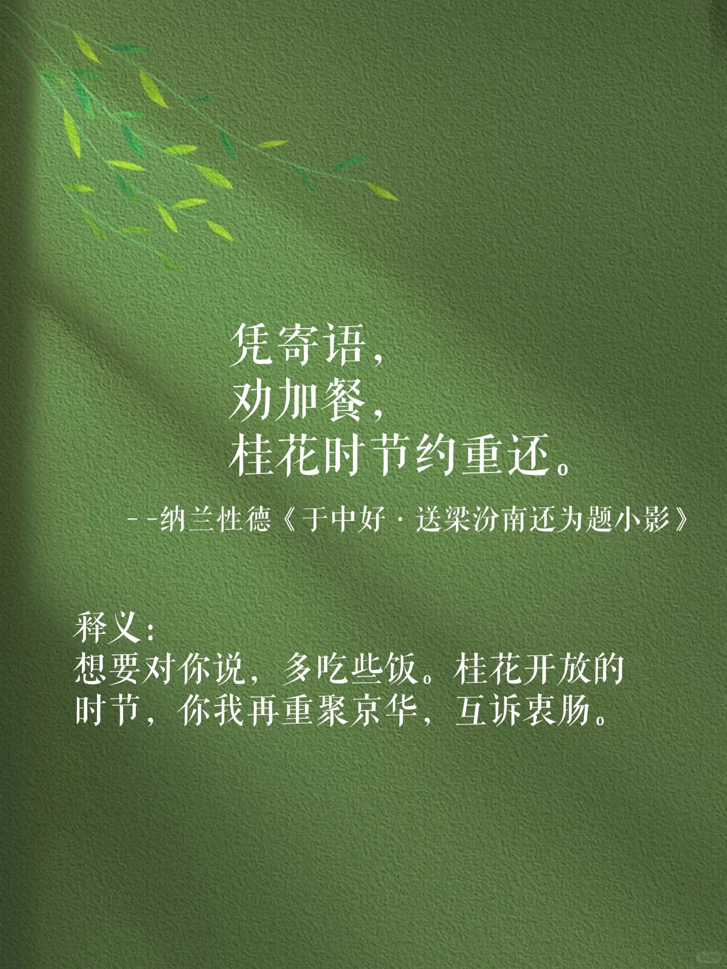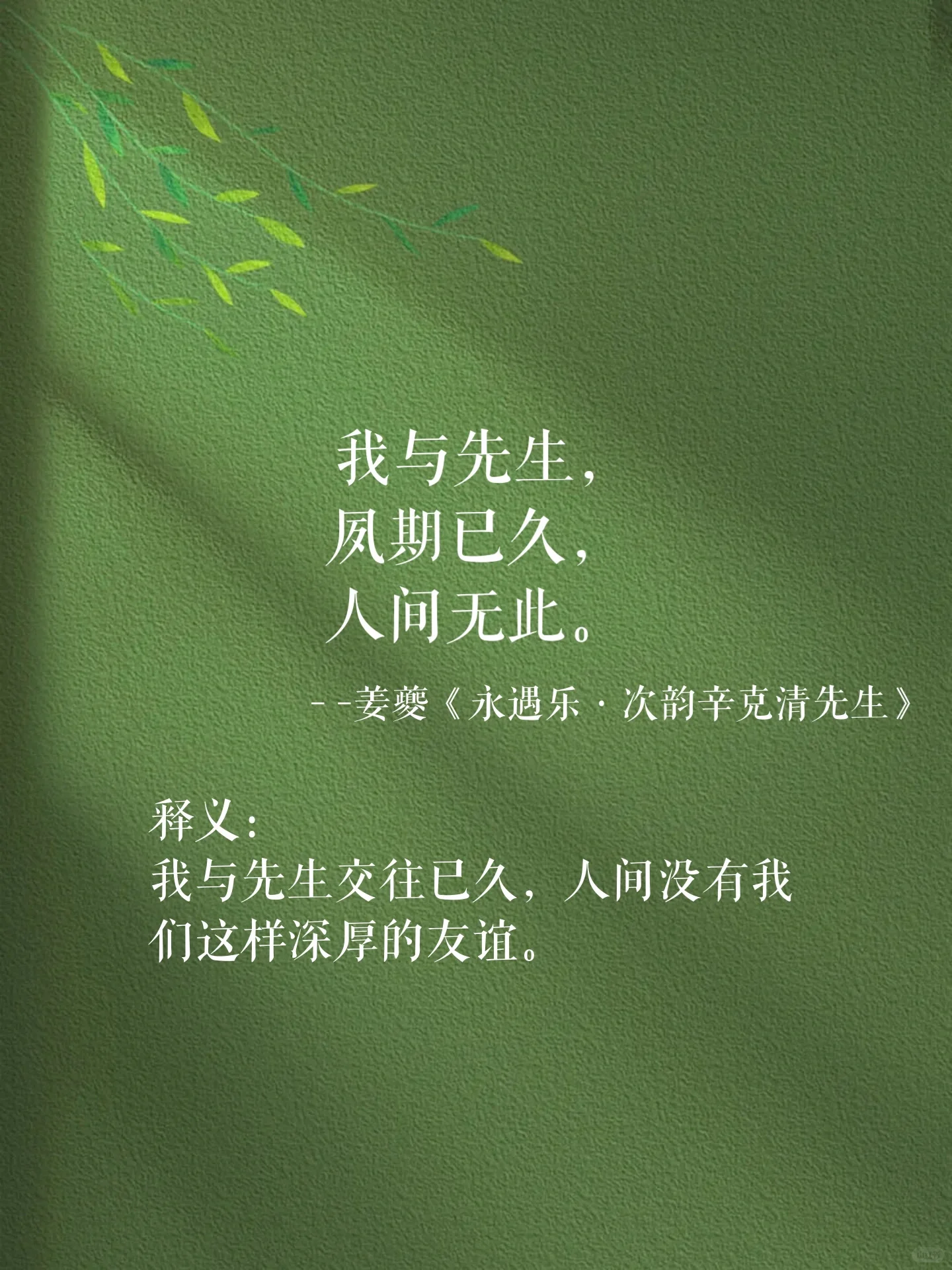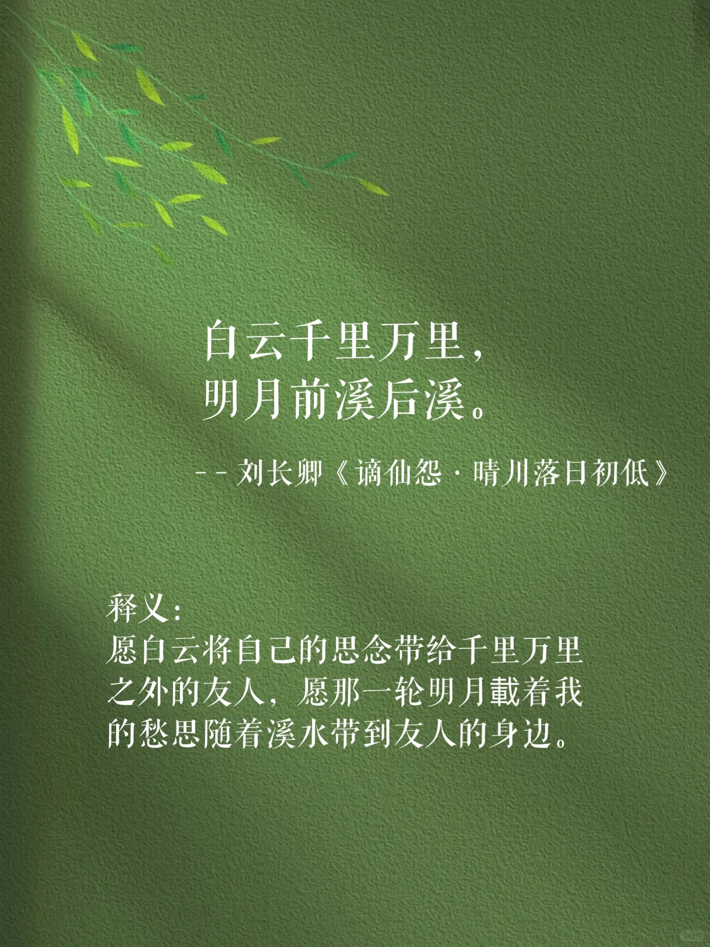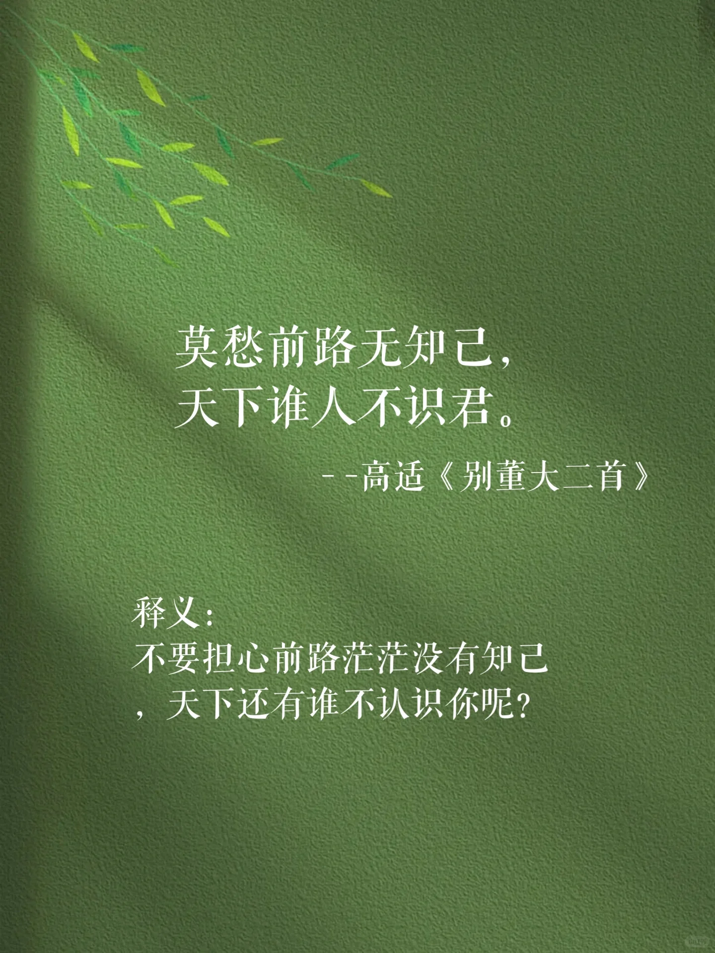 朋友是自己選擇的家人,我希望所有的朋友都能經(jīng)常見(jiàn)面。 ? 故人入夢(mèng),憶其貌——杜甫《李白夢(mèng)上二首》 定義:老朋友,你突然來(lái)到我的夢(mèng)里,因?yàn)槟阒牢医?jīng)常想起你。 ? 見(jiàn)君來(lái),忽覺(jué)府中溪山美——辛棄疾《沁園泉:似吳微子》 定義:當(dāng)我看到朋友的到來(lái)時(shí),我立刻感覺(jué)到我住的房子和山、河、溪都很美麗,容光煥發(fā)。 ? 我和丈夫在一起已久,世上沒(méi)有這回事——姜逵《樂(lè)之永恒邂逅——辛可卿先生二律》 定義:我和丈夫的關(guān)系已經(jīng)很長(zhǎng)時(shí)間了,世界上沒(méi)有像我們這樣深厚的友誼。 ? 根據(jù)這條信息,我敦促你添加更多的食物。我許季還桂花——納蘭性德《余仲豪:別了梁汾南和有題小影》 定義:我想告訴你多吃米飯。在桂花盛開的季節(jié),我們?cè)诒本﹫F(tuán)聚,分享我們的心。 ? 江南無(wú)物,聊贈(zèng)春枝——魯《贈(zèng)范爺詩(shī)》 定義:江南沒(méi)有什么好東西可以表達(dá)我的情感。讓我送給你一朵春天的梅花來(lái)表達(dá)我的祝福。 ? 思君如溫水,浩浩蕩蕩南下——李白《沙丘城下送杜甫》 釋義:我對(duì)你的思念就像浩瀚的汶水,帶著浩如煙海的湯汁跟隨你南下。 ? 白云千里,明月前后溪——?jiǎng)㈤L(zhǎng)清《流仙悲歌:青川初落》 釋義:愿白云把思念帶給千里之外的朋友,愿明月把我的憂傷帶到他們身邊。 ? 花道不曾客掃,如今蓮花門為你打開——杜甫《客到》 定義:滿是花草的庭院小路沒(méi)有為迎客而打掃,只是為了你的到來(lái),我的茅草門才第一次打開。 ? 桃李春風(fēng)一杯酒,河湖十年夜雨——黃庭堅(jiān)《寄黃季夫》 釋義:春風(fēng)中,看著桃李同飲美酒,心情落魄。我們分手已經(jīng)十年了,我常常在獨(dú)自聽著秋雨的時(shí)候想起你。 ? 你把泥骨埋在泉下,我派人去問(wèn),雪蓋了我的頭——自稱易的《微志夢(mèng)》 釋義:我在黃泉下想念你,那里的土壤侵蝕著你的骨肉,最終變成了一杯黃土。雖然我還在這個(gè)世界上,但我的鬢角仍然是灰色的。 ? 琴詩(shī)酒伴都棄我而去,雪月花中我最懷念你——白居易《送股律》 定義:一起彈琴、寫詩(shī)、喝酒的朋友都拋棄了我,這風(fēng)花雪月的時(shí)光,是我最想你的時(shí)候。 ? 沒(méi)有紅顏知己不愁前程,天下無(wú)人識(shí)你——高適《別董大二》 定義:沒(méi)有紅顏知己,不必?fù)?dān)心前途廣闊。世界上誰(shuí)不認(rèn)識(shí)你 ? 奉勸你多喝一杯酒,陽(yáng)關(guān)西去無(wú)故人——王維《別袁爾士安溪》 定義:老朋友,請(qǐng)?jiān)賮?lái)一杯美酒。一旦你離開陽(yáng)關(guān)往西走,就很難見(jiàn)到老親戚了。