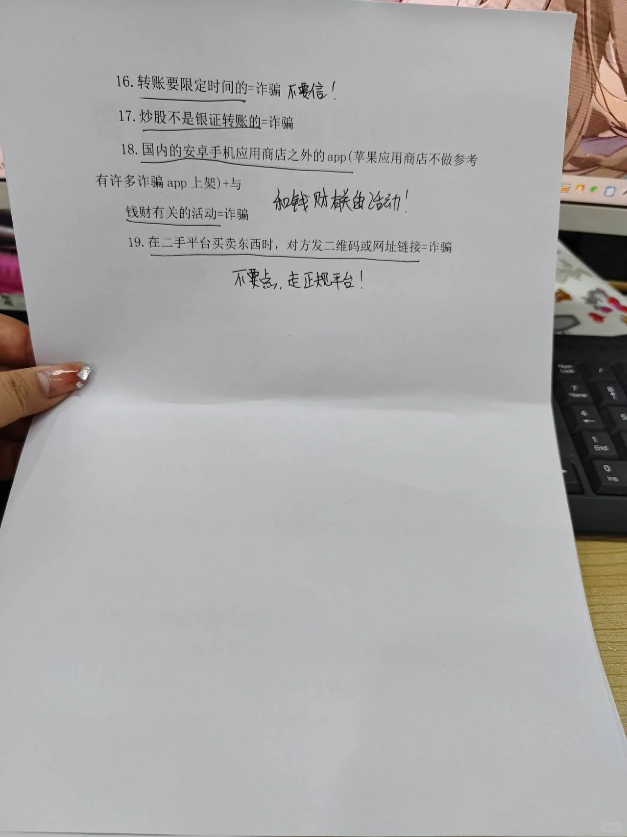 電信詐騙公式?。?! 【一R】京東客服+關(guān)閉白條/金條=詐騙! [ErR]你犯了罪+資金審查=詐騙! 【三個(gè)Rs】首領(lǐng)添加好友+幫助轉(zhuǎn)賬=詐騙! 【四個(gè)Rs】兼職任務(wù)+預(yù)付款=詐騙! 【五個(gè)Rs】大額采購+預(yù)付款=詐騙! 【六個(gè)Rs】網(wǎng)上招攬+預(yù)付款=詐騙! 【七個(gè)Rs】共享屏幕+銀行賬戶=詐騙! 【八R】網(wǎng)購客服+主動(dòng)賠付=詐騙! 【九R】對(duì)方提供的網(wǎng)站鏈接+投資理財(cái)=詐騙! 【一R】【零R】網(wǎng)貸+支付=詐騙! [一R][一R]網(wǎng)絡(luò)交友+投資賺錢=詐騙! 一個(gè)R][兩個(gè)R]短信+鏈接=欺詐! 與陌生人共享屏幕=欺詐 【一R】【四R】索要銀行卡驗(yàn)證碼密碼=詐騙 [一個(gè)R][五個(gè)R]分享利潤的人=欺詐,而在網(wǎng)上賺錢的人=詐騙 【一個(gè)R】【六個(gè)R】轉(zhuǎn)賬需要有限的時(shí)間=欺詐 股票交易不是銀行證券轉(zhuǎn)讓=欺詐 國內(nèi)安卓手機(jī)應(yīng)用商店以外的[一個(gè)R][八個(gè)R]應(yīng)用程序(蘋果應(yīng)用商店不作為參考,列出了許多欺詐應(yīng)用程序)+和 與金錢有關(guān)的活動(dòng)=欺詐 【一R】【九R】在二手平臺(tái)買賣東西時(shí),對(duì)方發(fā)送二維碼或網(wǎng)站鏈接=詐騙
