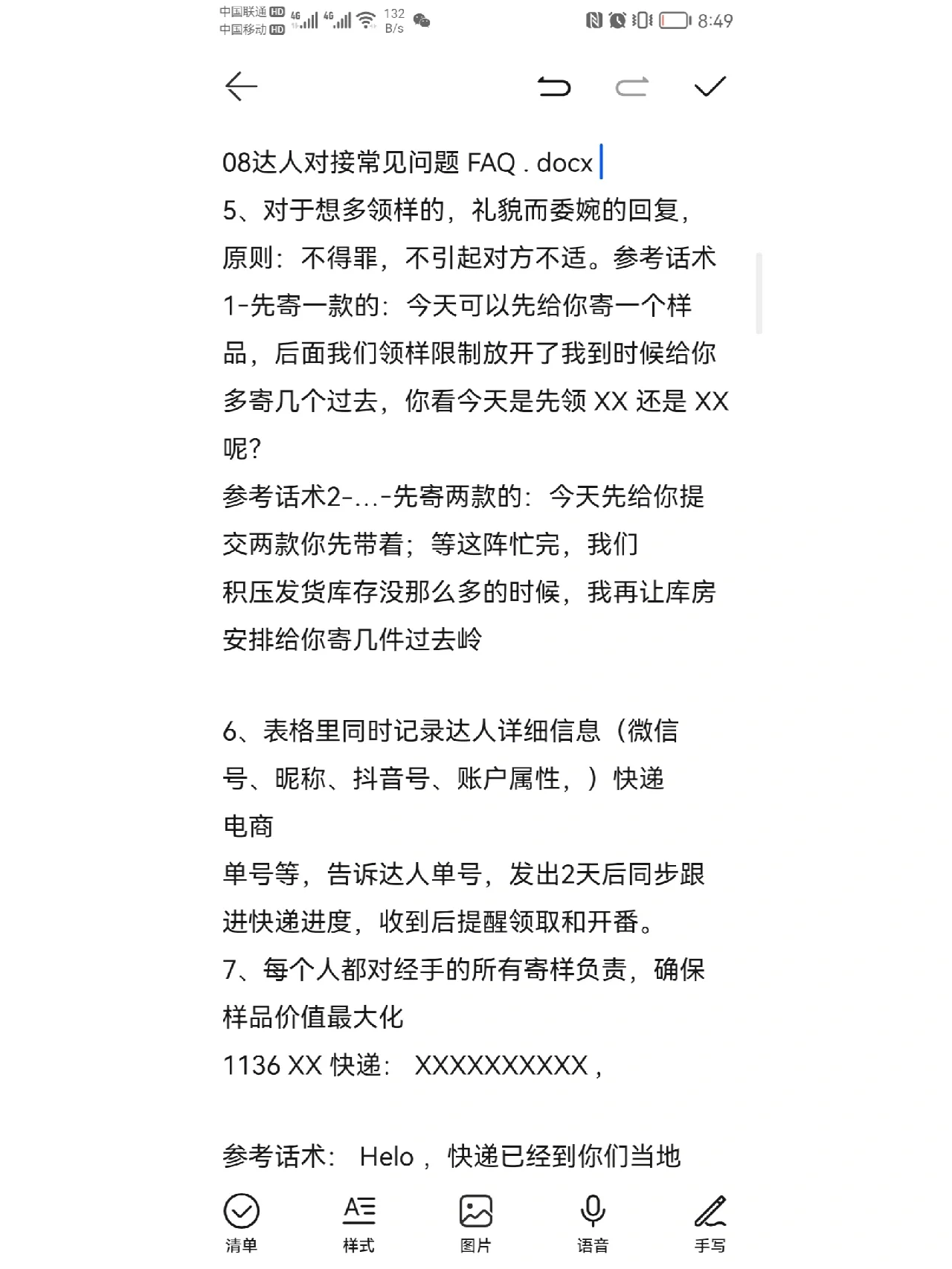 專家連接常見(jiàn)問(wèn)題解答 第1部分:與有影響力的人聯(lián)系時(shí)的常見(jiàn)問(wèn)題和參考腳本-來(lái)源:關(guān)潤(rùn)門店群分享 1.問(wèn)候語(yǔ)簡(jiǎn)單明了,突出原因; 參考腳本:你好,我們是來(lái)源工廠,目前有大量高傭金商品供應(yīng)。我們可以免費(fèi)提供樣品。你最近能通過(guò)直播與我們合作嗎 你最近有什么可以合作的直播時(shí)間表嗎 2.分析影響者賬戶的屬性和受眾 有針對(duì)性地推薦合作產(chǎn)品,推薦有影響力的賬號(hào)人口統(tǒng)計(jì)和語(yǔ)氣樣本——在介紹和推薦產(chǎn)品時(shí),盡量向?qū)Ψ桨l(fā)送產(chǎn)品鏈接和產(chǎn)品圖片域截圖 參考腳本:這些是我們最近一直在推廣的高傭金熱銷產(chǎn)品,每天有數(shù)千個(gè)訂單,賣得特別好。請(qǐng)看一下你想先推廣哪些; 3.提醒添加展示的截圖,然后發(fā)送地址,我們稍后會(huì)通知您反饋訂單號(hào) 參考腳本:這是鏈接。你現(xiàn)在可以把它掛在展示柜里,截圖發(fā)給我。另外,把你的發(fā)貨地址發(fā)給我,我會(huì)為你提交樣品。我稍后會(huì)把樣品的跟蹤號(hào)發(fā)給你 4.避免使用“你”這樣的敬語(yǔ)來(lái)顯得陌生和疏遠(yuǎn); 您可以在對(duì)話中適當(dāng)添加一個(gè)小表情符號(hào),并適當(dāng)發(fā)送產(chǎn)品鏈接或我們的商店鏈接;不要讓所有的文本都顯得死板,盡量營(yíng)造一種輕松愉快的對(duì)話氛圍 參考腳本:這是我們小商店的鏈接。泰迪熊的帽子和手套賣得很好(添加了產(chǎn)品鏈接), 08 Expert Connection Docx常見(jiàn)問(wèn)題解答 5.對(duì)于那些想要收到更多樣品的人,原則是禮貌而委婉地回應(yīng),而不會(huì)冒犯或引起對(duì)方的不適。參考腳本1-先發(fā)送樣本:今天,我們可以先發(fā)送樣本給您。稍后,我們放寬了樣本采集限制,我會(huì)再給您發(fā)送一些。你認(rèn)為我們今天應(yīng)該先收到XX還是XX 參考腳本2-…-先送兩件:今天我會(huì)送兩件給你,你會(huì)帶上它們;經(jīng)過(guò)這次沖刺,我們將 當(dāng)積壓的貨物沒(méi)有足夠的庫(kù)存時(shí),我會(huì)安排倉(cāng)庫(kù)再給你寄幾件給凌 6.表格中還記錄了人才的詳細(xì)信息(微信、昵稱、抖音號(hào)、賬號(hào)屬性等) 電子商務(wù) 請(qǐng)向影響者提供跟蹤號(hào)碼,并在發(fā)送后2天跟進(jìn)交付進(jìn)度。收到后,提醒他們收集并打開(kāi)包裹。 7.每個(gè)人都對(duì)自己處理的所有樣本負(fù)責(zé),確保樣本價(jià)值最大化 1136 XX快遞:XXXXXXXXXX, 參考腳本:Helo,貨物已經(jīng)到達(dá)您所在的地區(qū)。還請(qǐng)密切關(guān)注進(jìn)展情況。一旦它到達(dá),你可以去簽收 哈哈 后續(xù):董哥/美麗的小娟你好,樣品收到了嗎你今天能開(kāi)始廣播嗎當(dāng)然 如果你已經(jīng)設(shè)置了播放時(shí)間,請(qǐng)告訴我,我會(huì)讓我的朋友進(jìn)來(lái)給你點(diǎn)贊和互動(dòng),幫助你提高播放室的知名度。 TIPS:后期數(shù)據(jù)維護(hù)-關(guān)注影響者直播間的開(kāi)放情況和數(shù)據(jù),能夠組合產(chǎn)品賣點(diǎn)(產(chǎn)品)