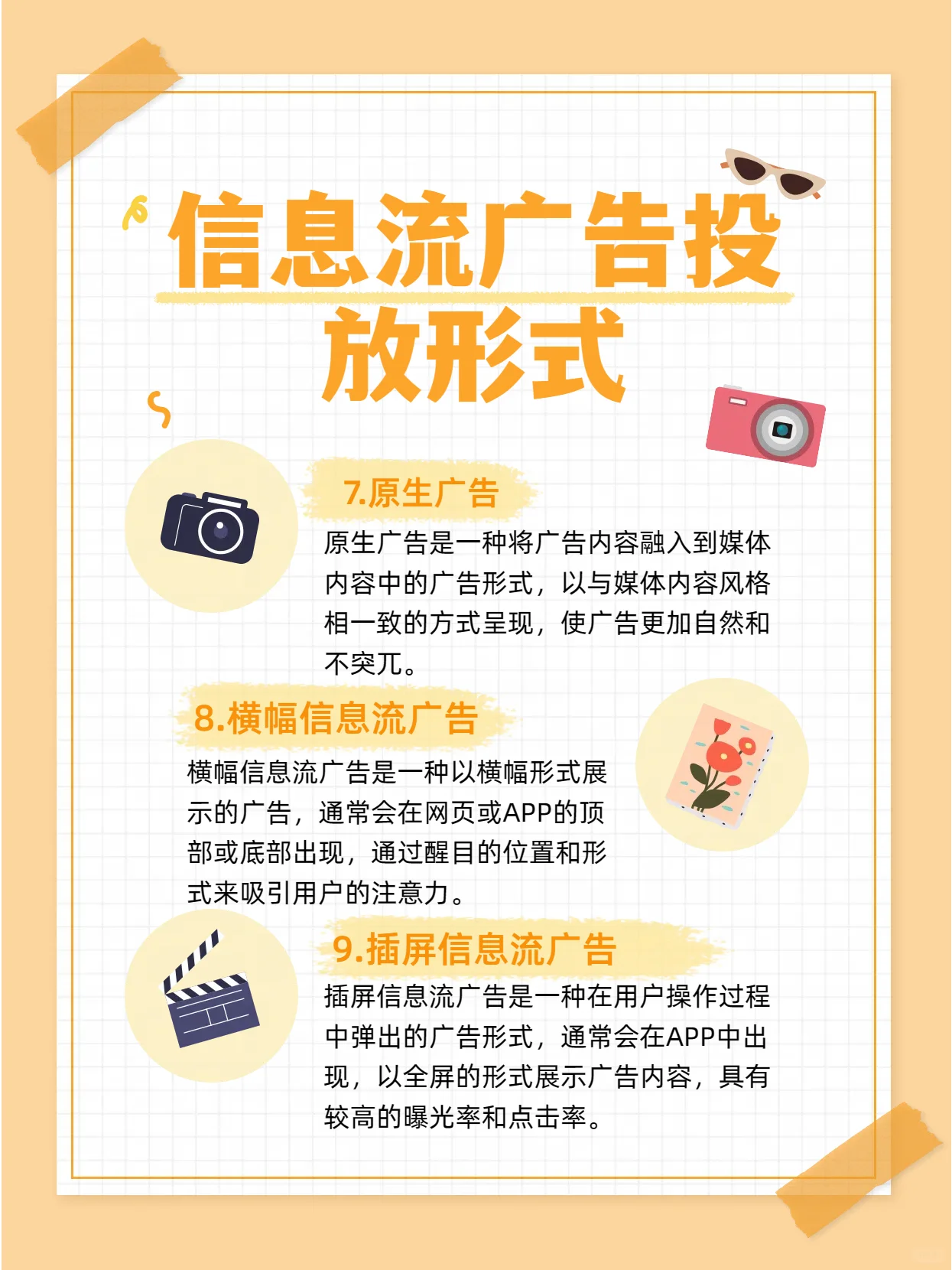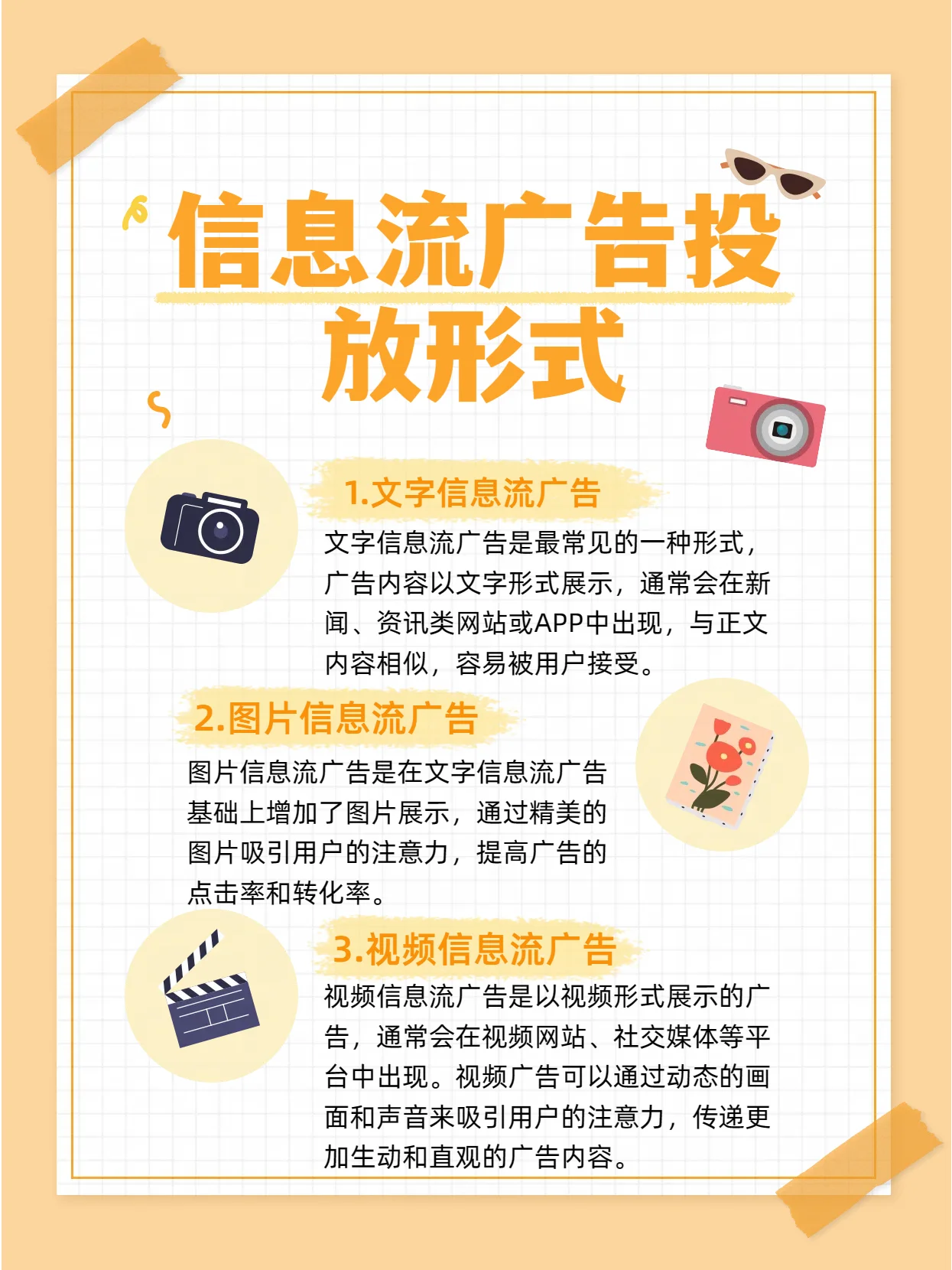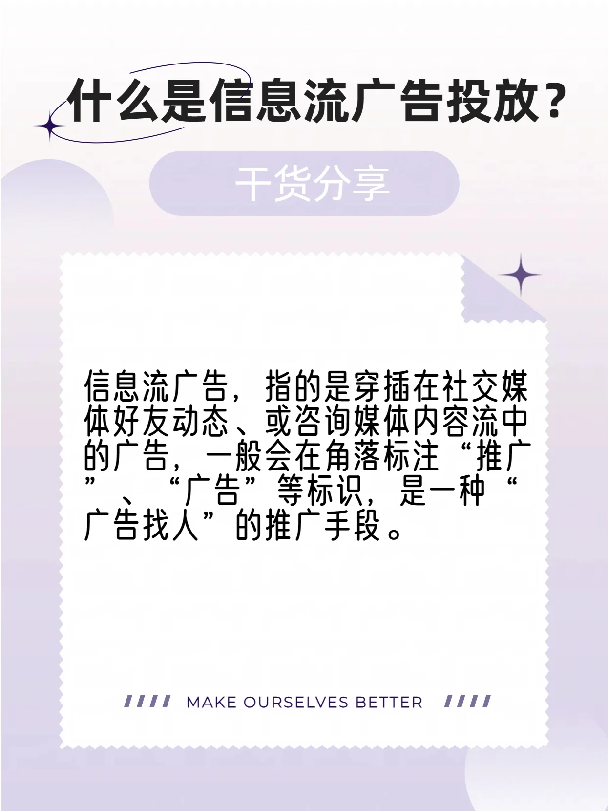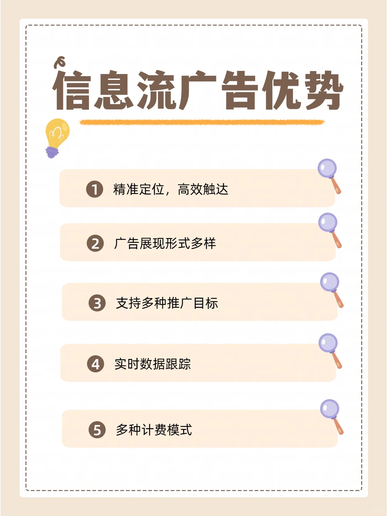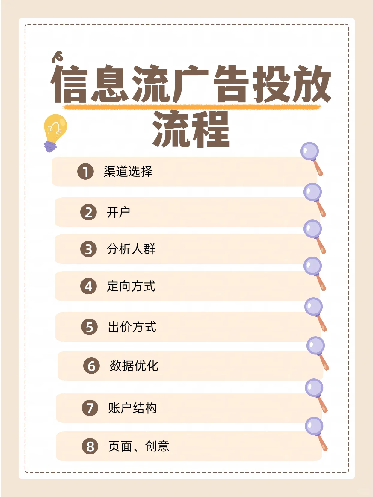 1、 什么是信息流廣告投放 信息流廣告是指穿插在社交媒體朋友動(dòng)態(tài)或咨詢媒體內(nèi)容流中的廣告。一般情況下,在角落標(biāo)注“促銷”、“廣告”等標(biāo)志,是一種“廣告找人”的促銷方式。 2、 信息流廣告投放的形式 1.文字流廣告 2.圖像信息流廣告 3.視頻信息流廣告 4.評(píng)價(jià)型信息流廣告 5.推薦信息流廣告 6.社交媒體信息流廣告 7.本土廣告 8、橫幅信息流廣告 9.插屏信息流廣告 10.移動(dòng)信息流廣告 3、 信息流廣告的優(yōu)勢(shì) 1.定位準(zhǔn)確,有效觸達(dá) 2.廣告展示形式多樣 3.支持多個(gè)推廣目標(biāo) 4.實(shí)時(shí)數(shù)據(jù)跟蹤 5.多種計(jì)費(fèi)模式 4、 信息流廣告投放流程 1.頻道選擇 2.開戶 3.分析人群 4.定向方法 5.招標(biāo)方式 6.數(shù)據(jù)優(yōu)化 7.賬戶結(jié)構(gòu) 8.頁(yè)面與創(chuàng)意