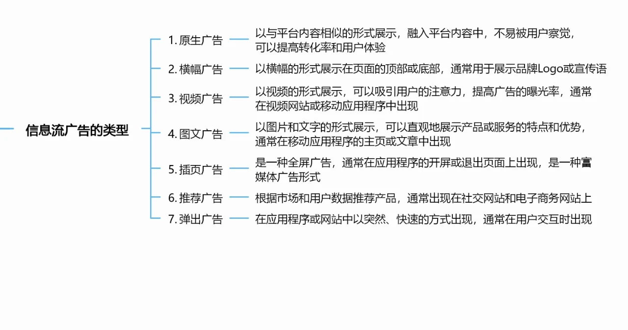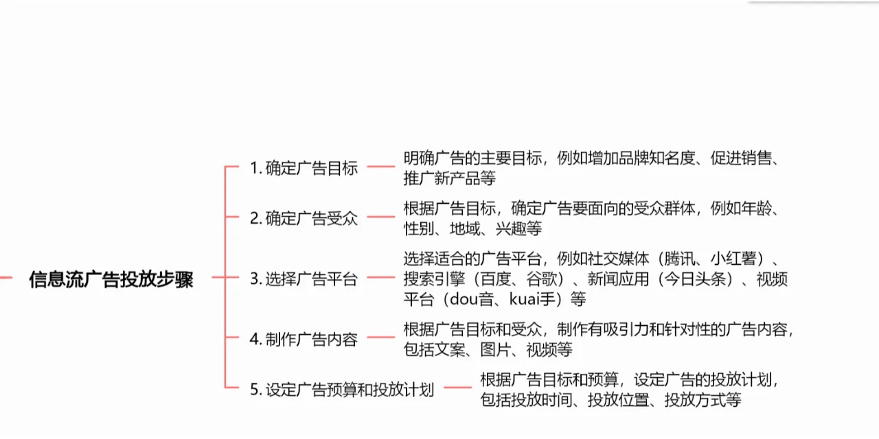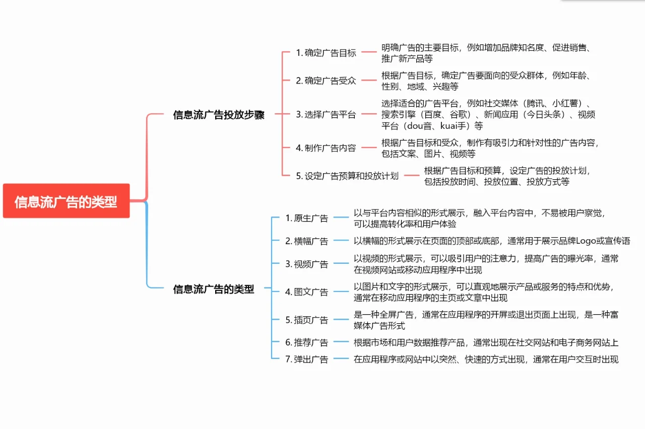1、 信息流廣告投放步驟 1.確定廣告目標(biāo) 明確廣告的主要目標(biāo),如提高品牌知名度、促進(jìn)銷售和推廣新產(chǎn)品 2.確定廣告受眾 根據(jù)廣告的目標(biāo),如年齡、性別、地理位置、興趣等,確定廣告的目標(biāo)受眾 3.選擇廣告平臺(tái) 選擇合適的廣告平臺(tái),如社交媒體(騰訊、小紅書)、搜索引擎(百度、谷歌)、新聞應(yīng)用(今日頭條)、視頻平臺(tái)(抖音、快手)等 4.創(chuàng)建廣告內(nèi)容 基于廣告目標(biāo)和受眾,創(chuàng)造有吸引力和針對(duì)性的廣告內(nèi)容,包括文案、圖片、視頻等 5.制定廣告預(yù)算和投放計(jì)劃 根據(jù)廣告目標(biāo)和預(yù)算制定廣告投放計(jì)劃,包括投放時(shí)間、投放地點(diǎn)、投放方式等 2、 信息流廣告的類型 1.本土廣告 以類似于平臺(tái)內(nèi)容的形式顯示,并將其集成到平臺(tái)內(nèi)容中,使其不那么引人注意,可以提高轉(zhuǎn)化率和用戶體驗(yàn) 2.橫幅廣告 以橫幅的形式顯示在頁面的頂部或底部,通常用于顯示品牌標(biāo)志或促銷信息 3.視頻廣告 以視頻形式顯示可以吸引用戶注意力并增加廣告曝光率,通常出現(xiàn)在視頻網(wǎng)站或移動(dòng)應(yīng)用程序上 4.平面廣告 以圖像和文本的形式顯示,可以直觀地顯示產(chǎn)品或服務(wù)的特點(diǎn)和優(yōu)勢(shì),通常出現(xiàn)在移動(dòng)應(yīng)用程序的主頁或文章上 5.插入廣告 它是一種全屏廣告,通常出現(xiàn)在應(yīng)用程序的打開或退出頁面上,是富媒體廣告的一種形式 6.推薦廣告 根據(jù)市場(chǎng)和用戶數(shù)據(jù)推薦產(chǎn)品,通常出現(xiàn)在社交和電子商務(wù)網(wǎng)站上 7.彈出式廣告 在應(yīng)用程序或網(wǎng)站中突然快速出現(xiàn),通常是在用戶交互過程中