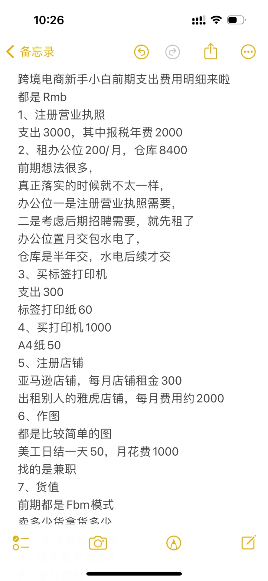 跨境電商新手 這是初步費用的明細 都是人民幣 1.注冊營業(yè)執(zhí)照 3000的支出,包括2000的年度納稅申報費 2.每月租金200元的辦公空間和8400元的倉庫 早期有很多想法, 當涉及到實際實現(xiàn)時,它是不同的, 注冊營業(yè)執(zhí)照需要一個辦公空間, 其次,考慮到后期的招聘需求,我們會先租 辦公空間已經(jīng)提供了每月的水電套餐, 倉庫將在六個月內交付,水電只會在晚些時候交付 3.買一臺標簽打印機 支出300 標簽打印紙60 4.購買1000臺打印機 A4紙50 5.注冊庫 亞馬遜店鋪,每月店鋪租金300 租用別人的雅虎商店每月大約需要2000元 6.圖紙 它們都是相對簡單的圖表 平面設計每天50元,每月1000元 我在找一份兼職工作 7.貨物價值 早期階段都處于Fbm模式 你賣多少,拿多少 第一個月獲得3000件商品 8.貨代費4300 9.包裝材料費 一個紙箱珍珠泡泡袋、快遞袋、膠帶 五百 10.商標注冊0 我在早期階段沒有為FBM注冊日本商標?? 11.IP服務費900 為了防止商店關聯(lián),這是必要的 每月150 我發(fā)現(xiàn)這一天更累了 有時,為了變得更好 我在猶豫我再次提到的技術 所以,把手表關掉兩天 過去兩天,圖書愛好者的數(shù)據(jù)是什么 一點也沒有,一點也不多 所以,總的來說,每天更新都是無用的 還需要真誠有用的筆記 期待在創(chuàng)業(yè)之旅中遇到志同道合的人 我是素素, 一個喜歡超級忙碌的人 但跨境電商仍然喜歡分享