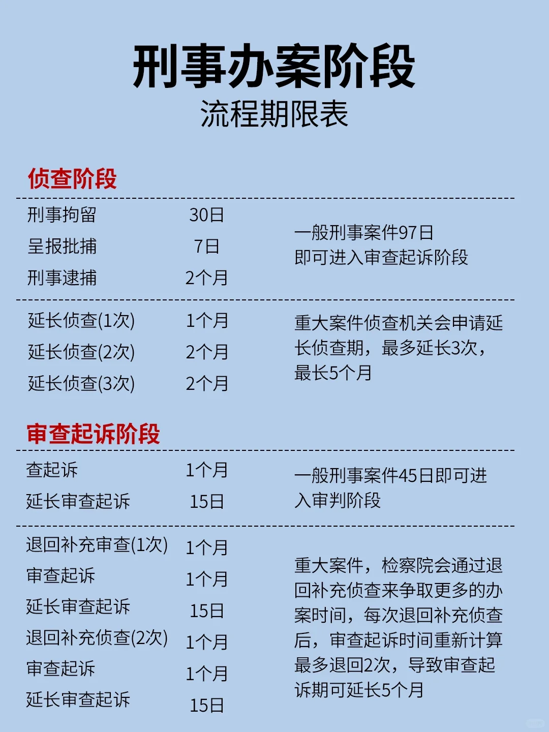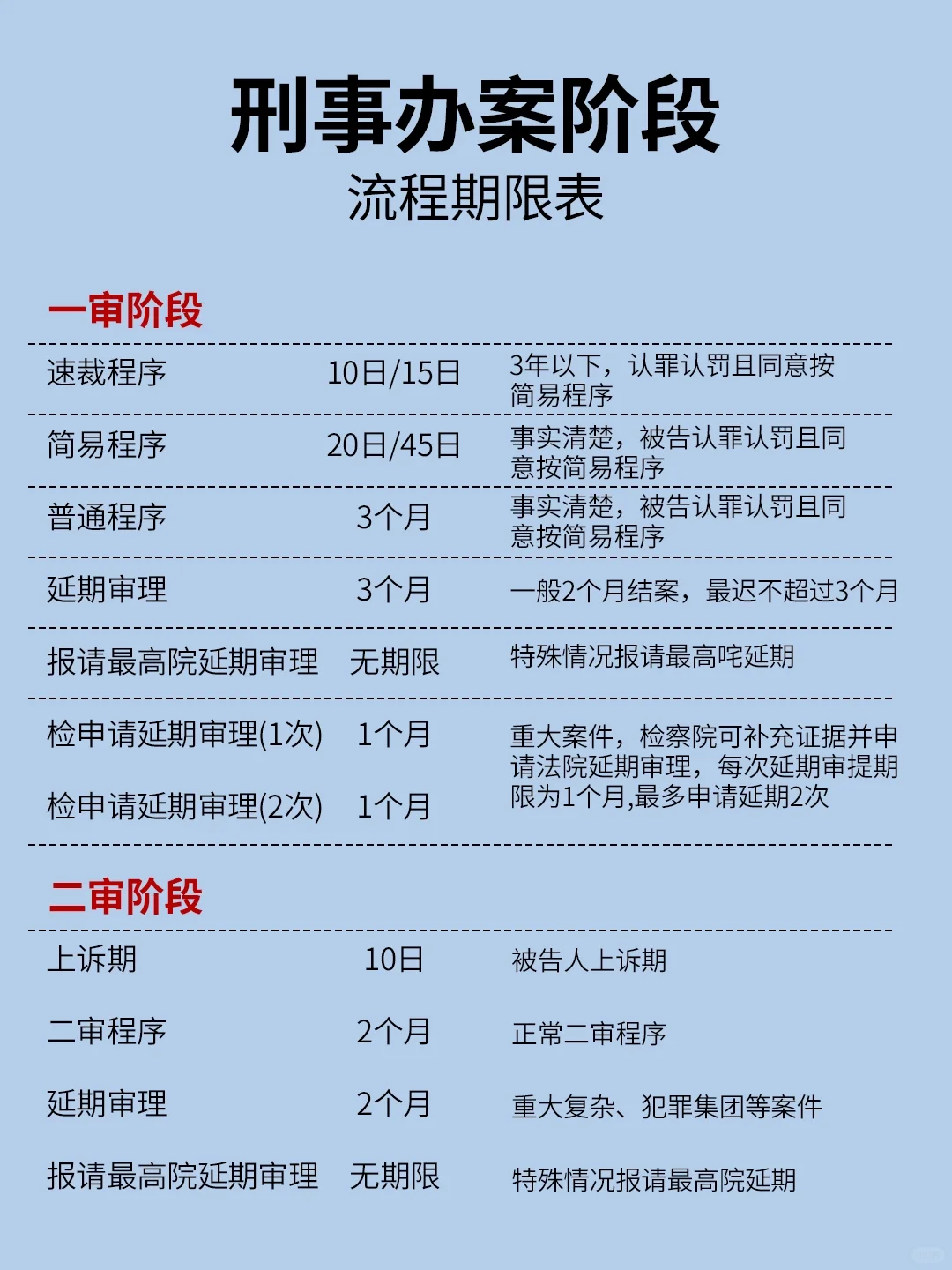 當(dāng)法律問(wèn)題過(guò)于復(fù)雜時(shí),如何處理刑事案件讓我們一起看看 我們已經(jīng)將整個(gè)流程圖包含在圖片中!你可以更方便直觀地看到它 偵查階段:一般情況下,刑事案件可以在97天內(nèi)進(jìn)入審查起訴階段。主要刑事調(diào)查機(jī)關(guān)可申請(qǐng)延長(zhǎng)偵察機(jī)使用期限,最長(zhǎng)可延長(zhǎng)三次,最長(zhǎng)可達(dá)五個(gè)月 在審查起訴階段,刑事案件通常在45天內(nèi)進(jìn)入審判階段。對(duì)于重大事件,檢察院將通過(guò)返回補(bǔ)充調(diào)查來(lái)爭(zhēng)取更多的處理時(shí)間。每次返回補(bǔ)充調(diào)查后,審查和起訴時(shí)間將重新計(jì)算,最多兩次返回 一審階段 快速仲裁程序,10-15天,不到三年,認(rèn)罪并同意遵循簡(jiǎn)化程序 簡(jiǎn)易程序,20-45天澄清事實(shí),被告認(rèn)罪并同意遵循簡(jiǎn)易程序 常規(guī)程序,3個(gè)月,事實(shí)清楚,被告人認(rèn)罪認(rèn)罰,同意遵循簡(jiǎn)化程序 延遲試驗(yàn),三個(gè)月,通常兩個(gè)月,但不超過(guò)三個(gè)月 請(qǐng)求最高法院無(wú)限期延長(zhǎng)審判,在特殊情況下,請(qǐng)求最高法院延長(zhǎng)聽證會(huì) 二審階段,包括上訴期、二審程序、審判延期以及向最高法院申請(qǐng)延期審判 法律問(wèn)題,我們走吧~