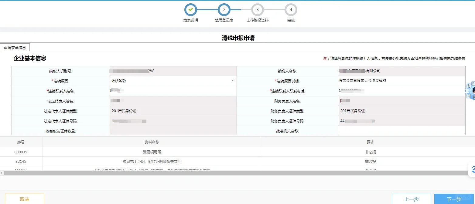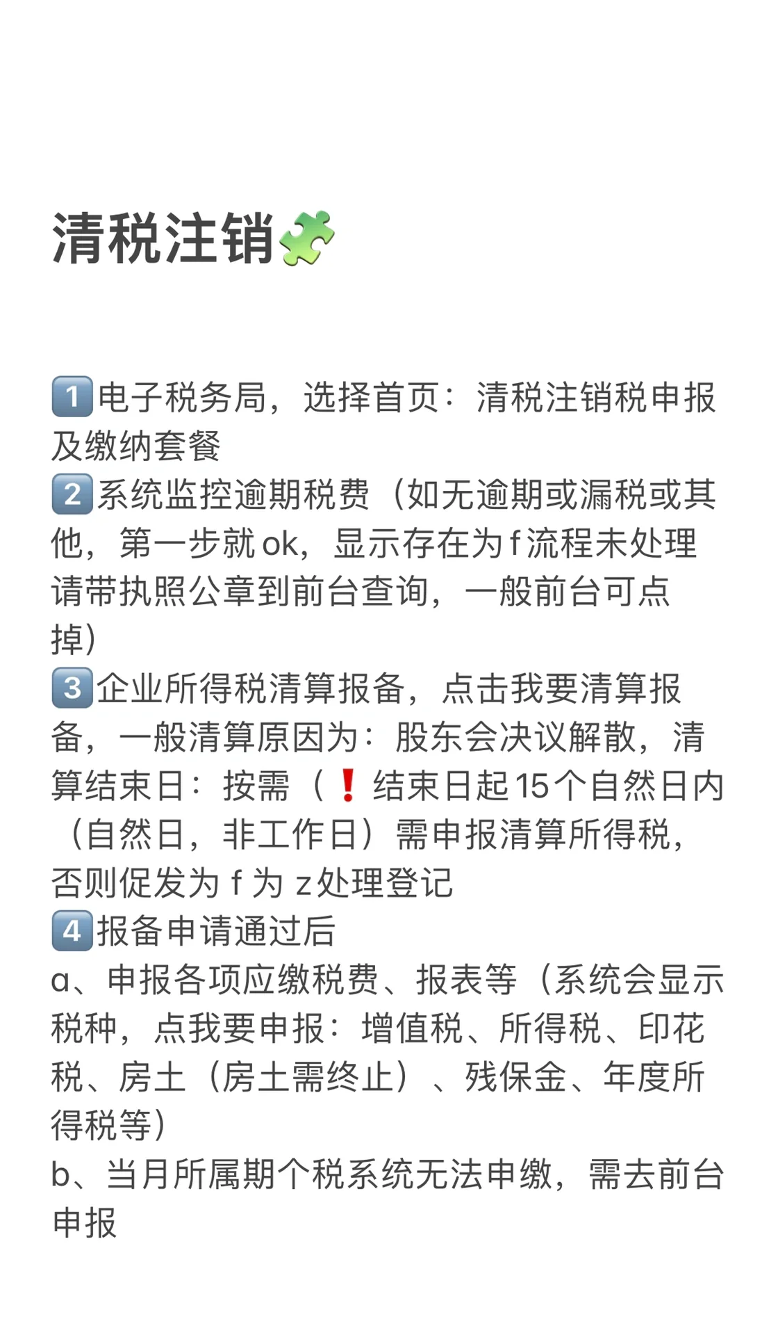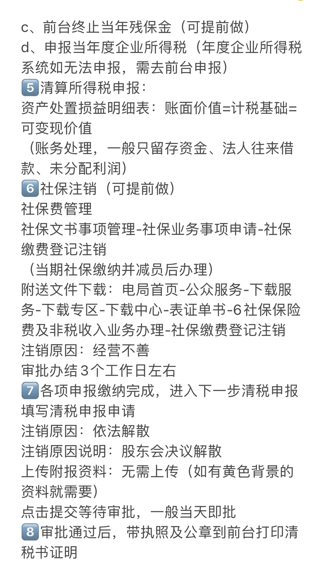 電子稅務(wù)局,選擇主頁(yè):清關(guān)和取消納稅申報(bào)和付款包 系統(tǒng)監(jiān)控逾期稅費(fèi)(如果沒有逾期或漏稅等問(wèn)題,第一步就可以了,說(shuō)明有未處理的流程。請(qǐng)攜帶您的執(zhí)照和公章到前臺(tái)查詢。一般情況下,前臺(tái)可以點(diǎn)擊刪除) 企業(yè)所得稅清算報(bào)告,點(diǎn)擊“我要清算報(bào)告”(按照程序包步驟,如圖3第二步所示)。一般清算的理由是:股東大會(huì)決定解散,清算結(jié)束日期視需要而定( 自清算結(jié)束之日起15個(gè)自然日(自然日、非工作日)內(nèi),需要申報(bào)清算所得稅。否則,它將被提升為f并進(jìn)行注冊(cè)處理 注冊(cè)申請(qǐng)獲得批準(zhǔn)后 a.申報(bào)各種應(yīng)交稅費(fèi)、報(bào)表等(系統(tǒng)會(huì)顯示稅種,點(diǎn)擊我要申報(bào):增值稅、所得稅、印花稅、房地產(chǎn)(房地產(chǎn)需終止)、傷殘保險(xiǎn)、年所得稅等) b.當(dāng)月個(gè)人所得稅系統(tǒng)無(wú)法申請(qǐng)繳納,您需要到前臺(tái)進(jìn)行申報(bào) c.在前臺(tái)終止當(dāng)年的殘疾保險(xiǎn)福利(可以提前完成) d.申報(bào)當(dāng)年企業(yè)所得稅(如果年度企業(yè)所得稅系統(tǒng)無(wú)法申報(bào),需要到前臺(tái)申報(bào)) 清算所得稅申報(bào): 資產(chǎn)處置損益表:賬面價(jià)值=計(jì)稅基礎(chǔ)=可變現(xiàn)價(jià)值 (會(huì)計(jì)處理,一般只保留資金、企業(yè)借款和未分配利潤(rùn)) 社保取消(可以提前辦理) 社會(huì)保障費(fèi)管理 社會(huì)保障文件管理.社會(huì)保障業(yè)務(wù)申請(qǐng).社會(huì)保障繳費(fèi)登記注銷 (待本次社保繳費(fèi)和裁員后處理) 附件下載:電力局主頁(yè)-公共服務(wù)-下載服務(wù)-下載專區(qū)-下載中心-表格證明書-6社保費(fèi)及非稅收入業(yè)務(wù)辦理-社保繳費(fèi)登記注銷 取消原因:管理不善 審批過(guò)程大約需要3個(gè)工作日 完成所有申報(bào)和付款后,進(jìn)入下一步的納稅申報(bào) 填寫納稅申報(bào)申請(qǐng) 撤銷理由:依法解散 撤銷原因說(shuō)明:股東大會(huì)決定解散公司 上傳補(bǔ)充材料:無(wú)需上傳(黃色背景材料需要上傳) 點(diǎn)擊提交審批,通常在同一天審批 批準(zhǔn)后,帶上您的執(zhí)照和公章到前臺(tái)打印清關(guān)證書 PS:適用于企業(yè)的簡(jiǎn)單注銷