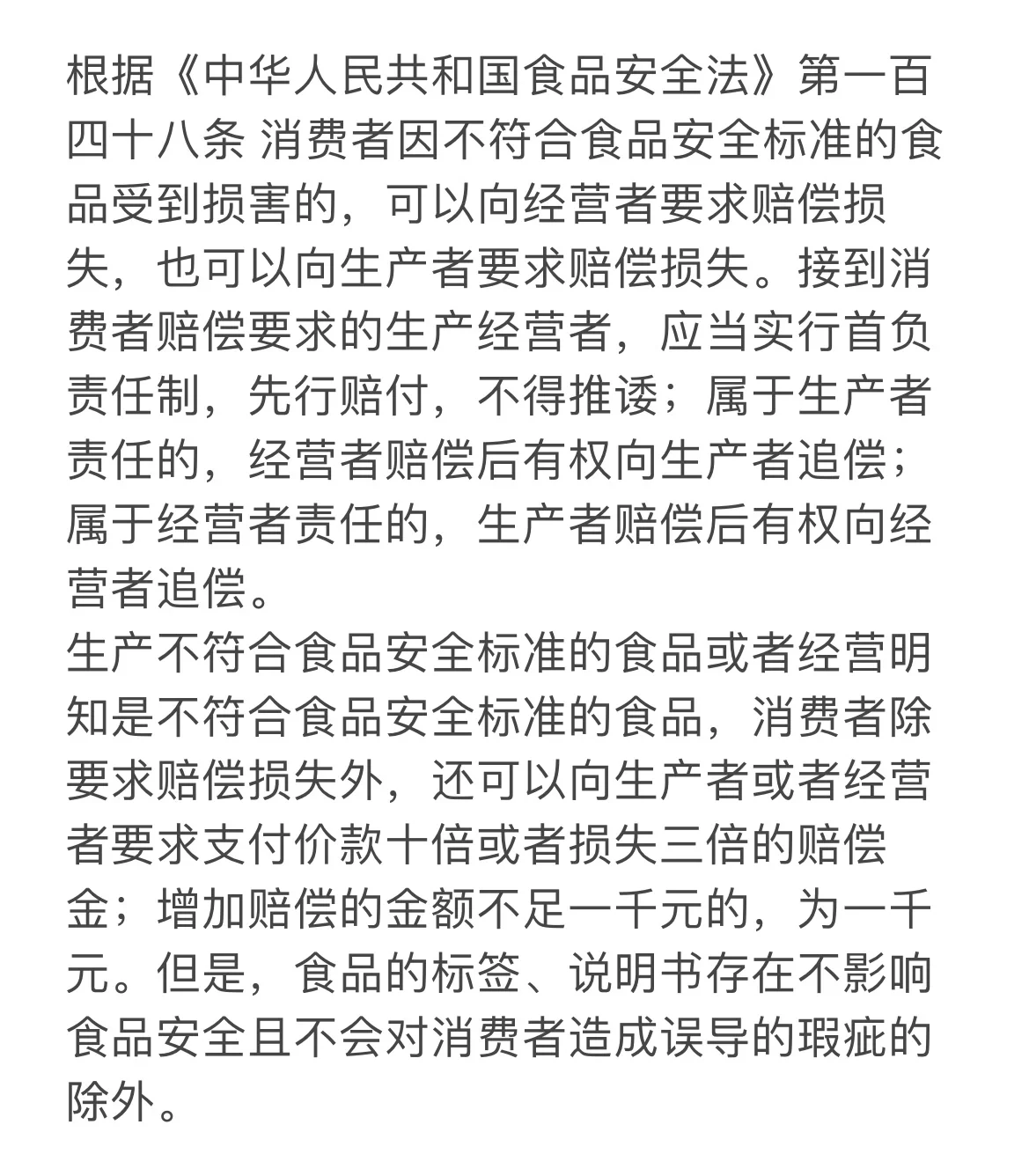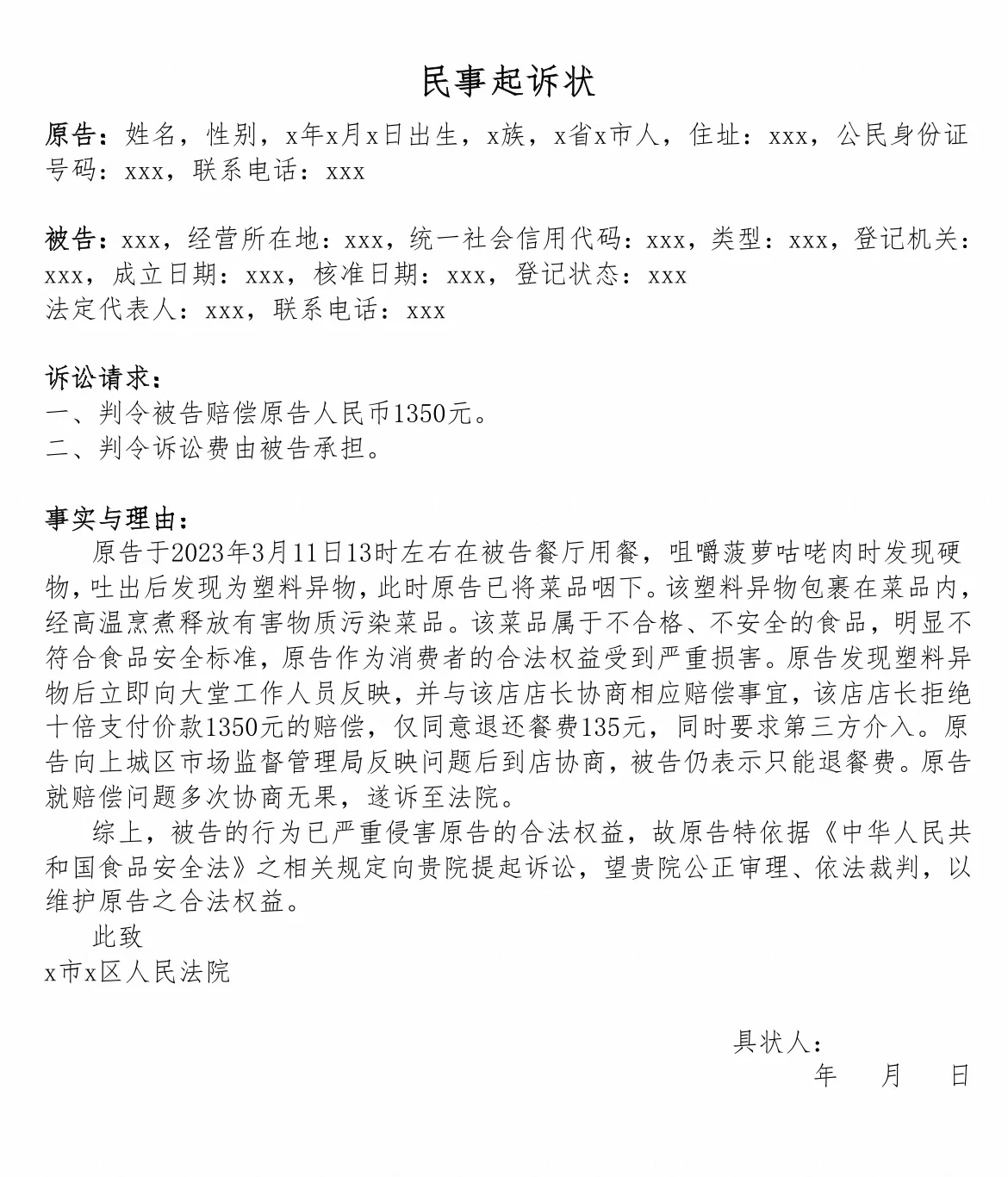 店內(nèi)溝通協(xié)商階段: 1.證書存儲(chǔ)!對(duì)菜肴和異物拍照,拍收據(jù),拍視頻,截圖付款憑證:如果你有水印相機(jī),你可以用它來(lái)證明你確實(shí)在商店里吃過(guò)異物和異物的外觀。永遠(yuǎn)不要讓店主拿走/扔掉異物,最好自己拿走 2.與門店溝通時(shí),錄音錄像:態(tài)度堅(jiān)定,不猶豫,在法律框架內(nèi)表達(dá)訴求,法律依據(jù)如圖1所示。如果商家反駁他們沒有造成損害也沒有賠償,他們應(yīng)該向他們閱讀法律解釋(見圖2) 3.如果協(xié)商不成,拿下店鋪的營(yíng)業(yè)執(zhí)照(后續(xù)訴訟需要營(yíng)業(yè)執(zhí)照),進(jìn)入12315階段 第12315階段: 1.進(jìn)入應(yīng)用程序【國(guó)家12315平臺(tái)】,選擇投訴,并寫下你的訴求(但親自測(cè)試沒有幫助) 起訴階段: 1.在線備案,大家可以自己搜索流程,選擇民事訴訟-餐飲服務(wù)合同糾紛 2.訴訟的模板如圖3所示。企業(yè)注冊(cè)信息可在國(guó)家企業(yè)信用信息公示系統(tǒng)網(wǎng)站www.gsxt.gov.cn上查詢。法定代表人聯(lián)系方式可在洽洽天眼查網(wǎng)站上查詢。證據(jù)清單應(yīng)包括付款記錄、異物照片等 4月13日更新: 法院要求調(diào)解,最初對(duì)方說(shuō)要賠償500,但我不同意,說(shuō)要賠償800。后來(lái),對(duì)方同意了,并收到了這筆錢。我需要去法院提交付款收據(jù)和結(jié)案等后續(xù)事宜。在這個(gè)階段,仍然需要衡量一個(gè)人的心理評(píng)估,如果在隨后的庭審中有任何麻煩,可以像我一樣接受部分賠償(主要感覺這樣更快,庭審可能需要很長(zhǎng)時(shí)間)。如果你不能和對(duì)方相處,繼續(xù)這個(gè)過(guò)程!不要害怕!合理合法的維權(quán)是沒有問(wèn)題的!