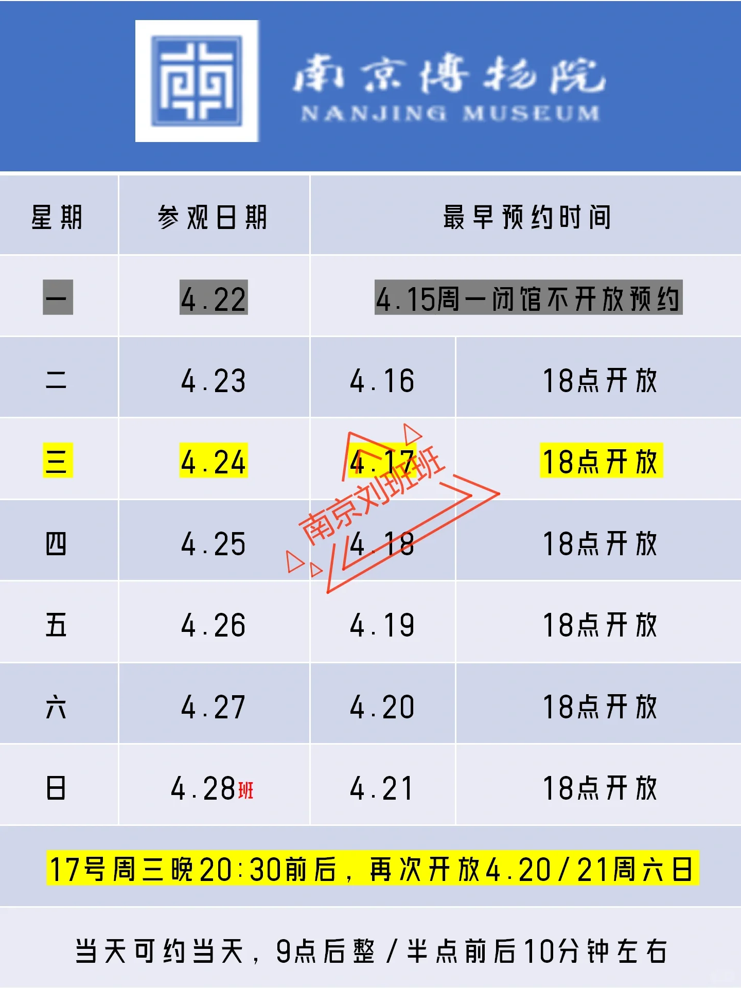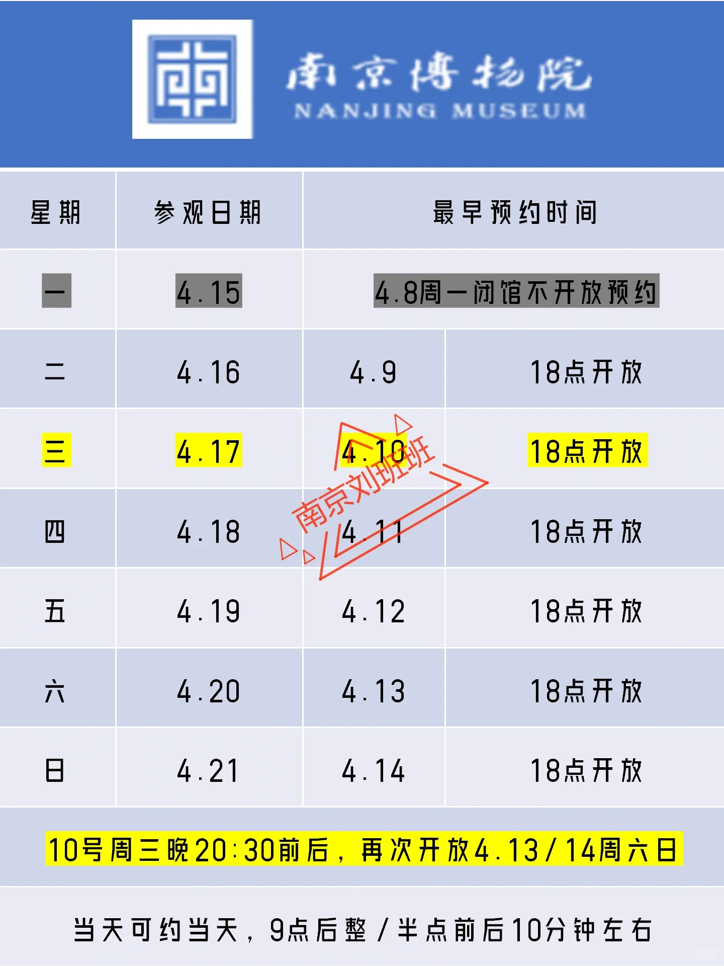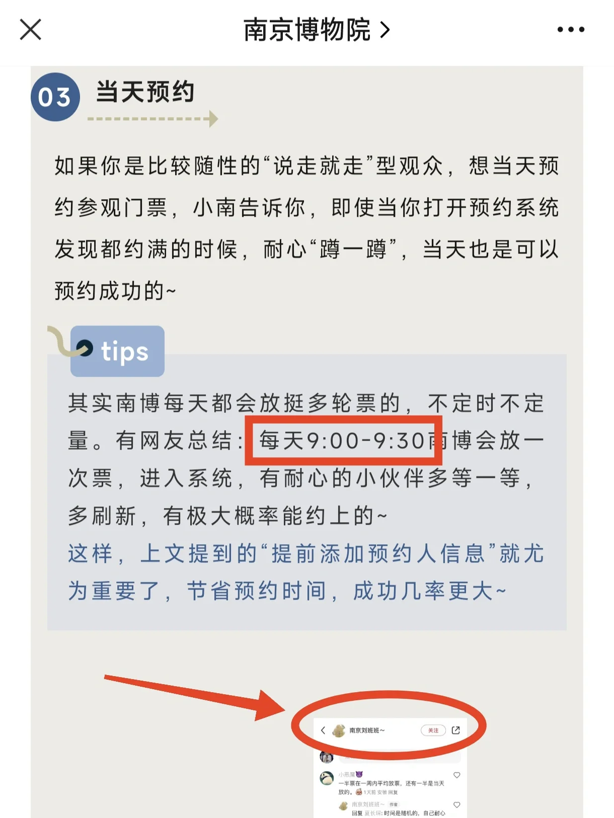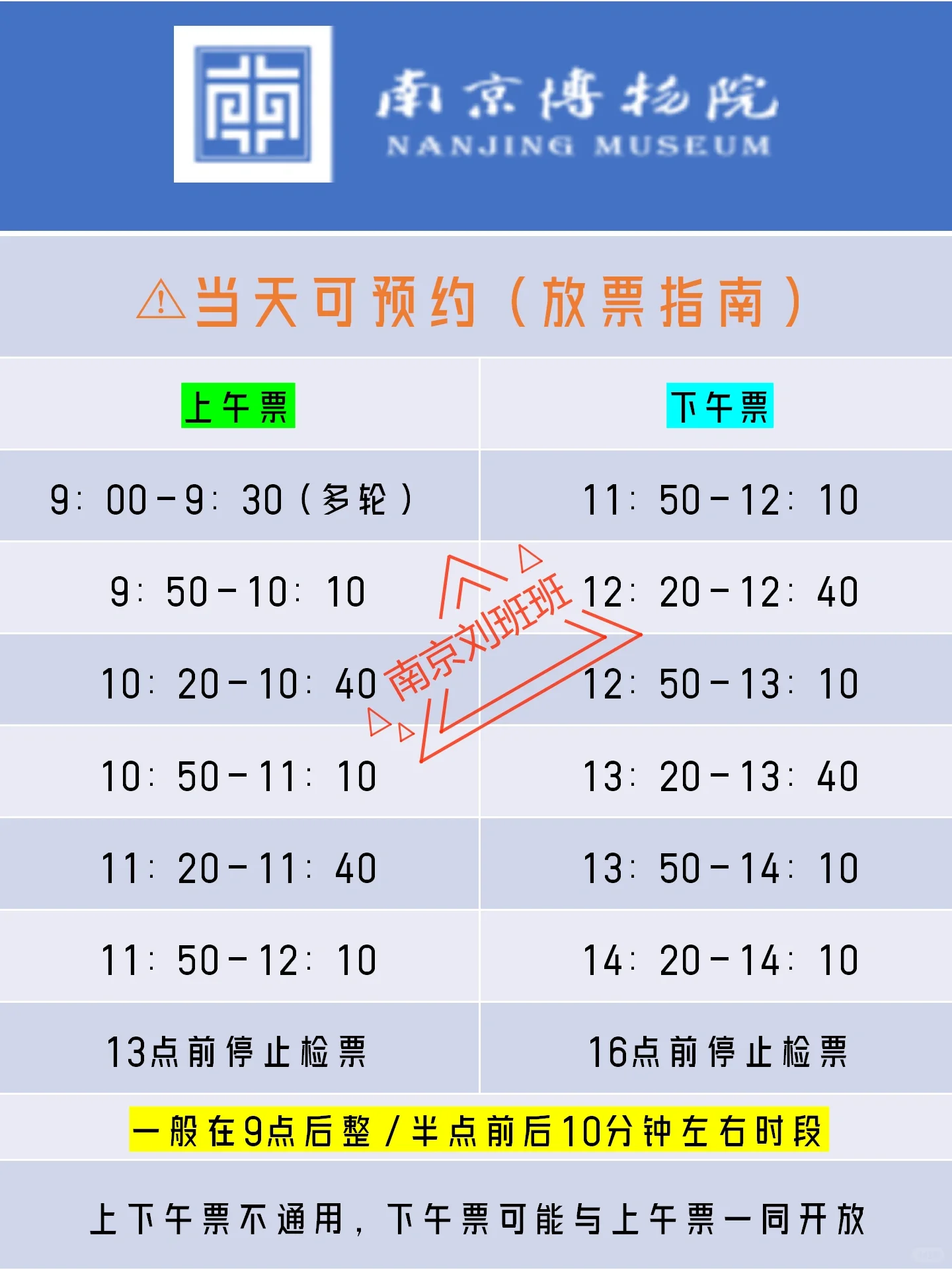 如果南京博物館不提前預(yù)約怎么辦 別擔(dān)心,找吧你不僅要花錢,甚至可能上當(dāng)受騙 今天,潘基文就給大家分享一下南京博物館當(dāng)天的預(yù)約指南 無論是在五一、國慶、春節(jié)等高流量節(jié)日的高峰期,南京博物館都可以在當(dāng)天訂票 請認(rèn)真預(yù)約導(dǎo)游,遵循導(dǎo)游時間和流程。如果你不想更改行程,只需按照計劃前往網(wǎng)站,并在途中按照指南在線刷新預(yù)約即可 [1R]步驟1:提前添加預(yù)約聯(lián)系人(請務(wù)必) 路徑:南京博物館→ 我的→ 我的訂單→ 票務(wù)訂單→ 我的聯(lián)系人→ 添加聯(lián)系人 無論孩子多小,他們都可以用身份證預(yù)訂普通票 孩子沒有身份證,大人和孩子一起訂親子票 第2步:查看預(yù)約時間表 上午的票(有時午餐票會同時放下) ① 9點到9點30分將有多輪比賽,重點關(guān)注 ② 9:50~10:10 ③ 10:20-10:40 ④ 10:50-11:10 ⑤ 11:20-11:40 下午票 ① 11:50~12:10 ② 11:50~12:10 ③ 12:20~12:40 ④ 12:50~13:10 ⑤ 13:20~13:40 ⑥ 13:50~14:10 ⑦ 14:20~14:40 ⑧ 14:50~15:10 ⑨ 15:20~15:40 僅供參考,視實際情況而定,如有變動 以上是正常的出票期。如果你不確定當(dāng)天是否會出票,你可以根據(jù)引導(dǎo)期刷引導(dǎo),看看當(dāng)天是否會開票 [三個R]步驟3:刷新約會 重復(fù)刷新,可以有各種刷新方式,但建議在【普通票/親子票】和【日歷】界面中重復(fù)切換刷新,因為一般更容易刷新。如果出現(xiàn)【今日】,請立即按照正常的預(yù)訂流程進行預(yù)訂 門票一次發(fā)行一輪。建議選擇一個時間段進行更多刷新,否則本輪可能已經(jīng)出票了,有可能超過十分鐘都無法刷新,浪費時間 如果您對當(dāng)天預(yù)約沒有信心,建議提前預(yù)約 [1R]最早任命: 提前7天18:00預(yù)約,周六18:00預(yù)約下周六,以此類推 [2R]周三預(yù)約: 周三晚上,推特通常在20:30左右發(fā)布,然后是周六和周日的門票。張貼時間通常在20:00到21:30之間。建議提前遵循 【三個R】其他時間段: 偶爾,門票會提前發(fā)布,比如11:30、15:30等,但沒有明確的模式,而且很隨機,所以我們只能心存僥幸 南京博物館真的很容易安排。我仔細閱讀了指南,可以耐心地預(yù)約。每個人真的不需要花錢找人預(yù)約,而且官方一直在更新預(yù)約規(guī)則,從設(shè)置黑名單到修改和鎖定聯(lián)系人,再到7天內(nèi)只預(yù)約兩次。就這些在斗智斗勇中,每個人都不應(yīng)該再鼓勵他們了