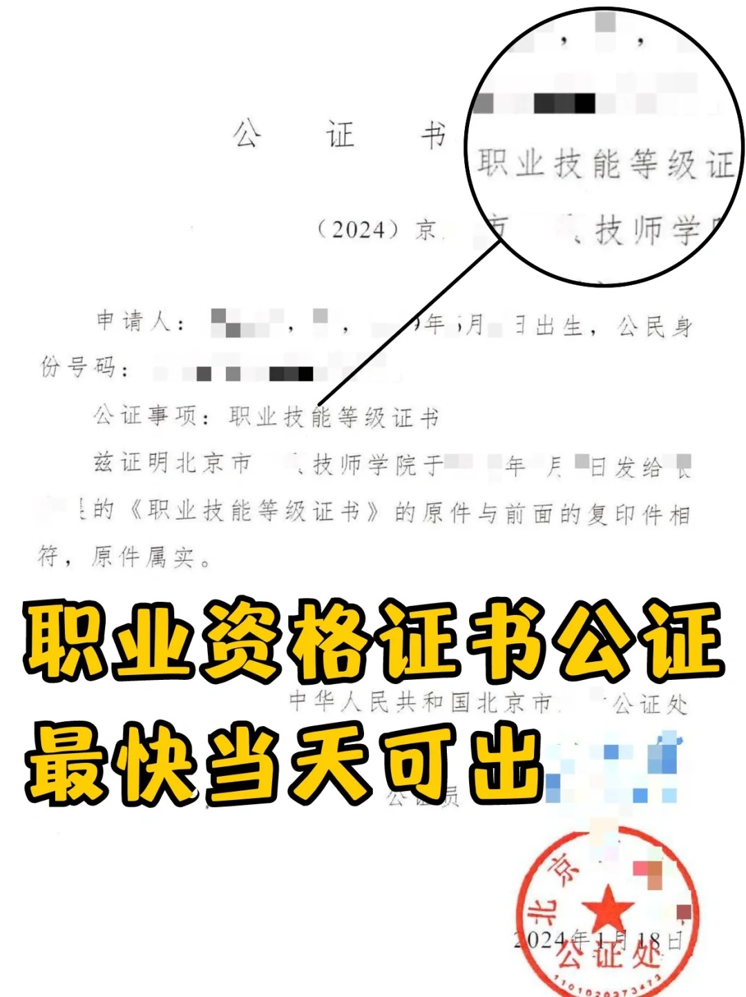 職業(yè)資格(職業(yè)技能)證書是表明我們具有從事某一職業(yè)所必備的學(xué)識(shí)和技能的證明。 它是我們求職、任職、開業(yè)的資格憑證,也是用人單位招聘、錄用勞動(dòng)者的主要依據(jù),更是境外就業(yè)、對(duì)外勞務(wù)合作人員辦理技能水平公證的有效證件。 它與學(xué)歷文憑不同,畢竟學(xué)歷文憑主要反映學(xué)生學(xué)習(xí)的經(jīng)歷,是文化理論知識(shí)水平的證明。 職業(yè)資格證書公證指的是公證處根據(jù)你的申請(qǐng),依法對(duì)你所持有的職業(yè)資格證書的真實(shí)性予以證明的活動(dòng)。 職業(yè)資格證書公證辦理所需材料: 申請(qǐng)人的身份證原件; 申請(qǐng)人的戶口簿,集體戶籍的申請(qǐng)人提供《常住人口登記卡》本人頁(yè)原件及經(jīng)過(guò)戶籍所在單位蓋章的首頁(yè)復(fù)印件; 申請(qǐng)人的職業(yè)資格證書,比如法律職業(yè)資格證書、注冊(cè)會(huì)計(jì)師證、金融許可證、建筑業(yè)企業(yè)資格證書等等 證書頒發(fā)部門出具的輔助證明及申請(qǐng)人的工作單位或人事檔案部門出具的相關(guān)證明。 公證員的要求其他補(bǔ)充證明材料。 職業(yè)資格證書公證可以全程線上辦理,不用本人到場(chǎng),人到國(guó)外都能辦,3-5個(gè)工作日就能出件,加急一天也能出!