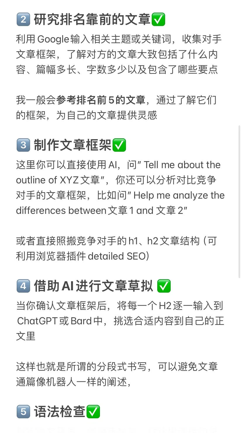 你還想了解更多關(guān)于SEO和數(shù)字營銷的信息嗎 關(guān)注我或加入SEO群聊。期待與您討論和學(xué)習(xí) 今天,我們來談?wù)勈褂萌斯ぶ悄茏珜懜哔|(zhì)量文章的簡單6步過程? 一?? 文章選題 在這里,你可以使用人工智能工具,例如“在“你的領(lǐng)域”的主要類別下,給我30個相關(guān)但獨(dú)特的話題” 然后,可以創(chuàng)建與主題相關(guān)的其他關(guān)鍵字列表 例如,輸入“給我10個不同的“你的主題”關(guān)鍵字變體,以解決不同的搜索意圖” 當(dāng)然,你也可以選擇使用SEO工具進(jìn)行文章選題和關(guān)鍵詞研究的傳統(tǒng)方法 - 二?? 研究中排名靠前的文章 使用谷歌輸入相關(guān)主題或關(guān)鍵詞,收集對手文章的框架,了解他們的文章大致包括哪些內(nèi)容、長度、字?jǐn)?shù)和要點(diǎn) 我通常參考前5篇文章 - 三?? 創(chuàng)建文章框架 你可以直接在這里使用人工智能,然后問“告訴我XYZ文章的大綱”。你也可以分析和比較競爭對手的文章框架,比如問“幫我分析文章1和文章2的區(qū)別” 或者簡單地復(fù)制競爭對手的h1和h2文章的結(jié)構(gòu)(可以使用瀏覽器插件使用詳細(xì)的SEO) - 四?? 使用AI進(jìn)行文章起草 在確認(rèn)文章的框架后,將每個H2逐一輸入到ChatGPT或Bard中,并在自己的正文中選擇適當(dāng)?shù)膬?nèi)容 - 五?? 語法檢查 文章寫完后,進(jìn)行語法檢查。我在這里用Grammarly - 六?? 整體調(diào)整和發(fā)布 在使用ChapGPT生成適當(dāng)?shù)膬?nèi)容后,檢查關(guān)鍵詞的植入、內(nèi)部和外部鏈接的錨文本注釋、確保文章的個性化(尤其是第二人稱的使用)、行動呼吁等 最后,將新生成的URL輸入到谷歌搜索控制臺中進(jìn)行索引應(yīng)用,即可等待結(jié)果 同時,你也可以關(guān)注我或加入SEO群聊。期待與您討論和學(xué)習(xí)