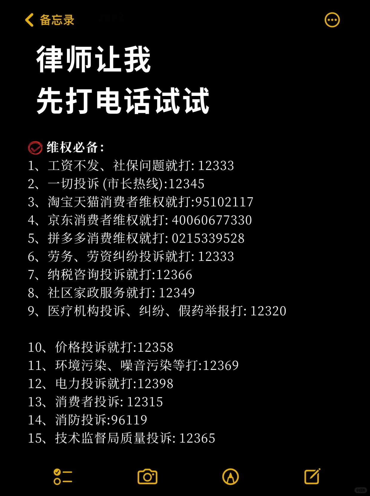 權(quán)利保護(hù)至關(guān)重要: 如果沒有工資或社會保障問題,請撥打12333 所有投訴(市長熱線):12345 淘寶、天貓消費者維權(quán)電話:95102117 京東消費者維權(quán)電話:40060677330 拼多多消費者維權(quán)電話:0215339528 勞動爭議投訴請撥打12333 稅務(wù)咨詢投訴請撥打12366 社區(qū)家政服務(wù)熱線:12349 醫(yī)療機(jī)構(gòu)投訴、糾紛、假藥舉報:12320 價格投訴:12358 環(huán)境污染、噪聲污染等打?。?2369 如有電力投訴,請撥打12398 消費者投訴:12315 火災(zāi)投訴:96119 技術(shù)監(jiān)督局質(zhì)量投訴:12365 公共衛(wèi)生監(jiān)督:12320 電信投訴:12300 法律援助:12348 婦女權(quán)利保護(hù):12338 農(nóng)民工維權(quán):12333 國家煙草局投訴:96300 城建服務(wù)熱線:12319 全國公安機(jī)關(guān)舉報電話及互聯(lián)網(wǎng)舉報平臺:12389 全國法院訴訟服務(wù)熱線:12368 國土資源局設(shè)立的違法土地礦產(chǎn)活動舉報投訴熱線是12336 互聯(lián)網(wǎng)違法不良信息舉報中心:12377 國家紀(jì)檢監(jiān)察機(jī)關(guān):12388 工業(yè)和信息化部:12321