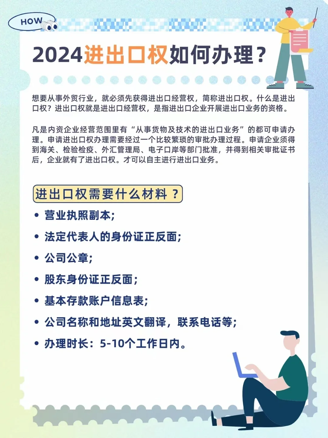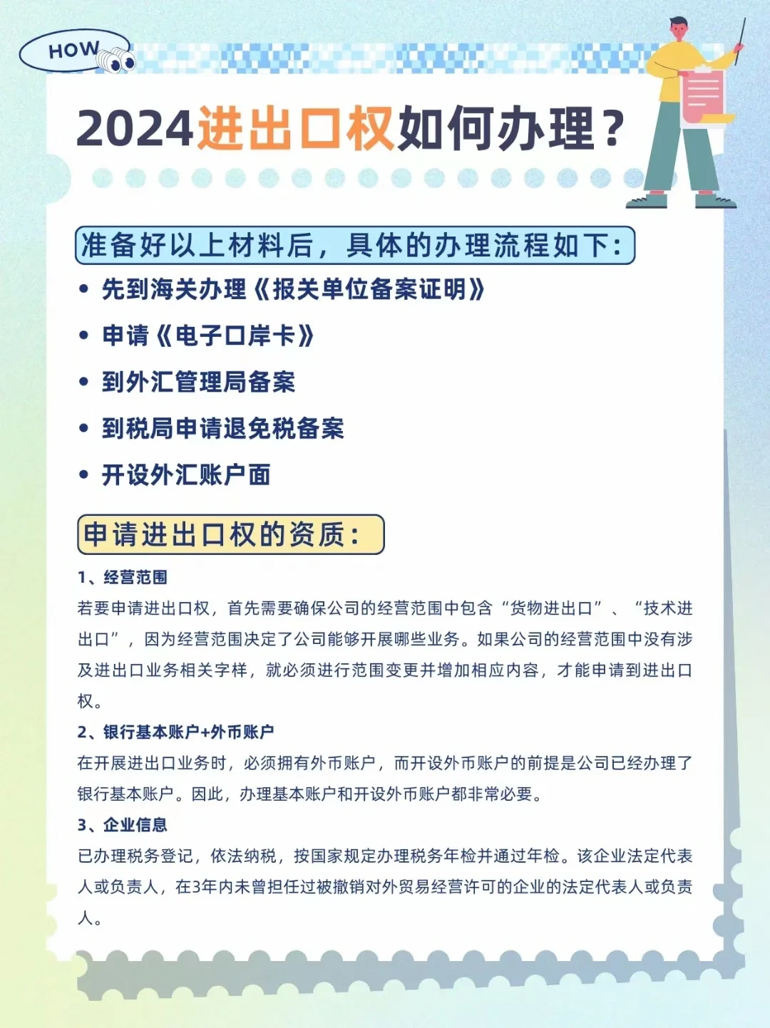 隨著進出口貿(mào)易的不斷擴大,申請進出口權(quán)資格的需求也在增加。啟業(yè)邦將與您分享申請進出口權(quán)和資質(zhì)的全過程和詳細信息! 申請進出口權(quán)所需的文件: ① 營業(yè)執(zhí)照原件; ② 公章和法定代表人印章; ③ 法定代表人身份證復印件及正反面照片; ④ 公司英文名稱、營業(yè)地點和注冊英文地址、聯(lián)系電話、傳真號、電子郵件地址; 申請進出口經(jīng)營權(quán)沒有特殊條件,幾乎所有類型的公司都可以申請,無論注冊資本或年銷售收入如何 大小小規(guī)模納稅人也可以處理(但如果涉及出口退稅,他們需要成為普通納稅人)。 注意要點:申請進出口權(quán)的企業(yè)經(jīng)營范圍必須包括貨物進出口范圍。如果沒有這樣的范圍,則需要首先申請工商變更,增加“貨物進出口、技術(shù)進出口和代理進出口”。 申請啤酒進出口權(quán)的過程R: 在商務(wù)局注冊; 通過海關(guān)登記注冊獲得進出口代碼; 電子口岸備案,部門數(shù)據(jù)聯(lián)網(wǎng); 國家管理局的賬戶開立許可證和出口備案。 處理后獲得的信息: 在全面了解后,完成申請后將獲得以下信息: (1) 對外貿(mào)易登記表 (2) 海關(guān)證明(即報關(guān)單位登記證) (3) 自助檢驗證書(即:出入境檢驗檢疫企業(yè)登記表) (4) 向國家管理局備案(即開通貨物貿(mào)易管理網(wǎng)上業(yè)務(wù)、賬戶信息) (5) 電子端口設(shè)備(法定代表人卡、操作員卡、讀卡器) (6) 報關(guān)章