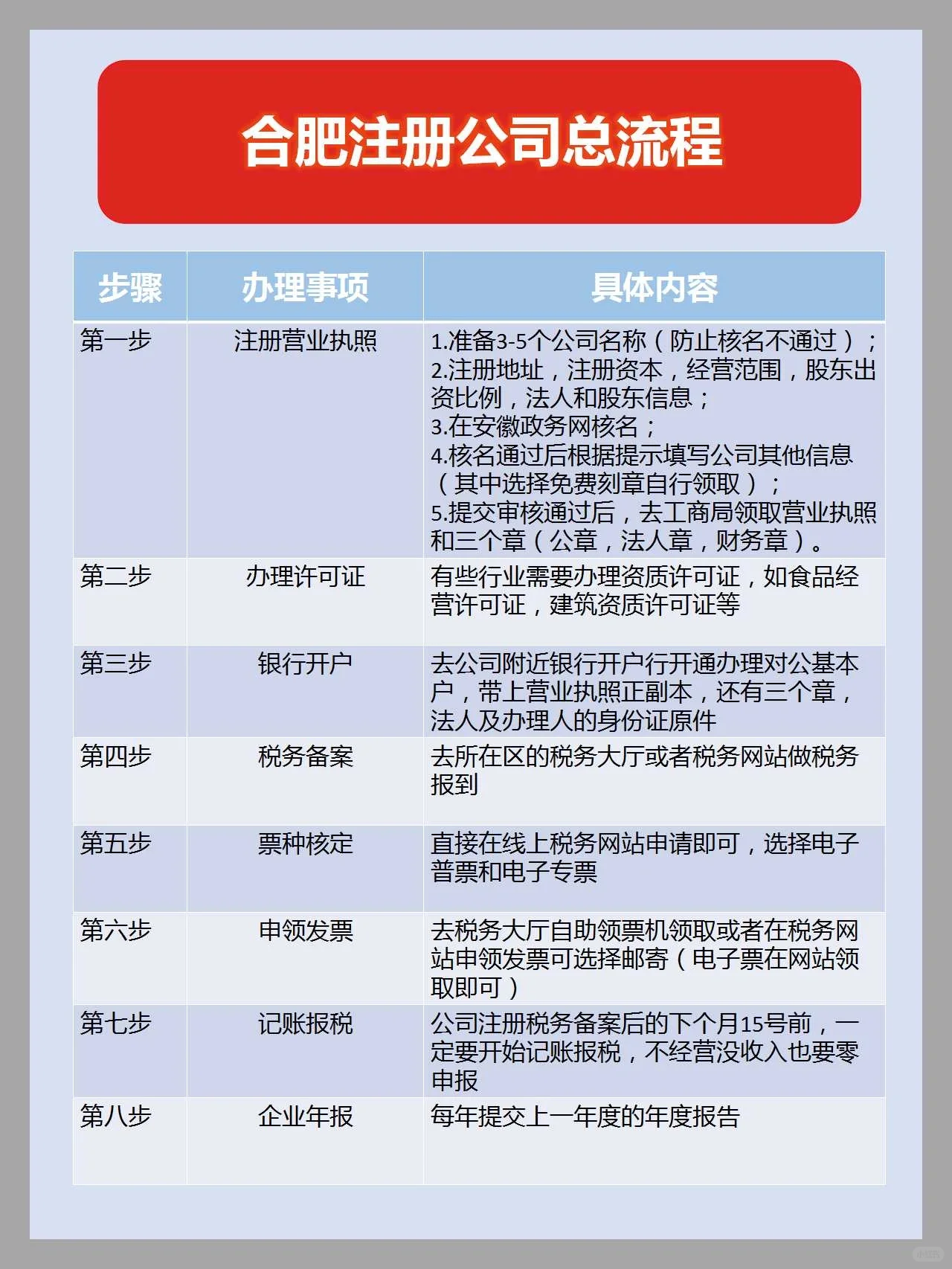 1、 注冊(cè)營(yíng)業(yè)執(zhí)照 提前準(zhǔn)備公司注冊(cè)材料,包括3-5個(gè)公司名稱(chēng)和注冊(cè)地點(diǎn) 地址、注冊(cè)資本、經(jīng)營(yíng)范圍、股東出資比例、股東 任職信息、法定代表人、監(jiān)事、股東身份信息等 這些信息需要首先在線驗(yàn)證。姓名驗(yàn)證通過(guò)后,即可在線提交注冊(cè)材料,并可選擇免費(fèi)蓋章。等待審查。審核通過(guò)后,到工商局領(lǐng)取營(yíng)業(yè)執(zhí)照。然后,拿著營(yíng)業(yè)執(zhí)照原件和代理人的身份證原件到柜臺(tái)領(lǐng)取三張郵票。 2、 申請(qǐng)資質(zhì)許可證 如果是預(yù)批準(zhǔn),則需要在注冊(cè)營(yíng)業(yè)執(zhí)照之前進(jìn)行預(yù)批準(zhǔn) 申請(qǐng)?jiān)S可證,如果是審批后流程,則必須在注冊(cè)后完成 并不是所有行業(yè)的公司都需要在獲得營(yíng)業(yè)執(zhí)照后申請(qǐng)營(yíng)業(yè)執(zhí)照 申請(qǐng)資格證書(shū)。 3、 納稅申報(bào) 納稅申報(bào)可以在線或離線進(jìn)行。 4、 銀行對(duì)公賬戶(hù)開(kāi)立 與開(kāi)戶(hù)銀行預(yù)約,一些銀行工作人員可能需要到他們家門(mén)口與法定代表人合影, 核實(shí)公司地址,批準(zhǔn)后攜帶營(yíng)業(yè)執(zhí)照正本和副本 應(yīng)將刻好的印章和法定代表人的身份證原件發(fā)送至開(kāi)戶(hù)行開(kāi)立公司銀行賬戶(hù)(基本賬戶(hù)),用于支付工資和申請(qǐng)公司卡。 5、 票證類(lèi)型驗(yàn)證 在線驗(yàn)證稅款類(lèi)型,并確定公司需要報(bào)告哪些稅款。 企業(yè)一般需要申報(bào)的稅種包括增值稅、附加稅和企業(yè)稅 企業(yè)所得稅和個(gè)人所得稅。 6、 申請(qǐng)發(fā)票 業(yè)務(wù)操作生成的業(yè)務(wù)需要開(kāi)具發(fā)票,因此需要應(yīng)用程序 稅務(wù)控制盤(pán),然后學(xué)習(xí)如何使用,并將信息帶到稅務(wù)局 填寫(xiě)表格后到稅務(wù)局領(lǐng)取稅控盤(pán)或英國(guó)。到合肥稅務(wù)局申請(qǐng)發(fā)票:電子發(fā)票、普通發(fā)票、專(zhuān)用發(fā)票。公司的業(yè)務(wù)生成后,將開(kāi)具發(fā)票。今年12月,合肥市也開(kāi)始實(shí)施數(shù)字化開(kāi)票。 7、 會(huì)計(jì)和稅務(wù)報(bào)告 在合肥市完成公司登記后的次月15日前,必須開(kāi)始會(huì)計(jì)和納稅申報(bào)。如果沒(méi)有操作,則還必須進(jìn)行零聲明。此后,你必須每月按時(shí)記賬并報(bào)稅。如果沒(méi)有按時(shí)記賬 申報(bào)稅款被視為違法行為,稅務(wù)機(jī)關(guān)可能會(huì)處以罰款。 8、 企業(yè)年度報(bào)告 合肥公司必須自成立之日起2個(gè)月內(nèi)提交上一次申請(qǐng) 自然年的年度報(bào)告。公司在合肥的注冊(cè)已經(jīng)完成,無(wú)論是否 沒(méi)有運(yùn)營(yíng),只要成立一年,就必須提交上一年的運(yùn)營(yíng) 商業(yè)年度報(bào)告。如果年度報(bào)告沒(méi)有按時(shí)提交,它將被納入經(jīng)濟(jì) 異常操作列表。